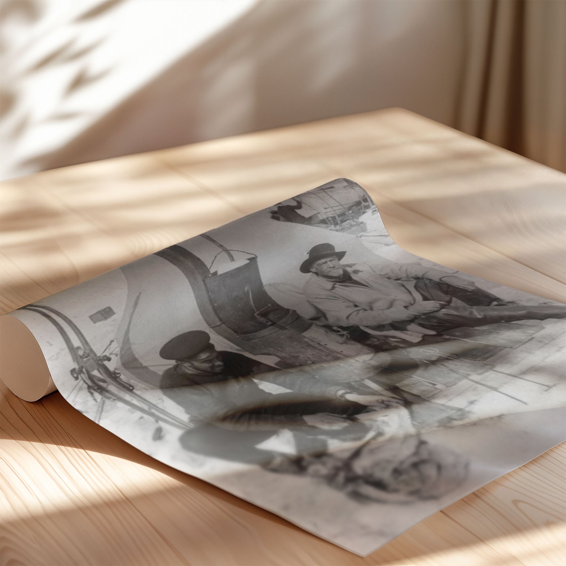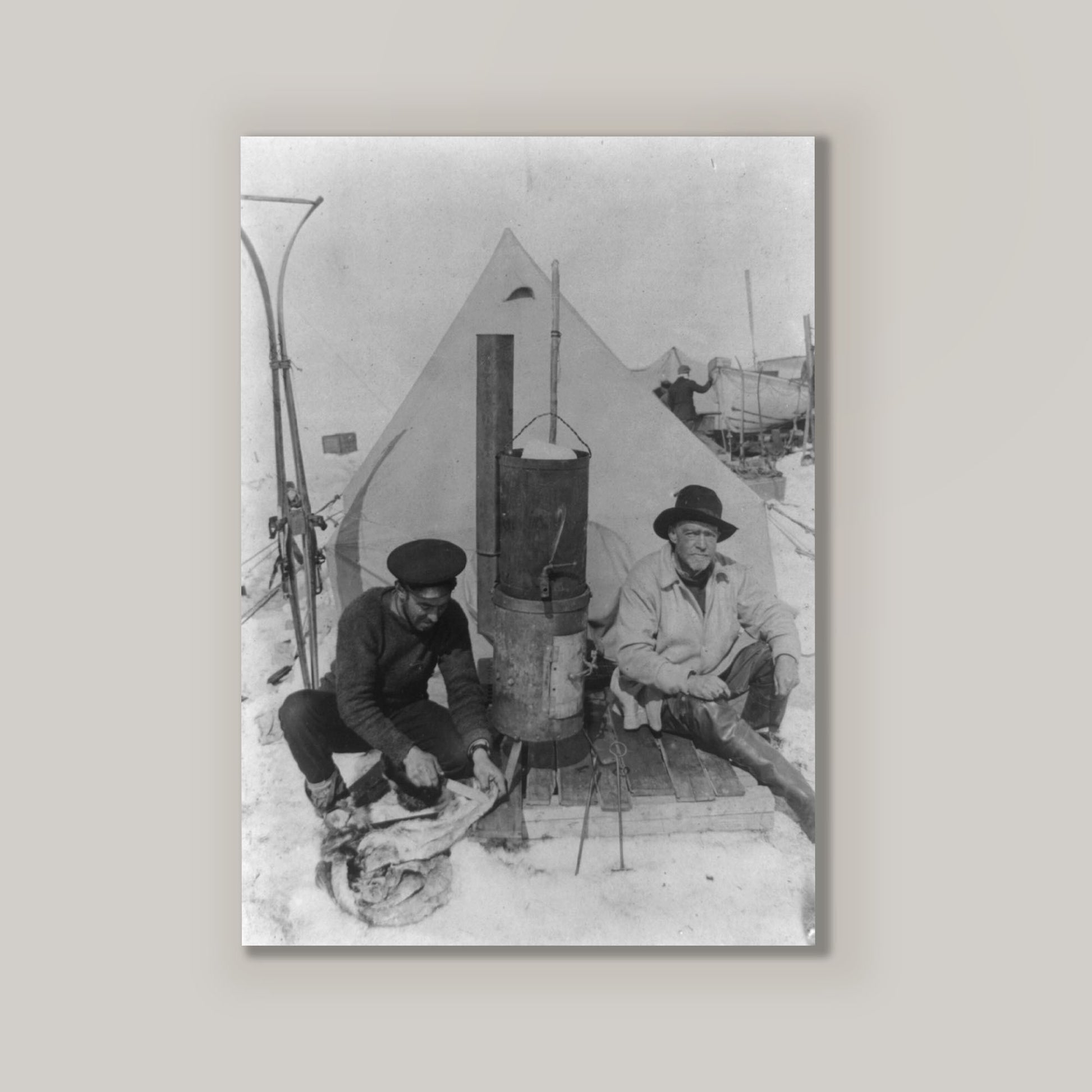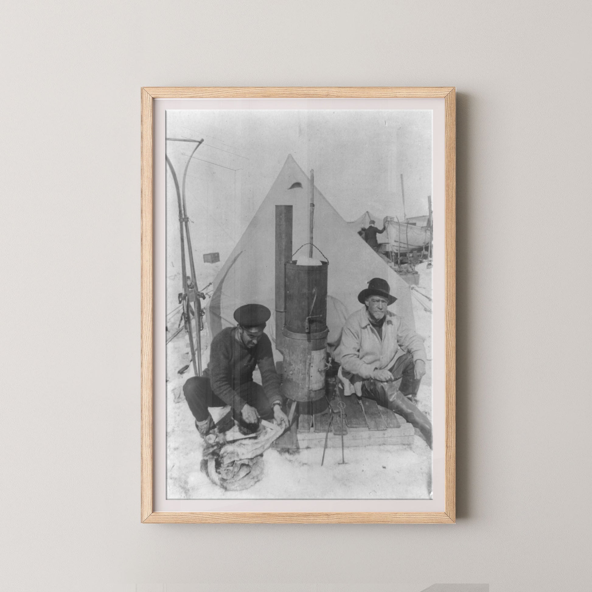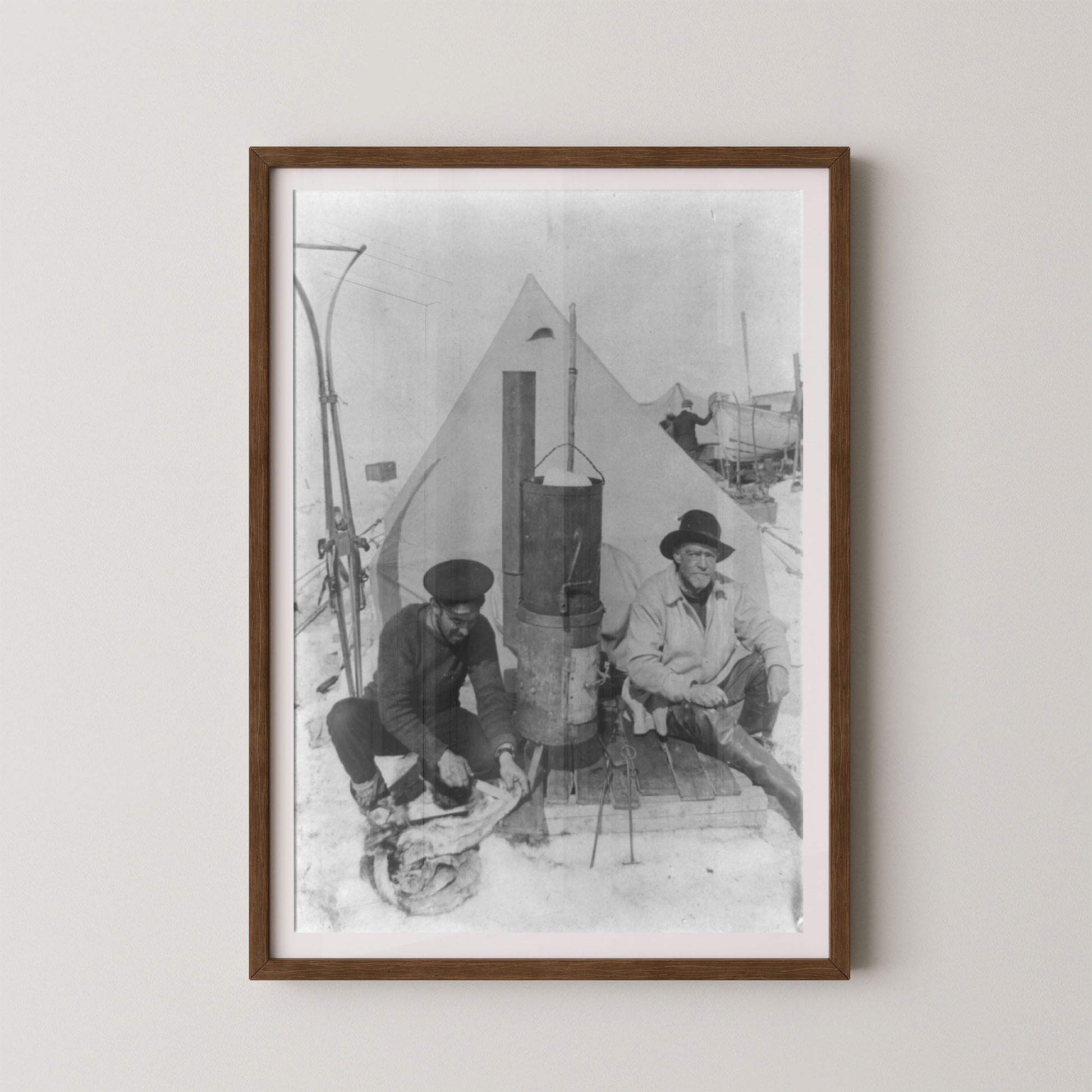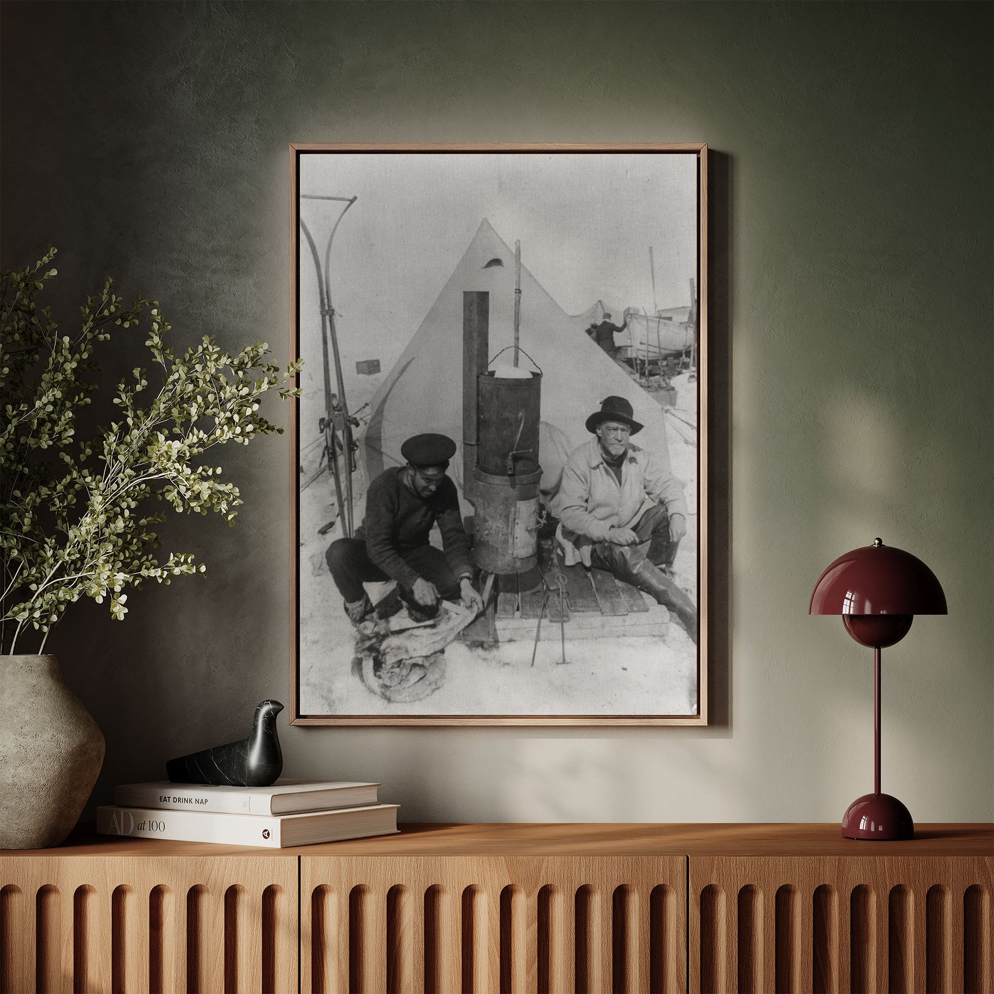 Capture the rugged spirit of adventure with At Camp, a timeless black-and-white photograph that tells the story of endurance, exploration, and camaraderie. Set against a stark winter landscape, this striking image embodies the grit and quiet resilience of life lived on the edge of the elements — a visual ode to courage and connection.