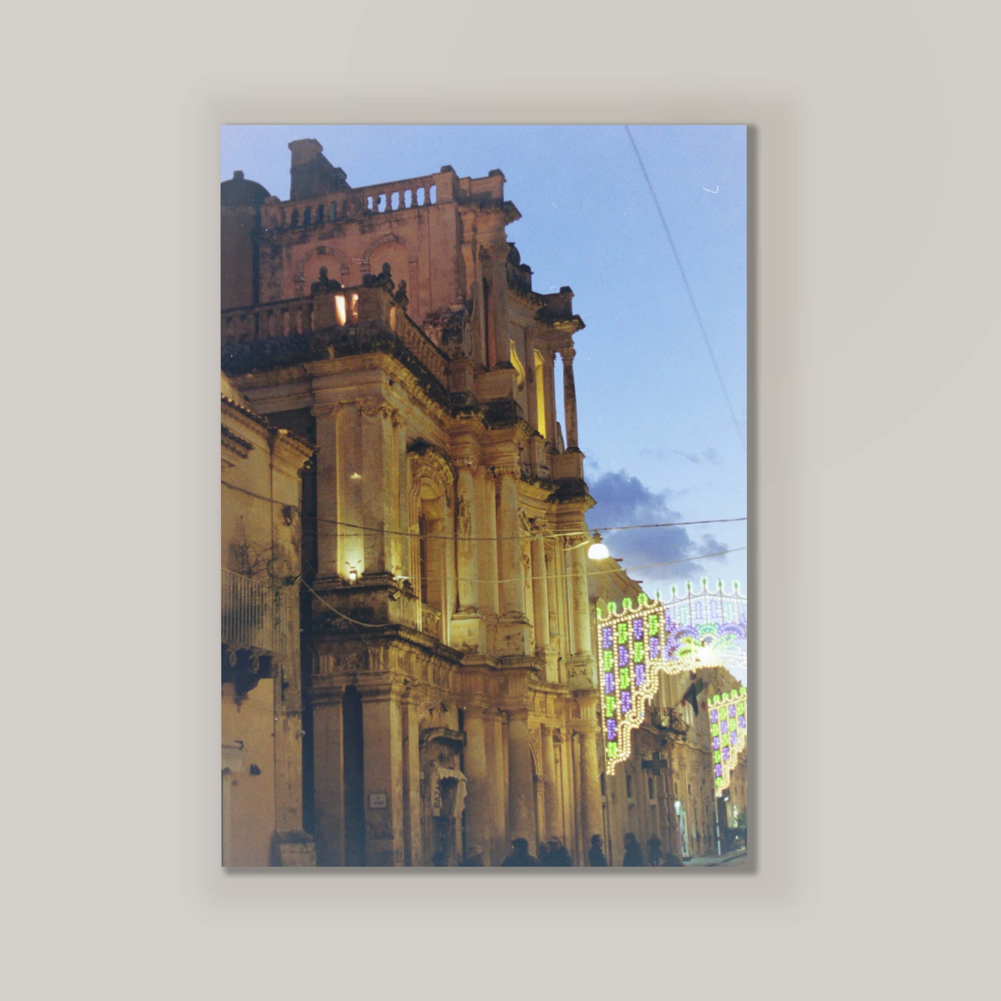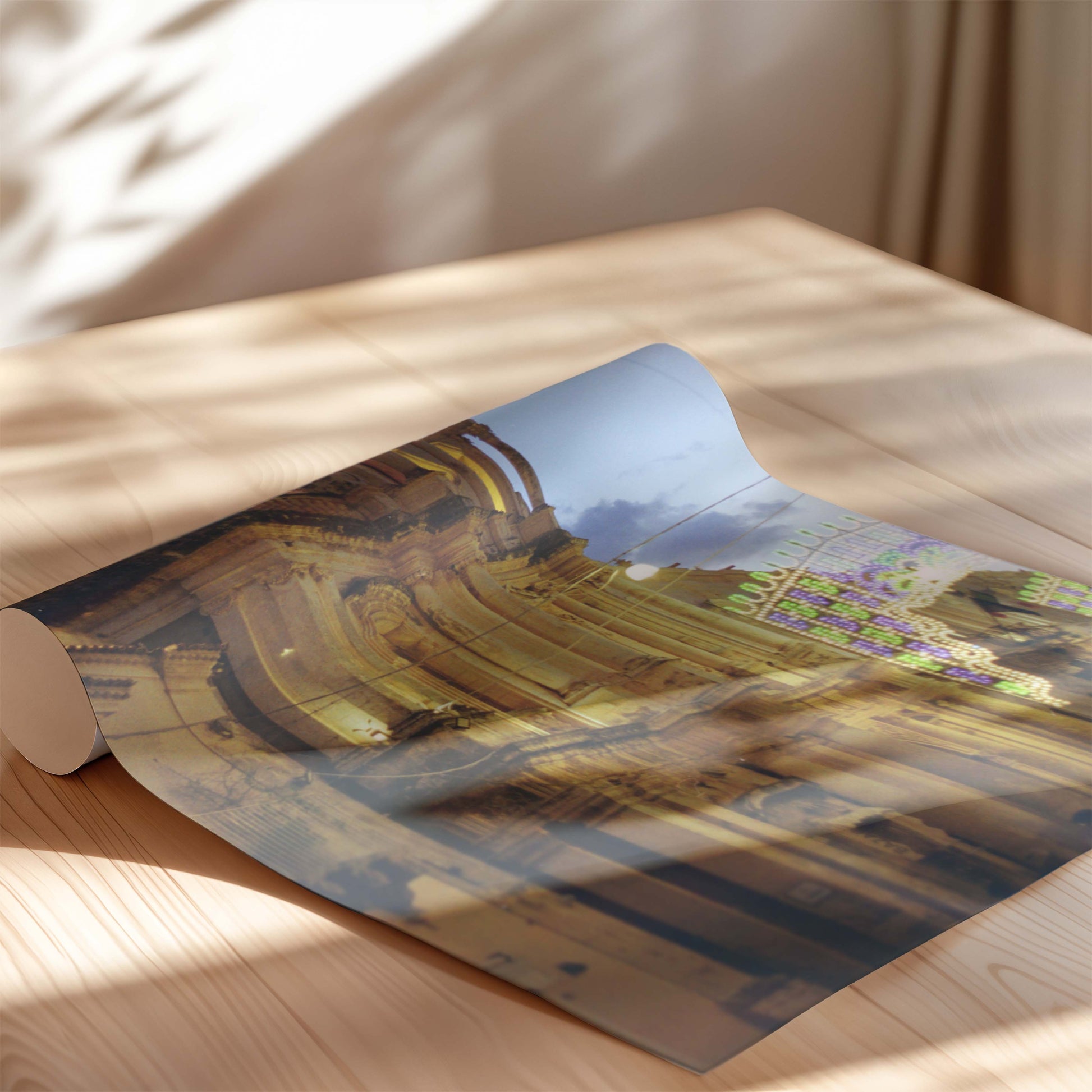 Step into the magic of a festival night with "Carnevale Eve," a beautifully atmospheric photograph capturing the golden glow of a historic city street, just as colorful lights begin to sparkle against the evening sky. The grandeur of aged stone architecture and the festive arches of light create a feeling of quiet anticipation and timeless wonder.