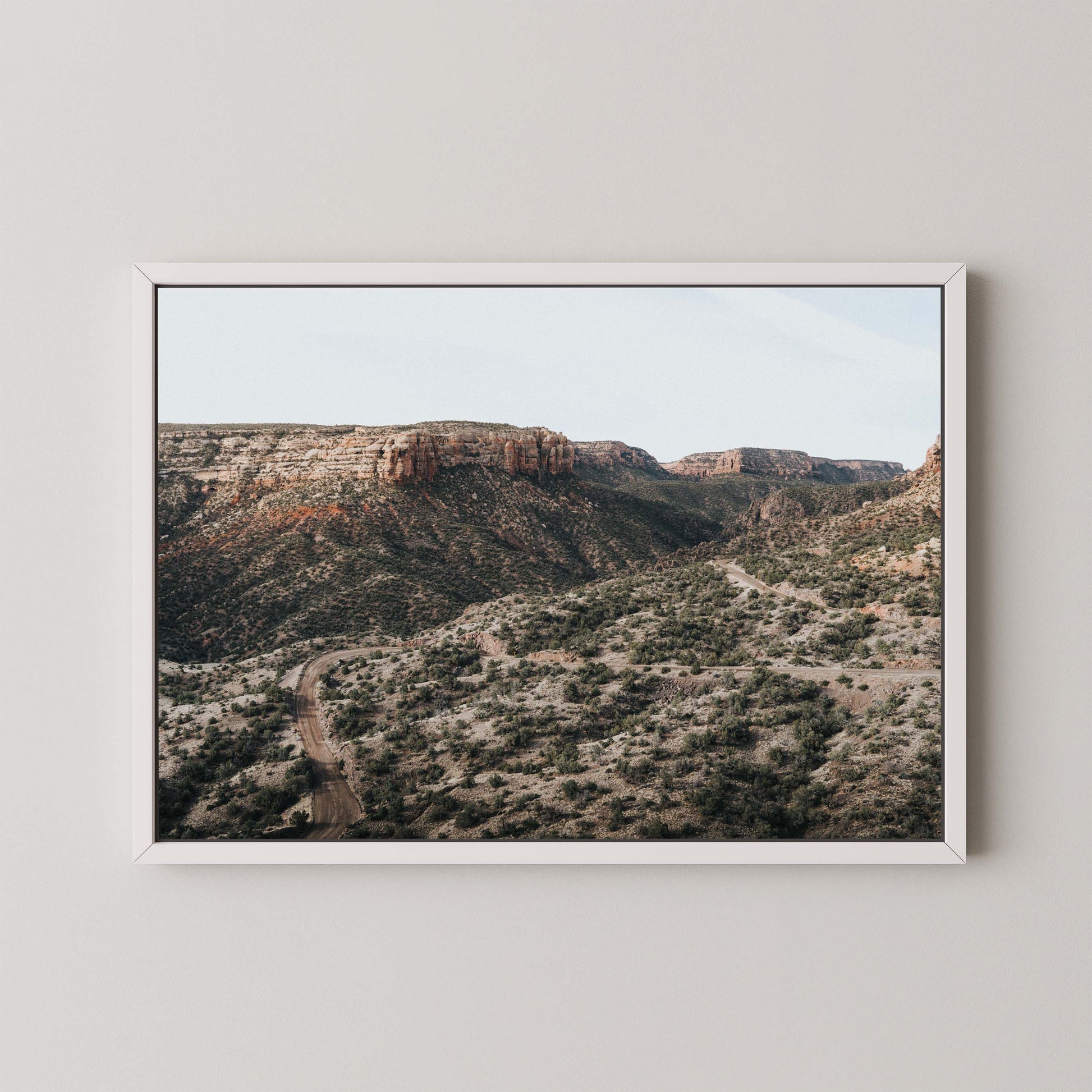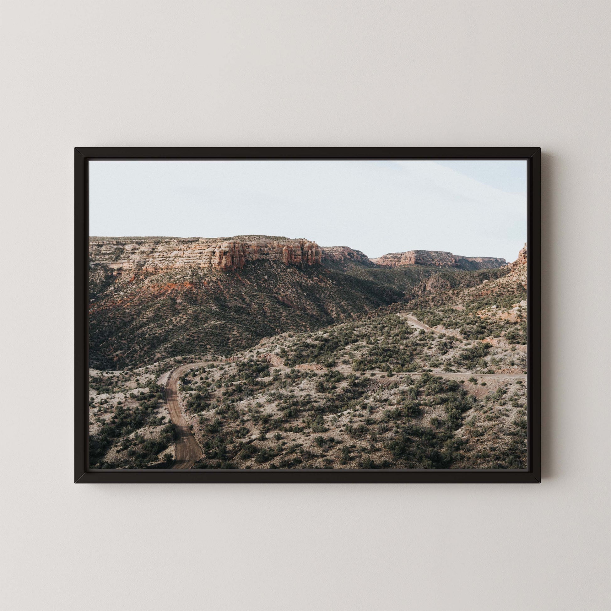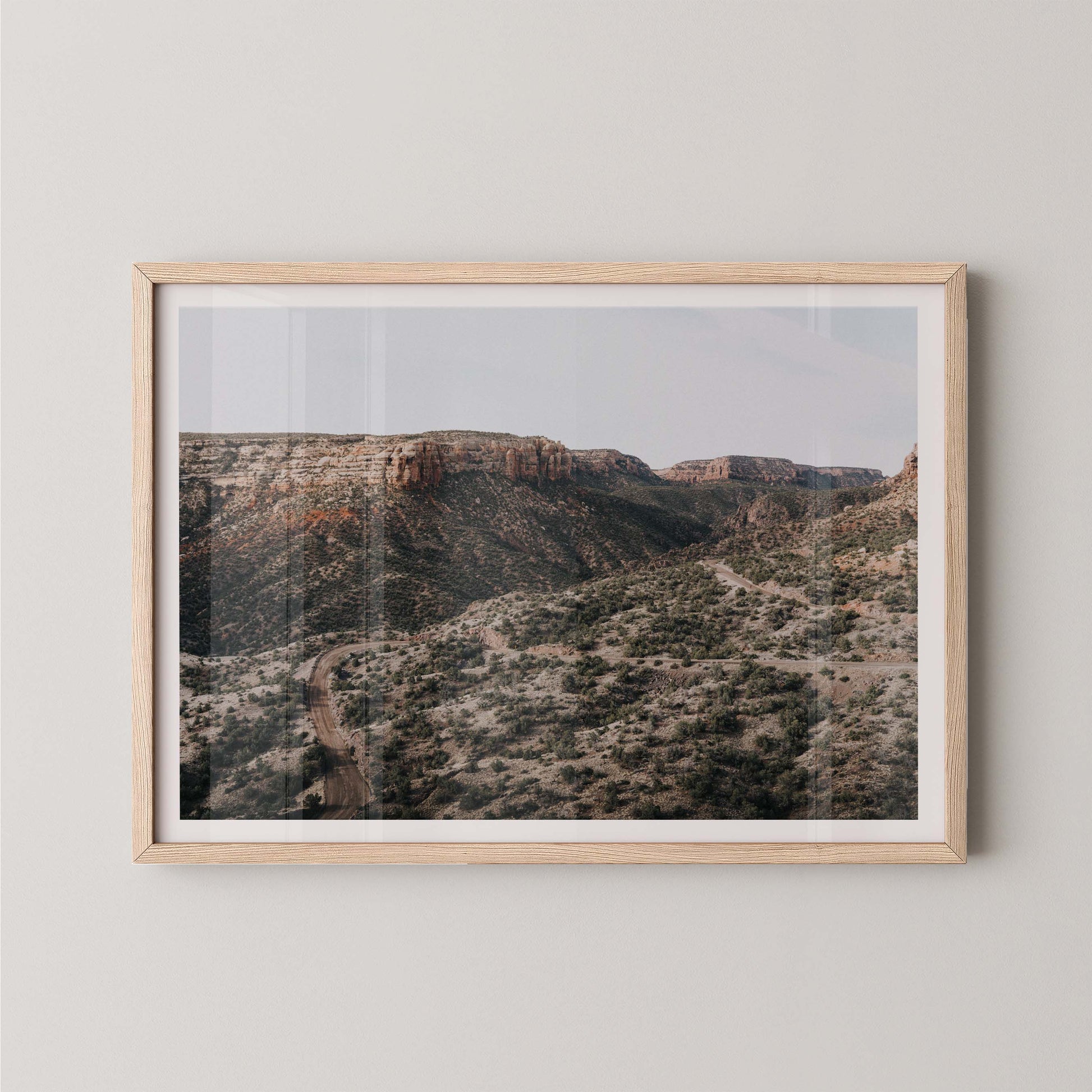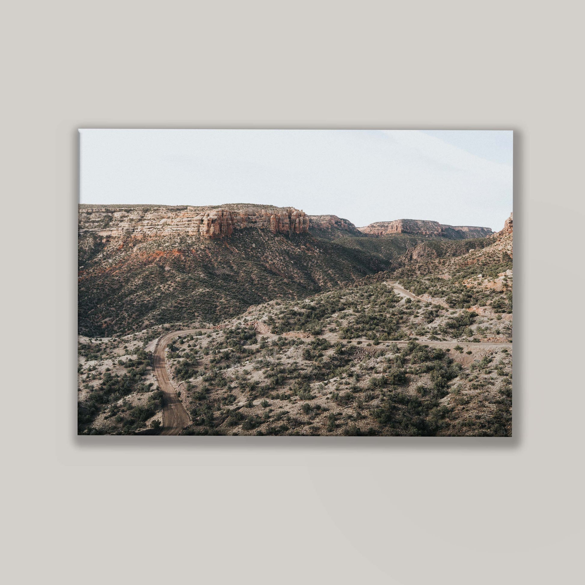 "Desert Vista II" captures a winding dirt road cutting through rugged terrain beneath sunlit cliffs. With its sweeping views and layers of color and texture, this piece celebrates the raw, untamed beauty of the American Southwest. It’s a scene of both solitude and adventure.