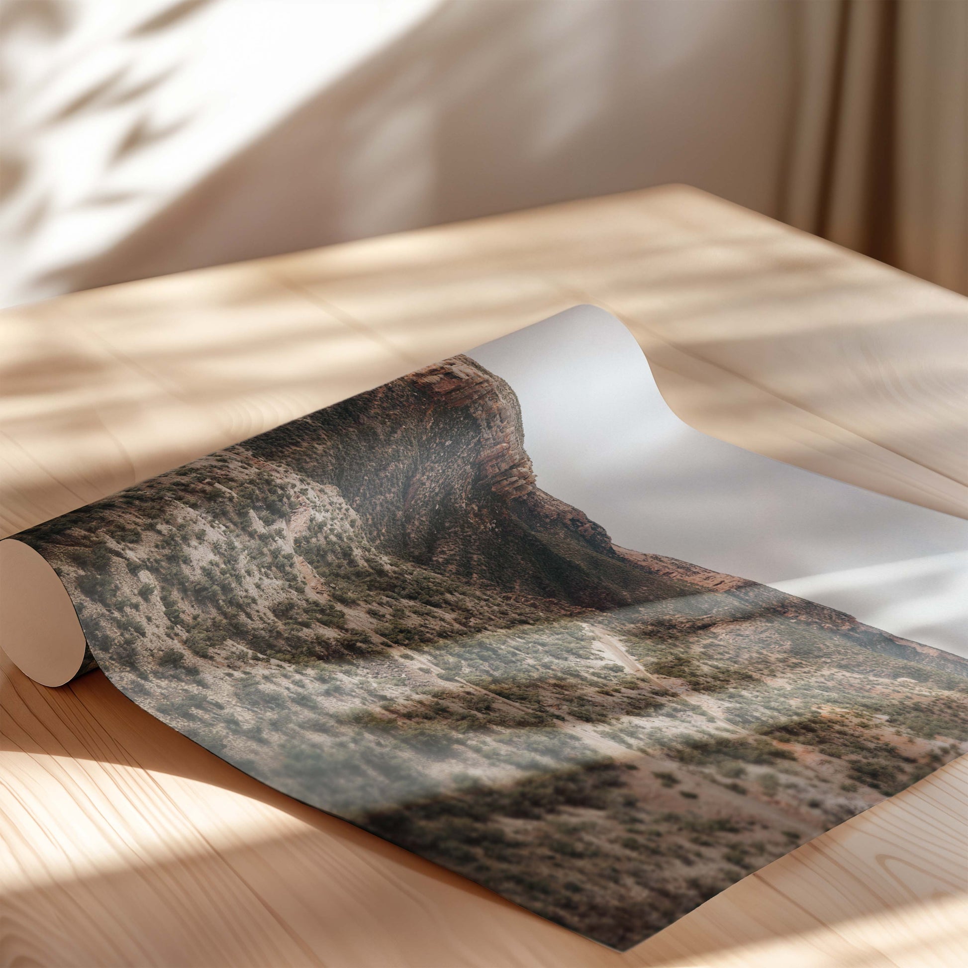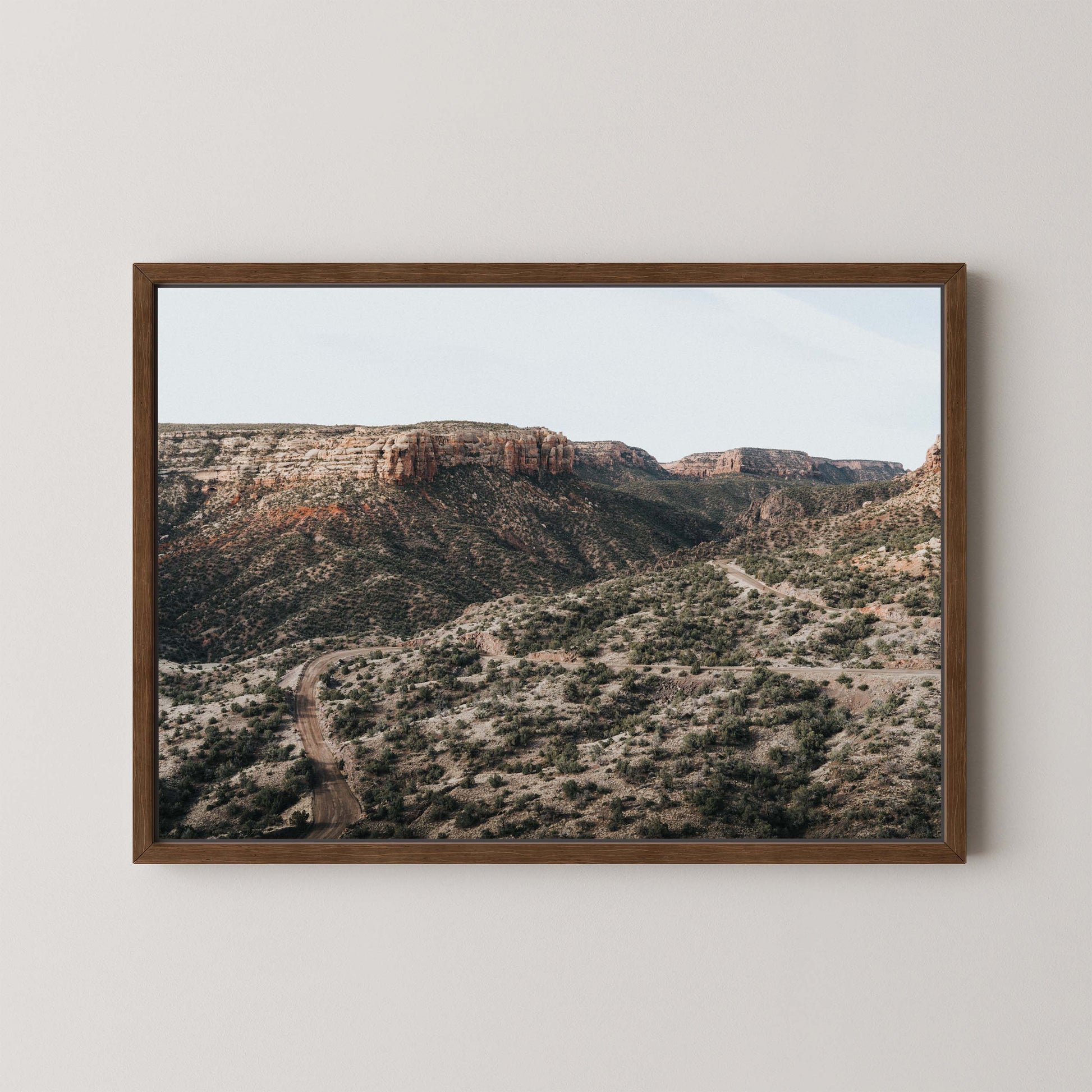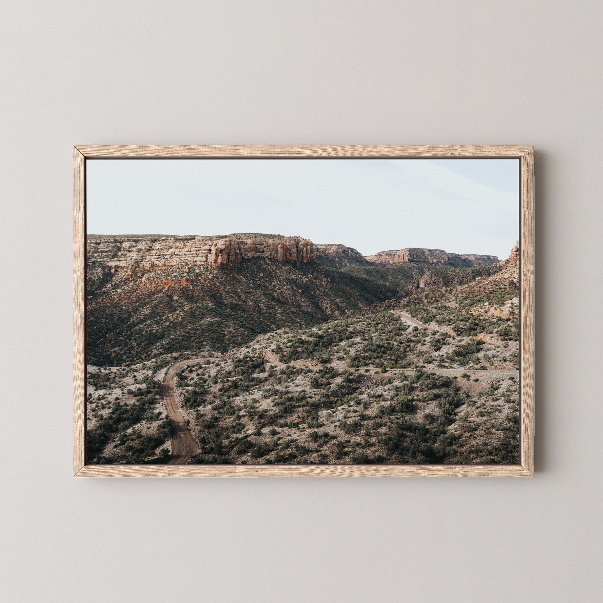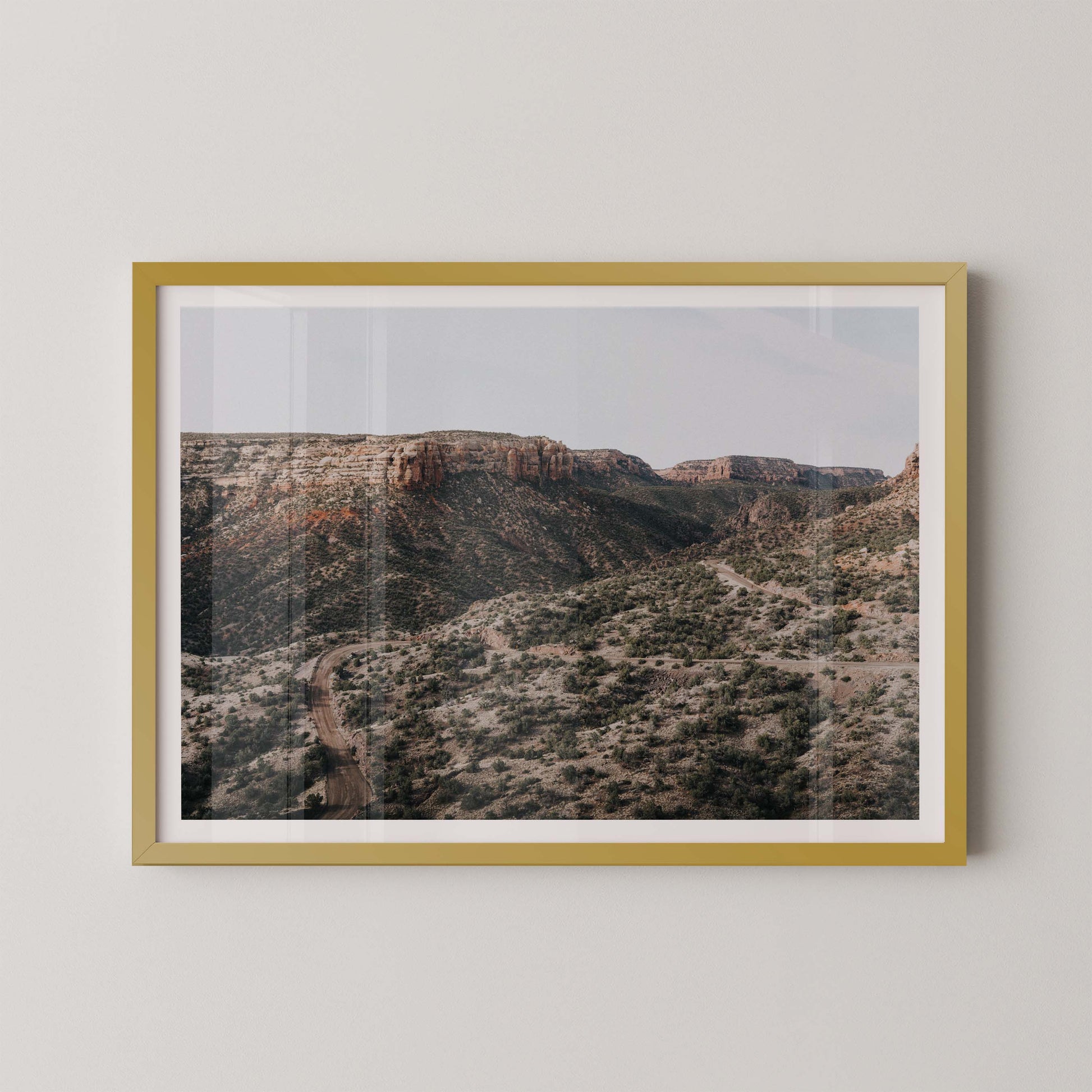 "Desert Vista II" captures a winding dirt road cutting through rugged terrain beneath sunlit cliffs. With its sweeping views and layers of color and texture, this piece celebrates the raw, untamed beauty of the American Southwest. It’s a scene of both solitude and adventure.
