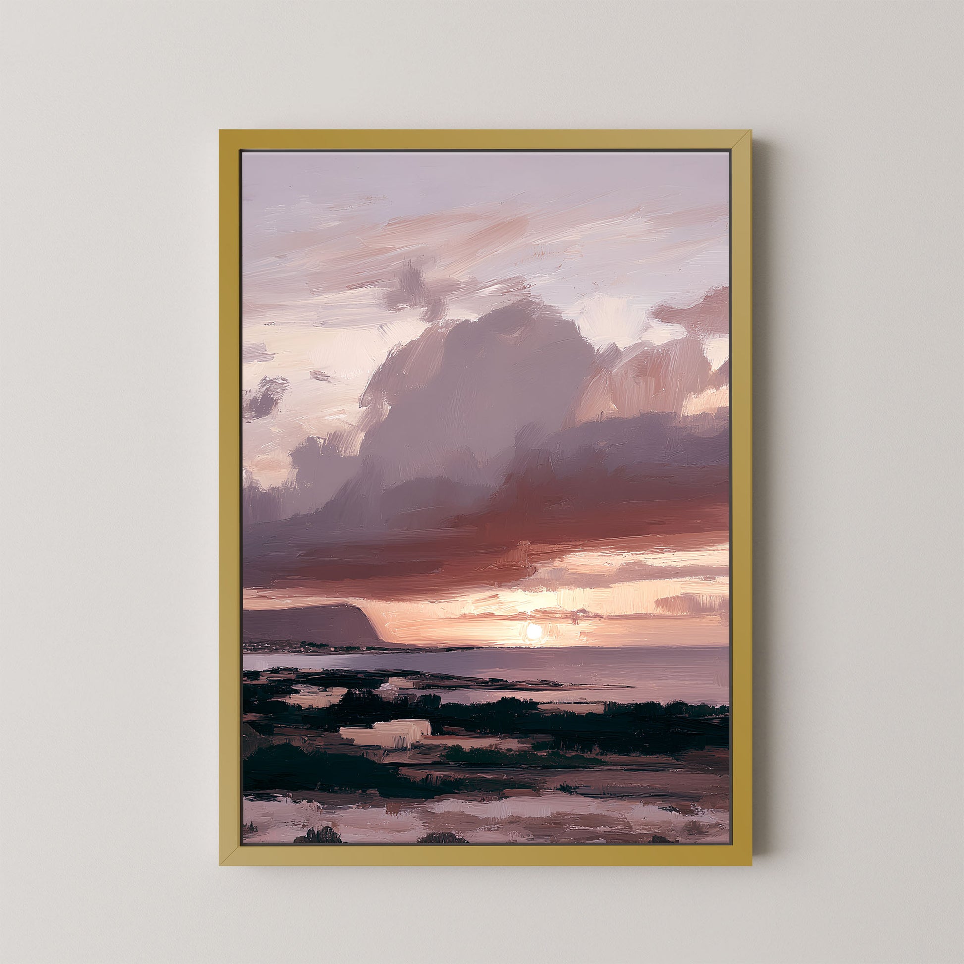 The composition is intentionally atmospheric, with layered clouds and a glowing sun melting into the sea. The gentle movement of color and texture creates a calming visual rhythm, making this piece ideal for spaces designed to feel restful, romantic, and transportive.