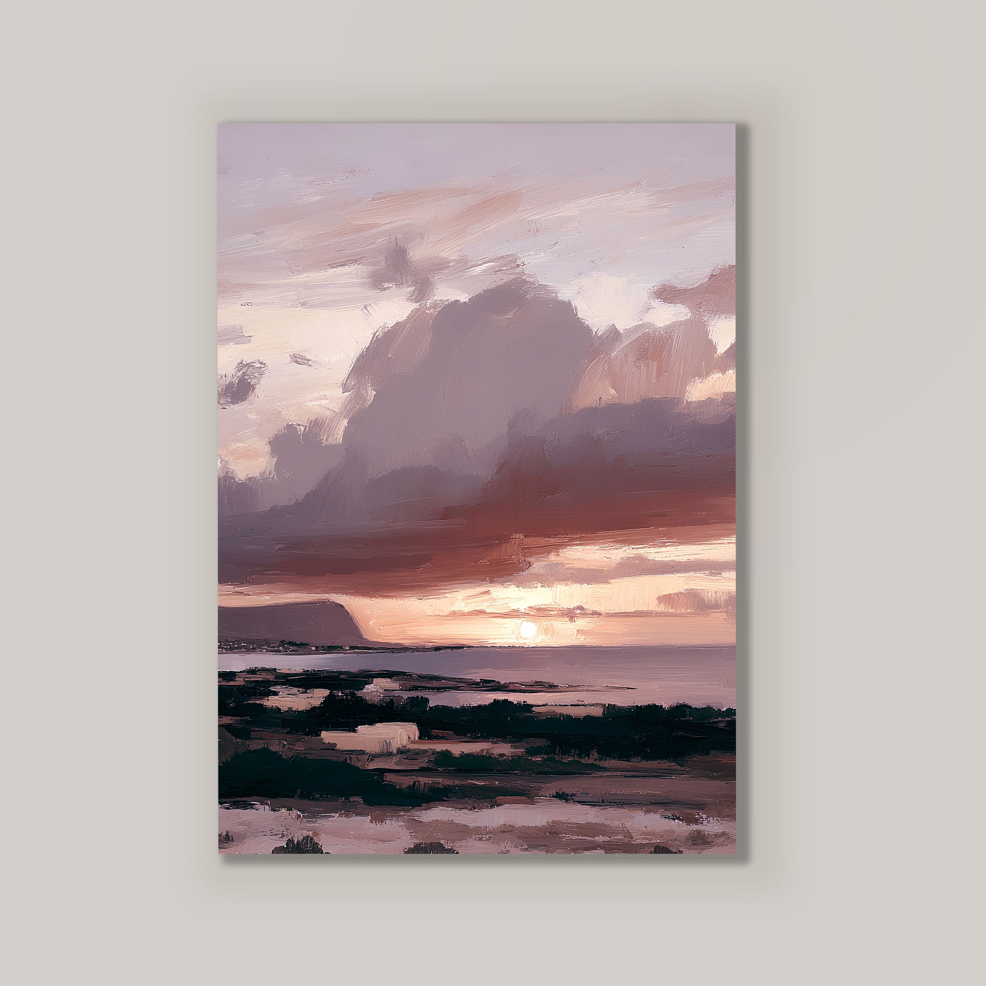 Dreams of Sicily is a serene, painterly seascape inspired by the quiet magic of sunset along the Mediterranean coast. Soft, expressive brushstrokes blend mauve, blush, warm taupe, and muted slate into a horizon that feels both distant and deeply familiar—like a place remembered rather than photographed.