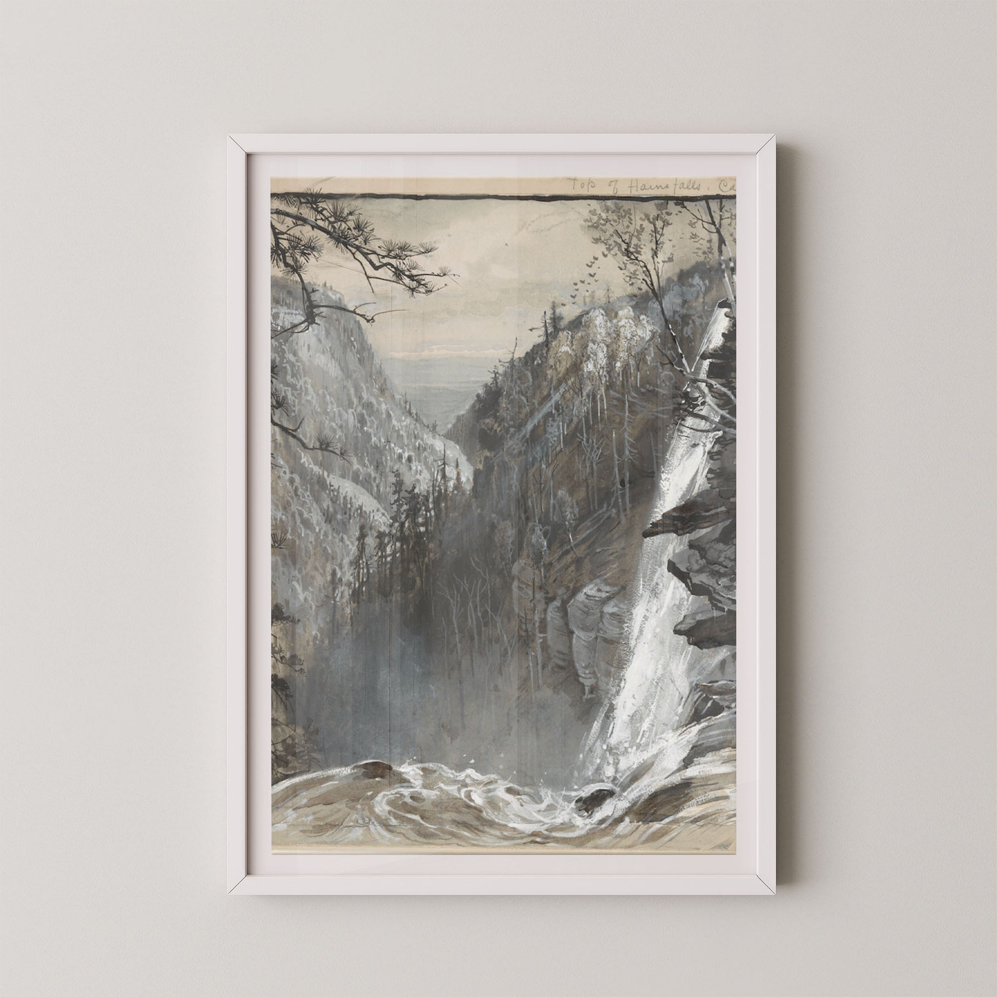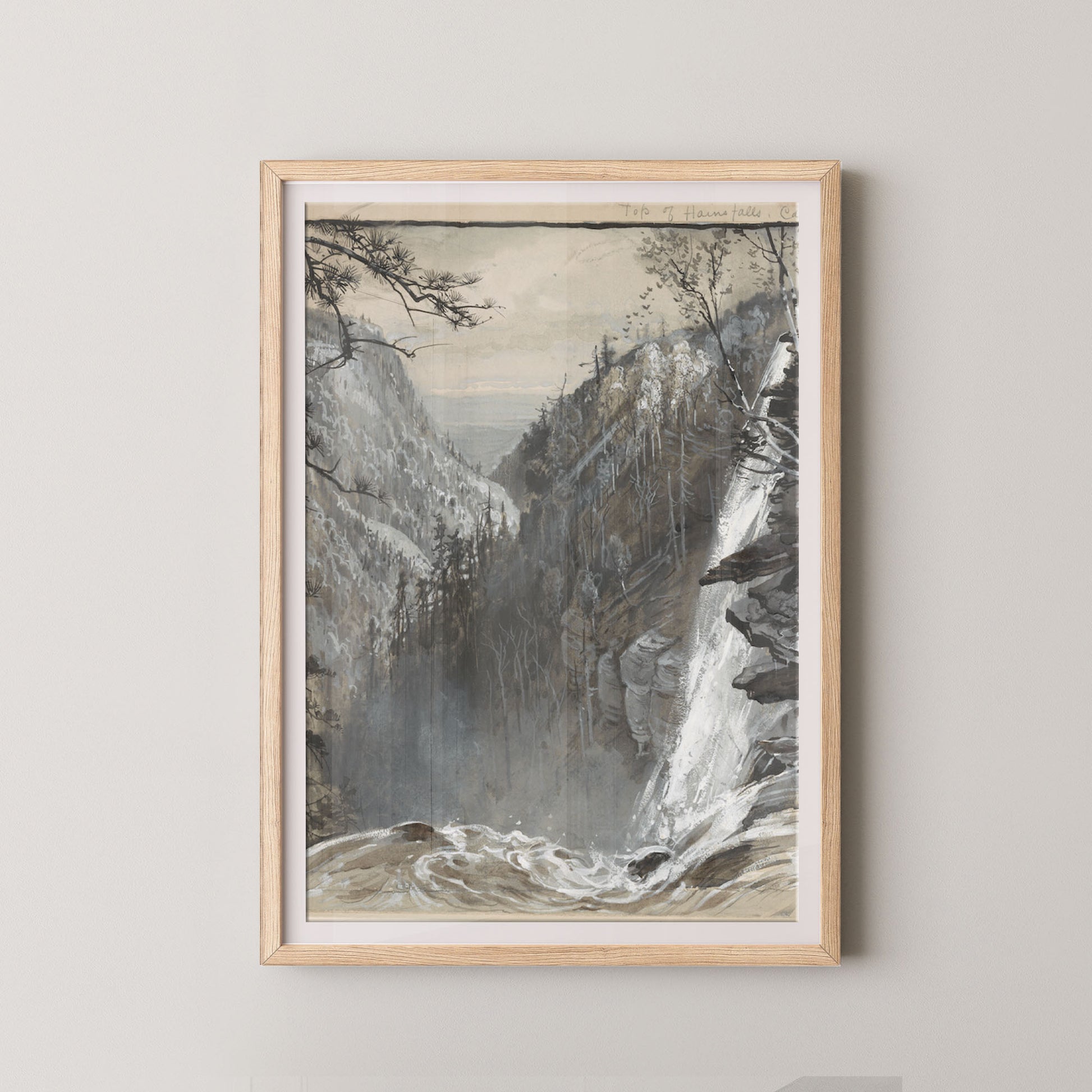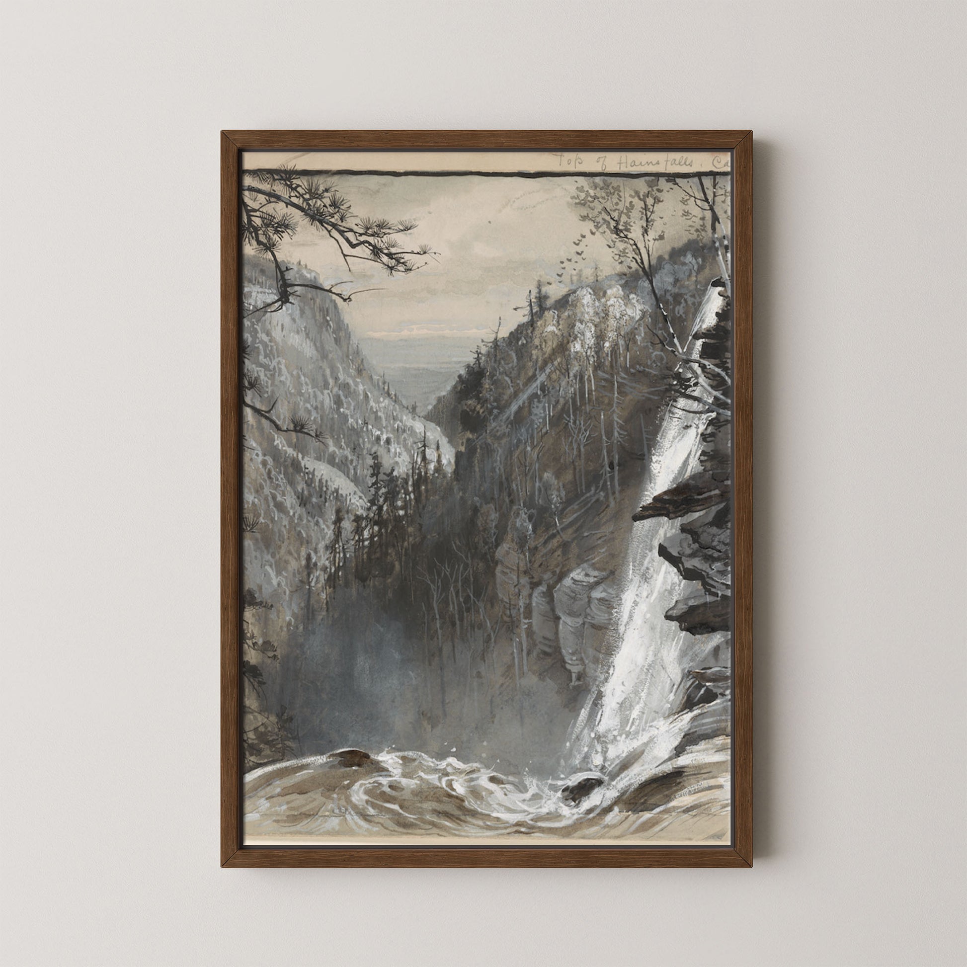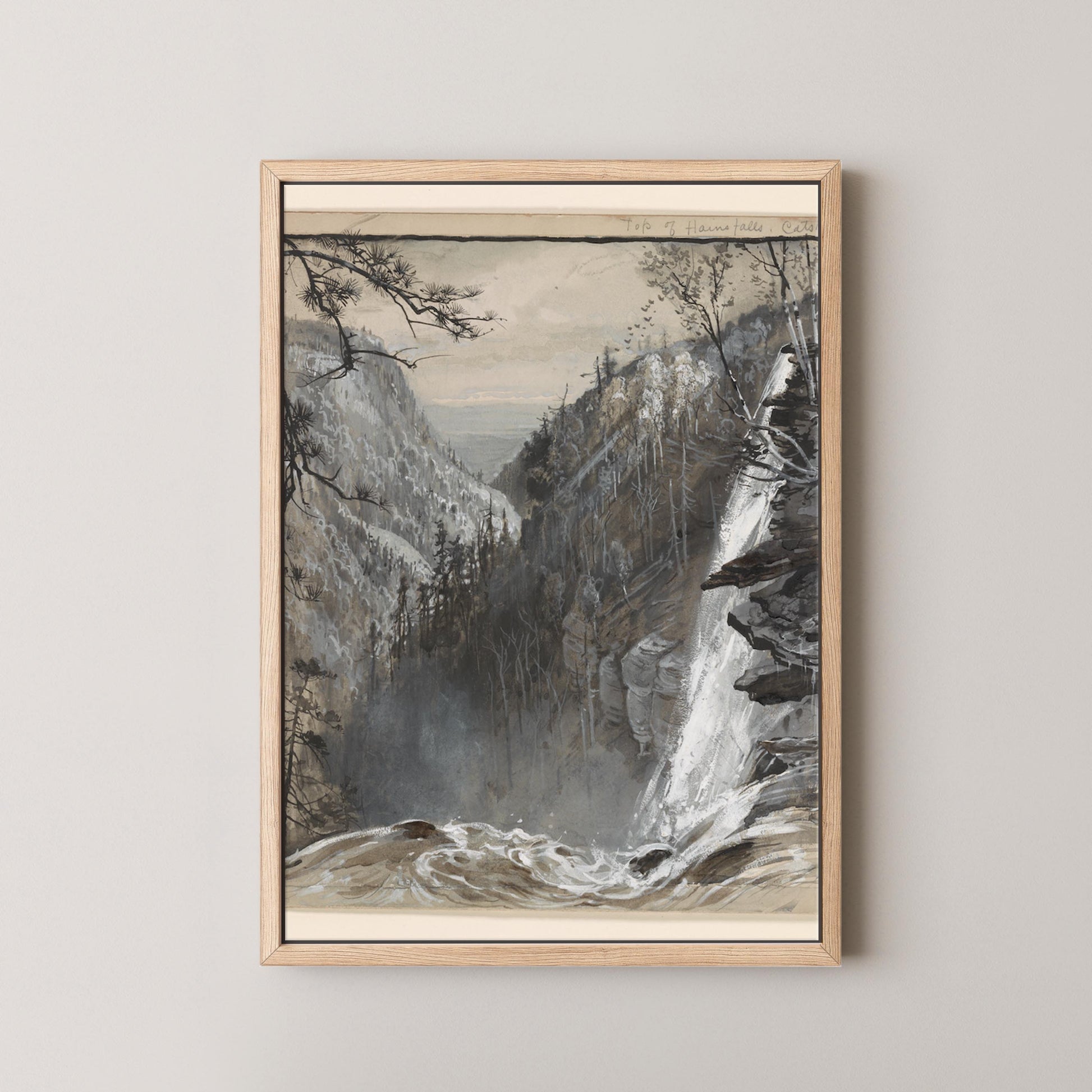 Forest Falls captures the untamed beauty of nature through a breathtaking vintage landscape painting of cascading water and rugged mountain cliffs. Rendered in soft, moody tones of gray, sepia, and cream, this piece evokes the quiet majesty of the wilderness — a timeless reflection of movement, solitude, and awe-inspiring scenery.