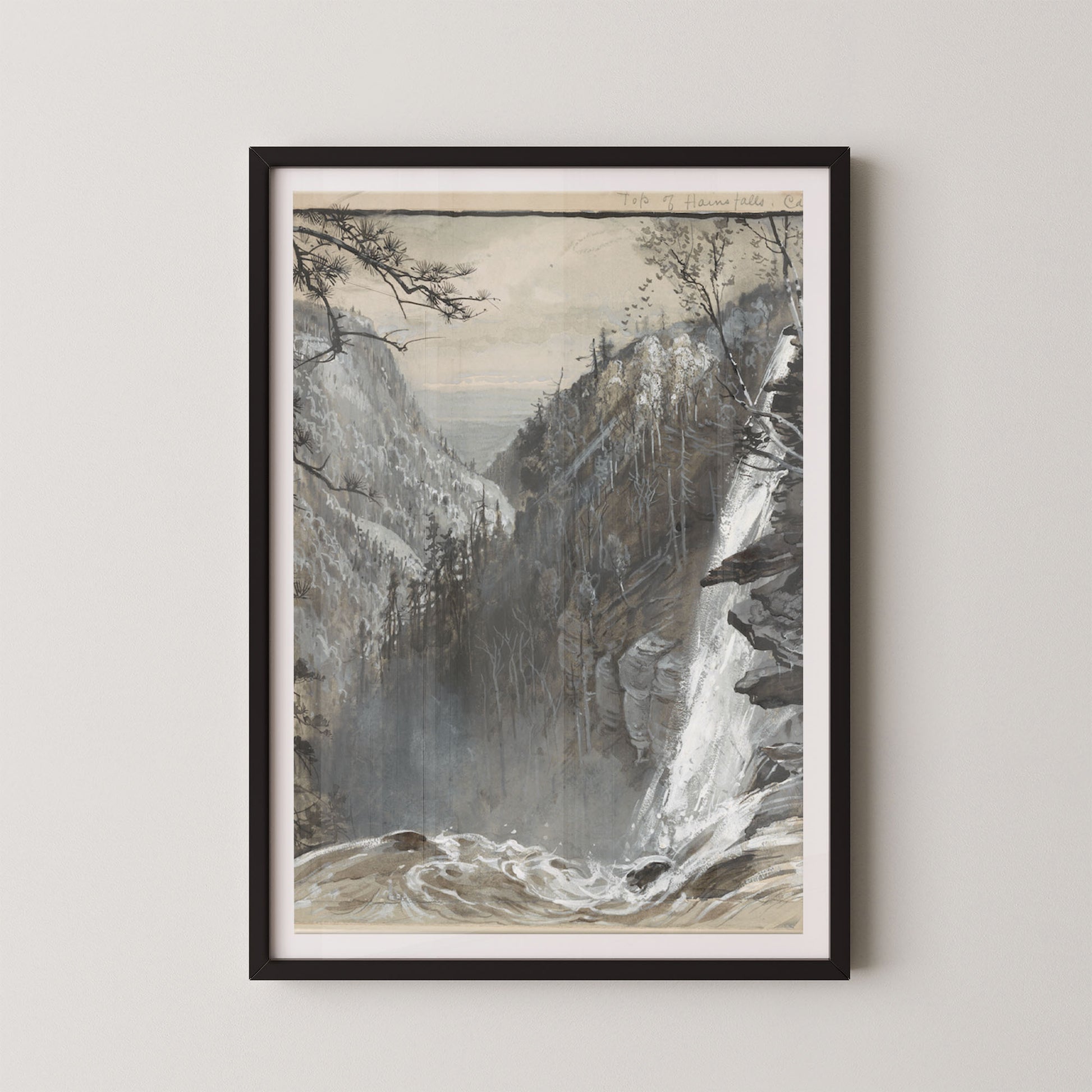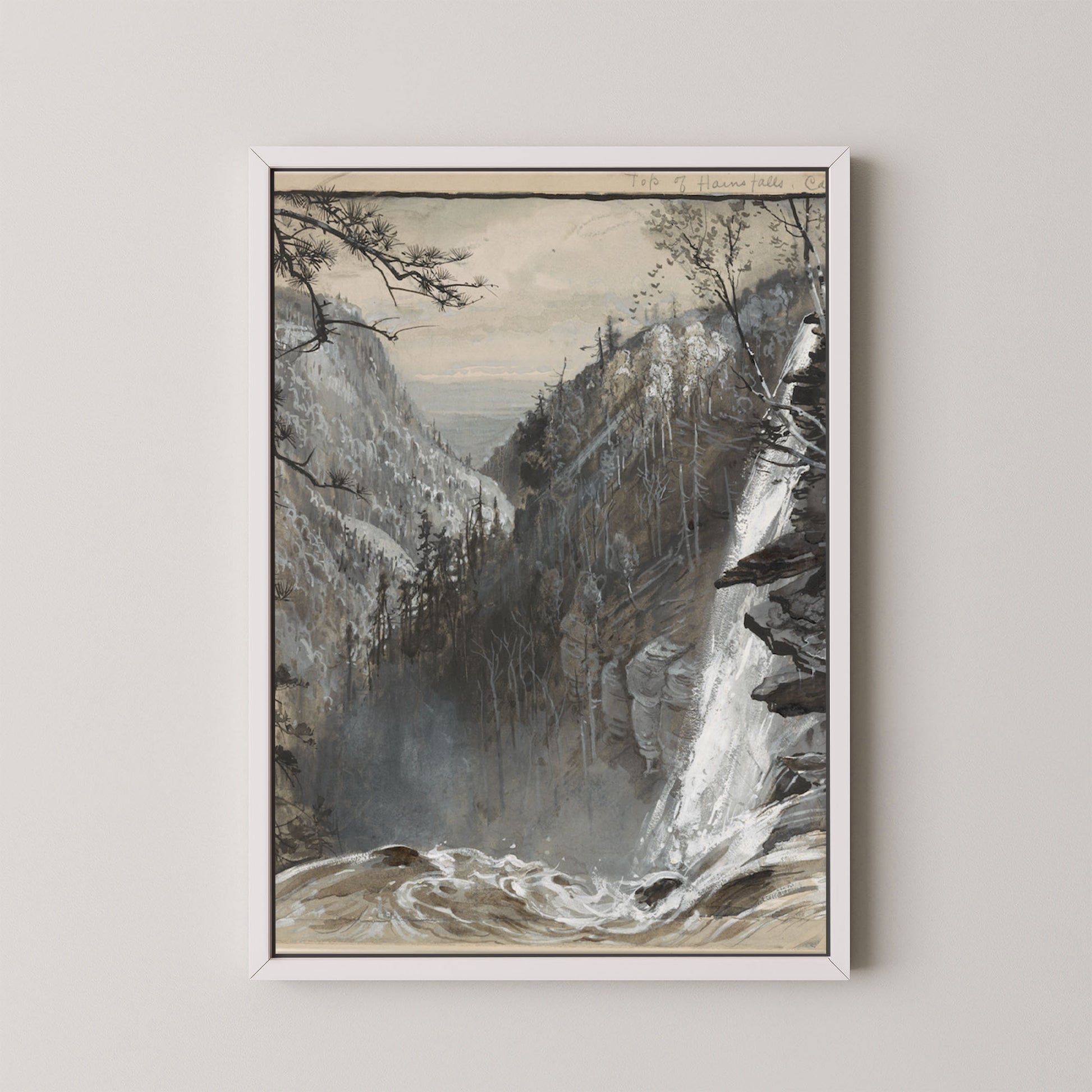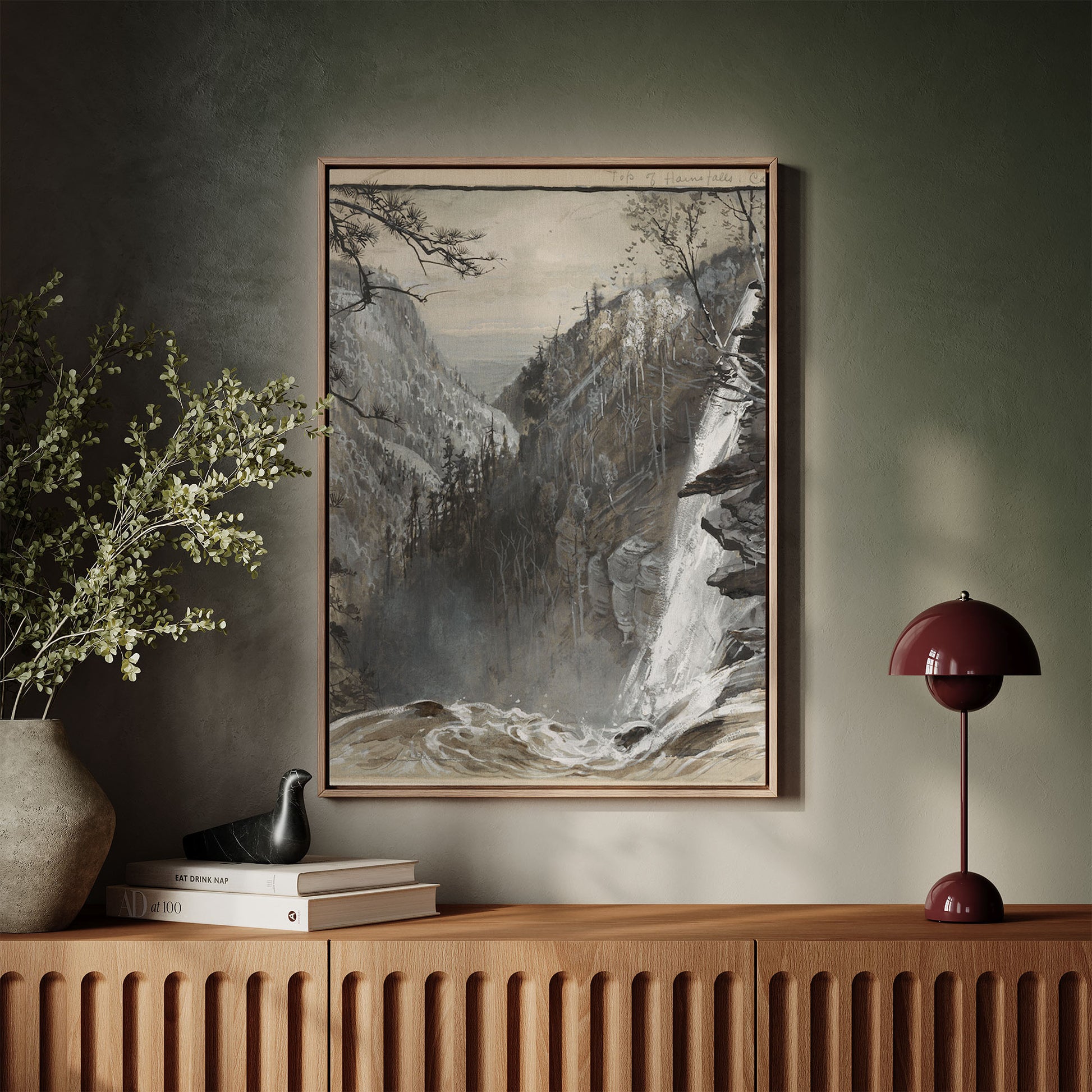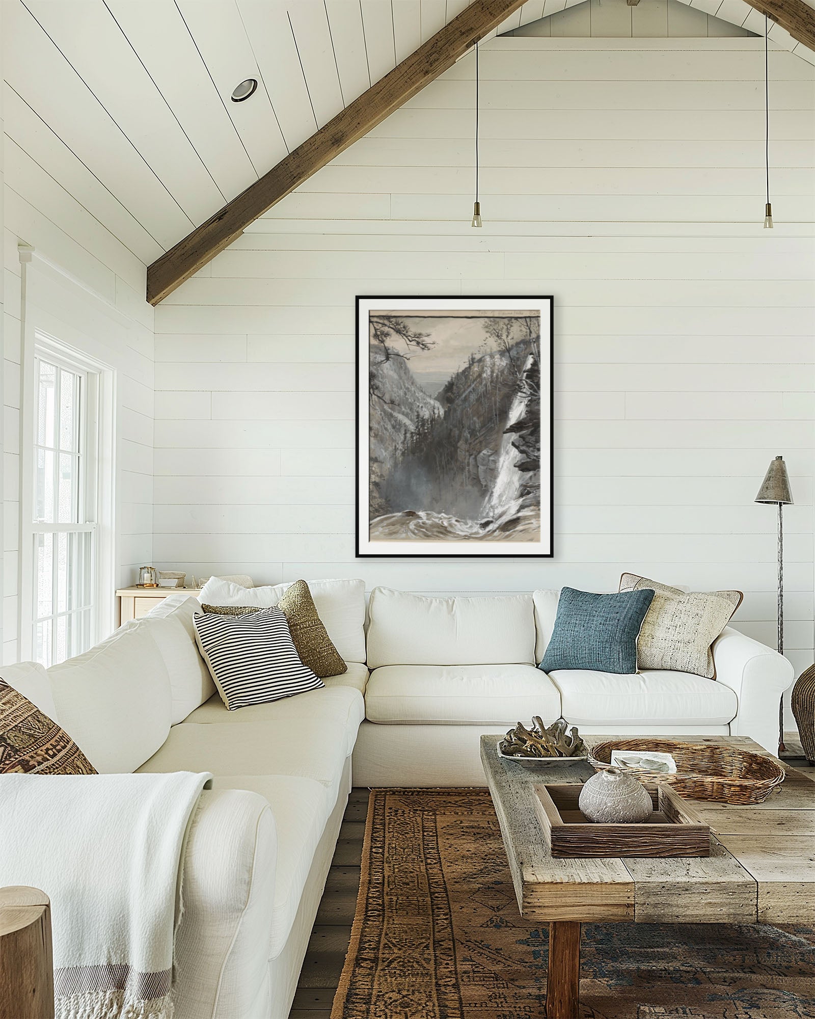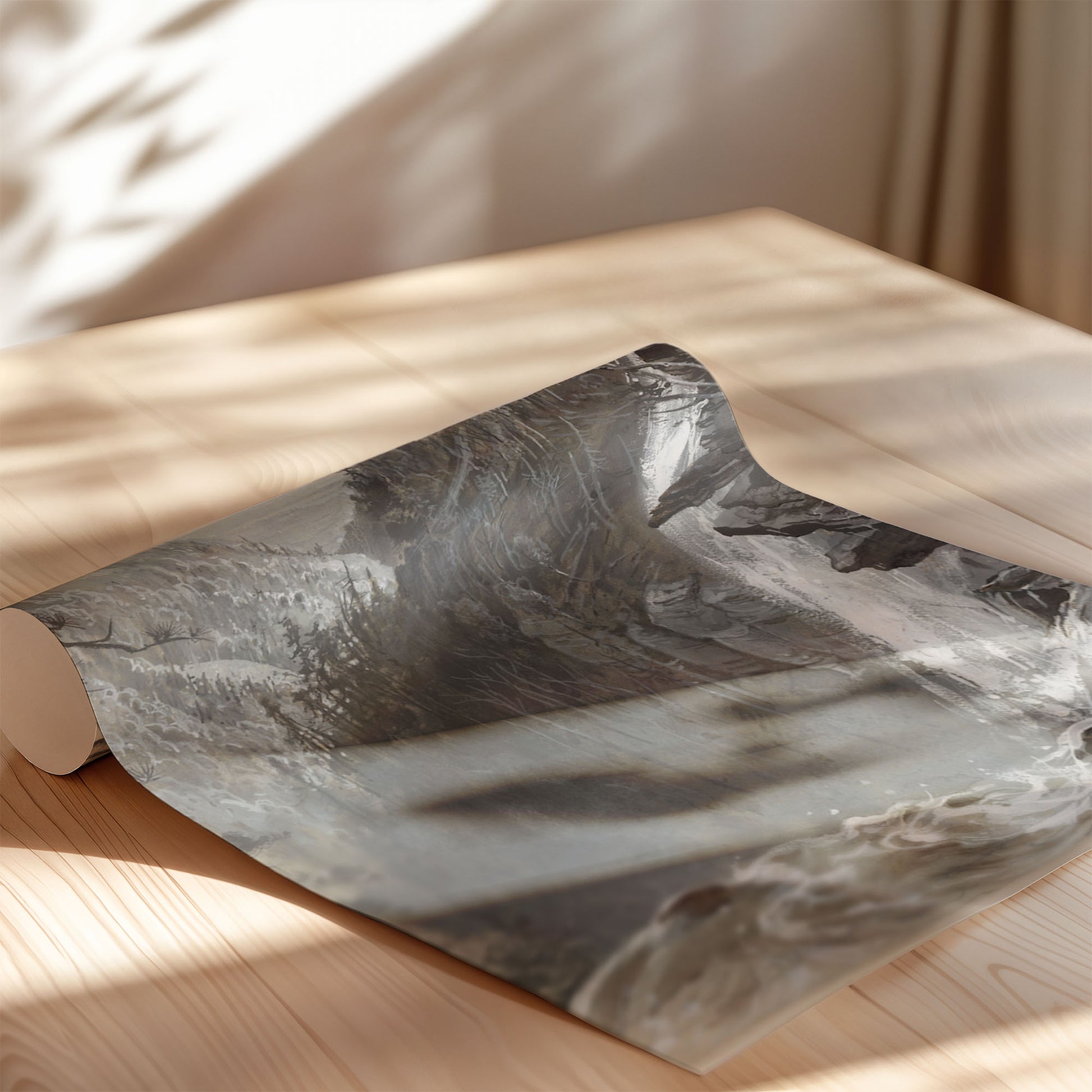 Forest Falls captures the untamed beauty of nature through a breathtaking vintage landscape painting of cascading water and rugged mountain cliffs. Rendered in soft, moody tones of gray, sepia, and cream, this piece evokes the quiet majesty of the wilderness — a timeless reflection of movement, solitude, and awe-inspiring scenery.