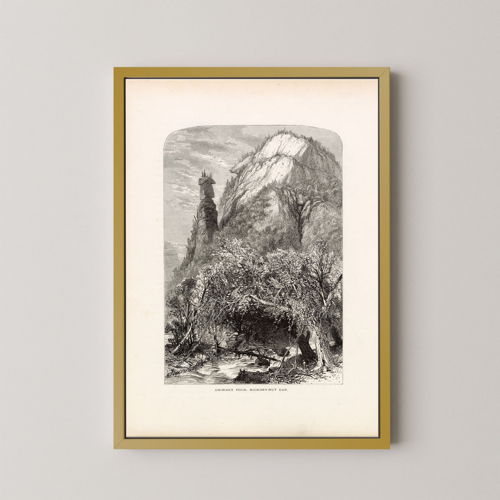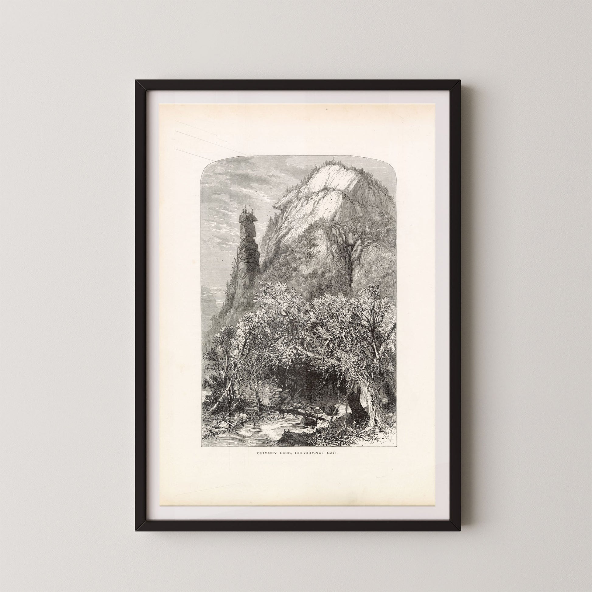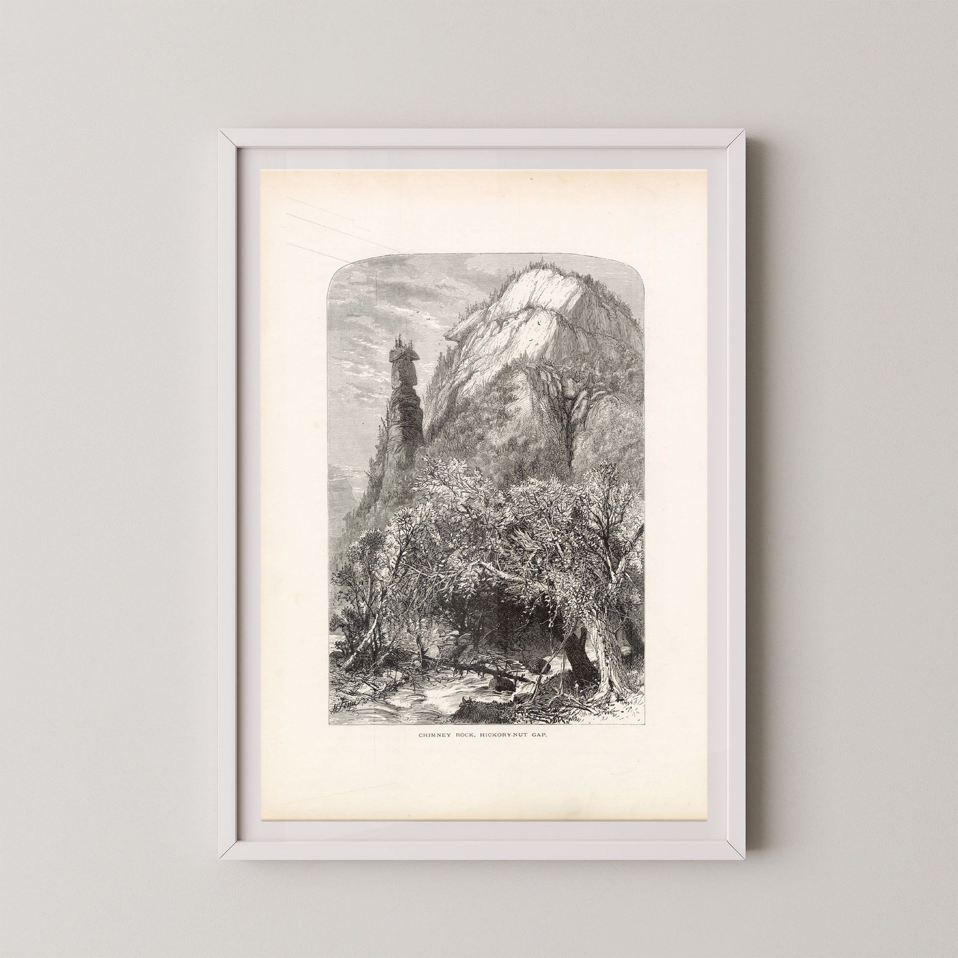 Hickory Nut Gap is a stunning vintage landscape engraving that captures the awe-inspiring rock formations and rugged beauty of North Carolina’s Blue Ridge region. Featuring the iconic Chimney Rock rising dramatically above a forested valley, this piece blends artistry and geography in a timeless tribute to the American wilderness.