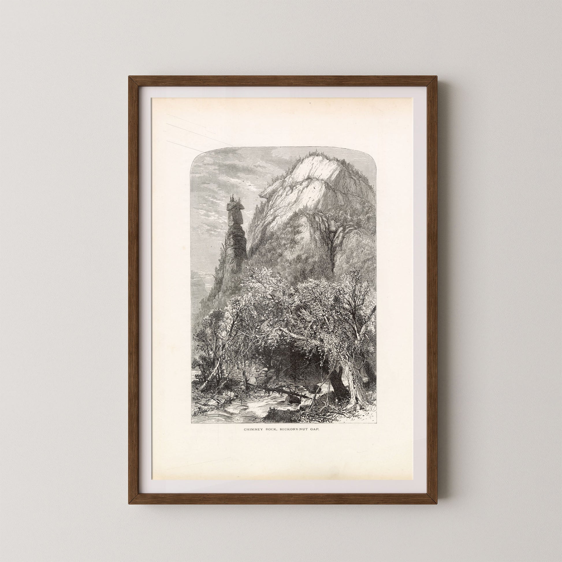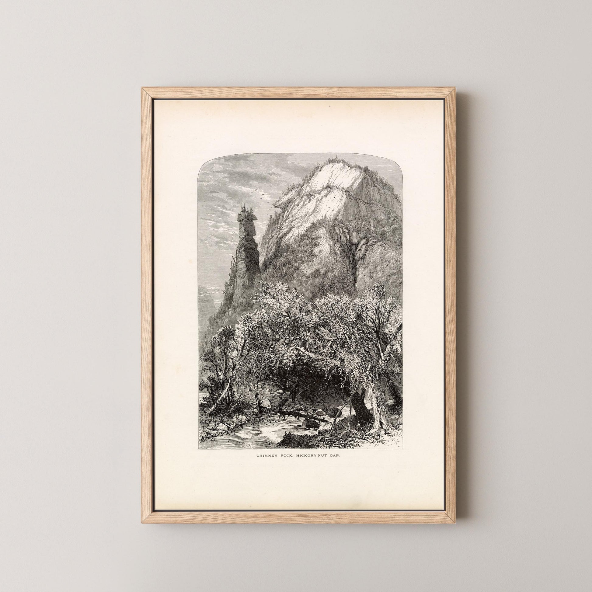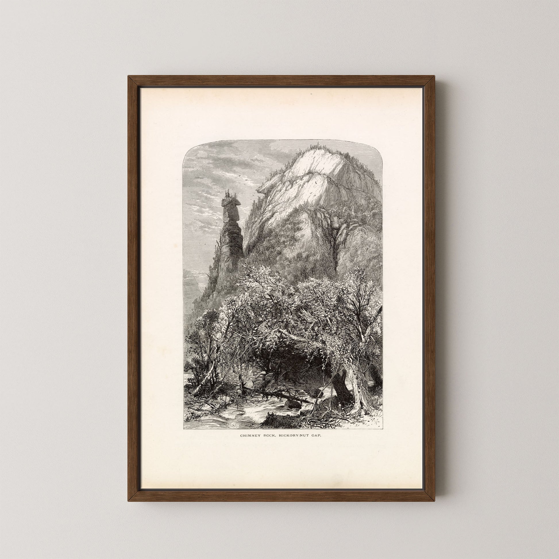 Hickory Nut Gap is a stunning vintage landscape engraving that captures the awe-inspiring rock formations and rugged beauty of North Carolina’s Blue Ridge region. Featuring the iconic Chimney Rock rising dramatically above a forested valley, this piece blends artistry and geography in a timeless tribute to the American wilderness.