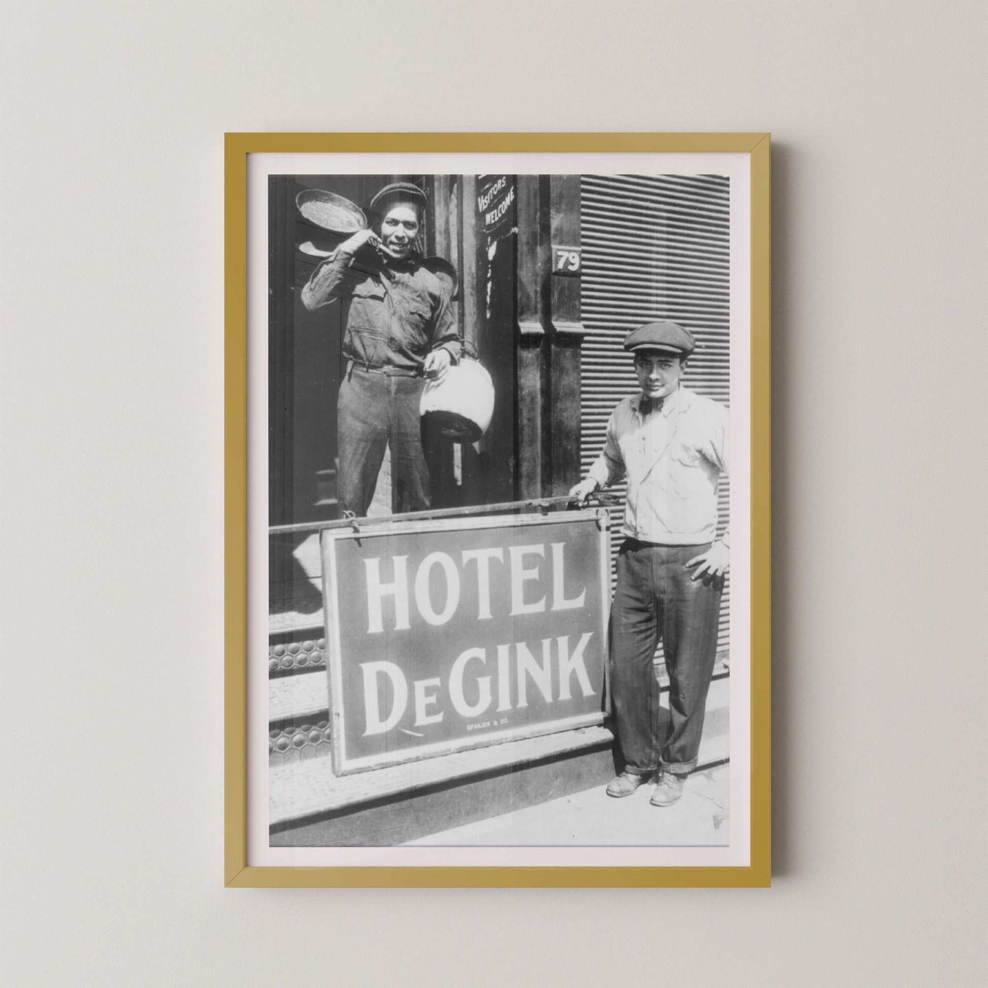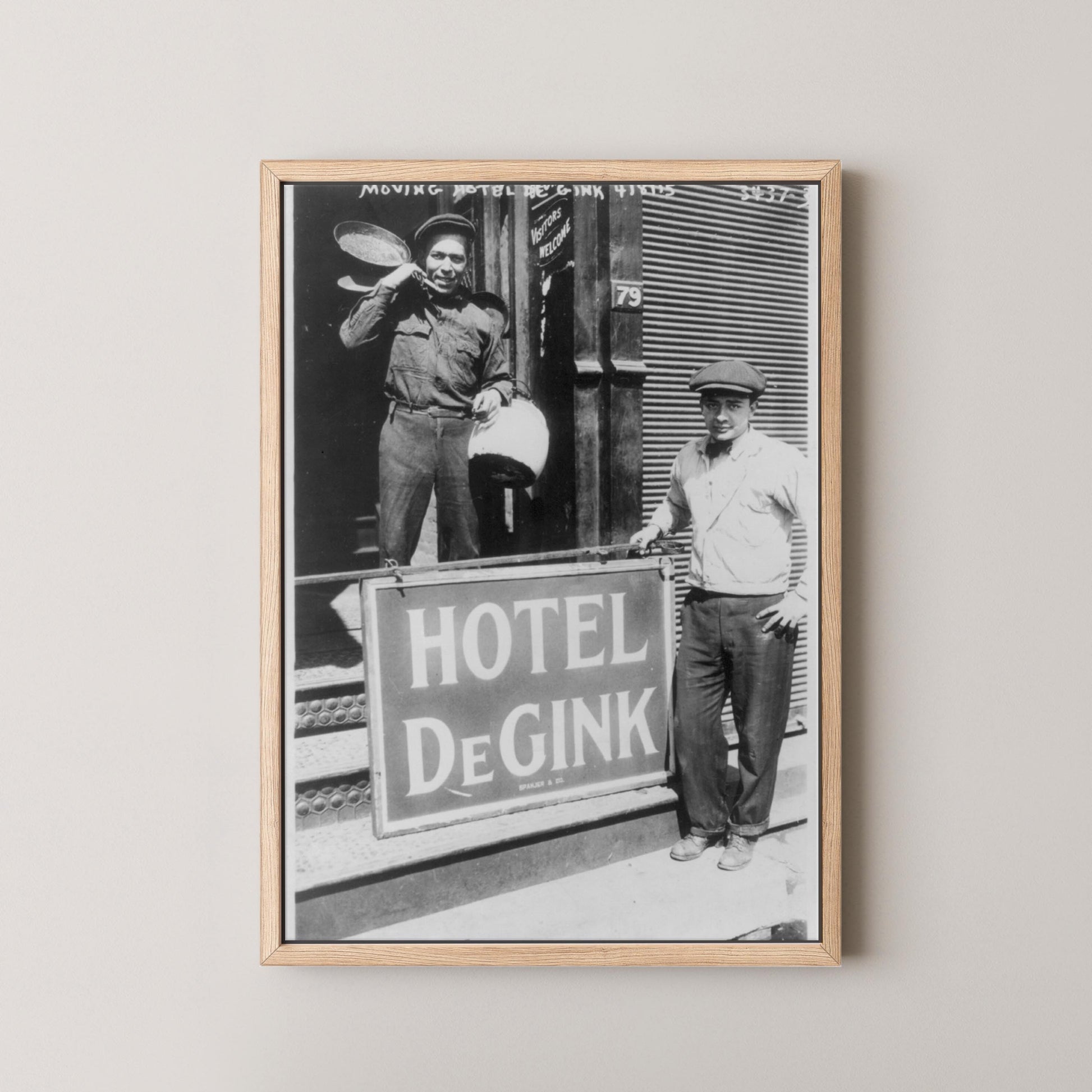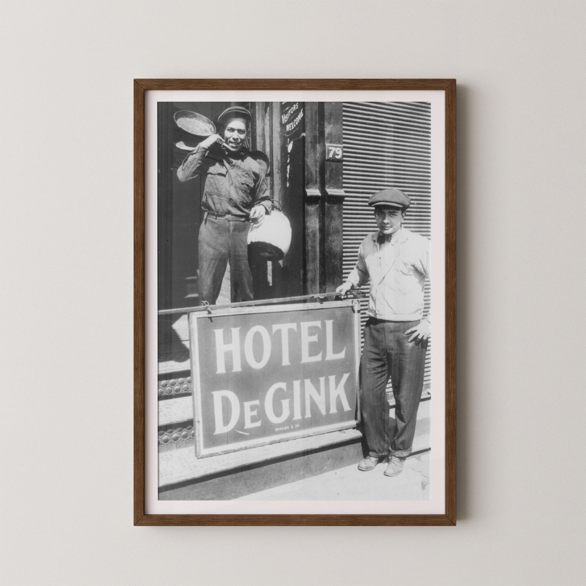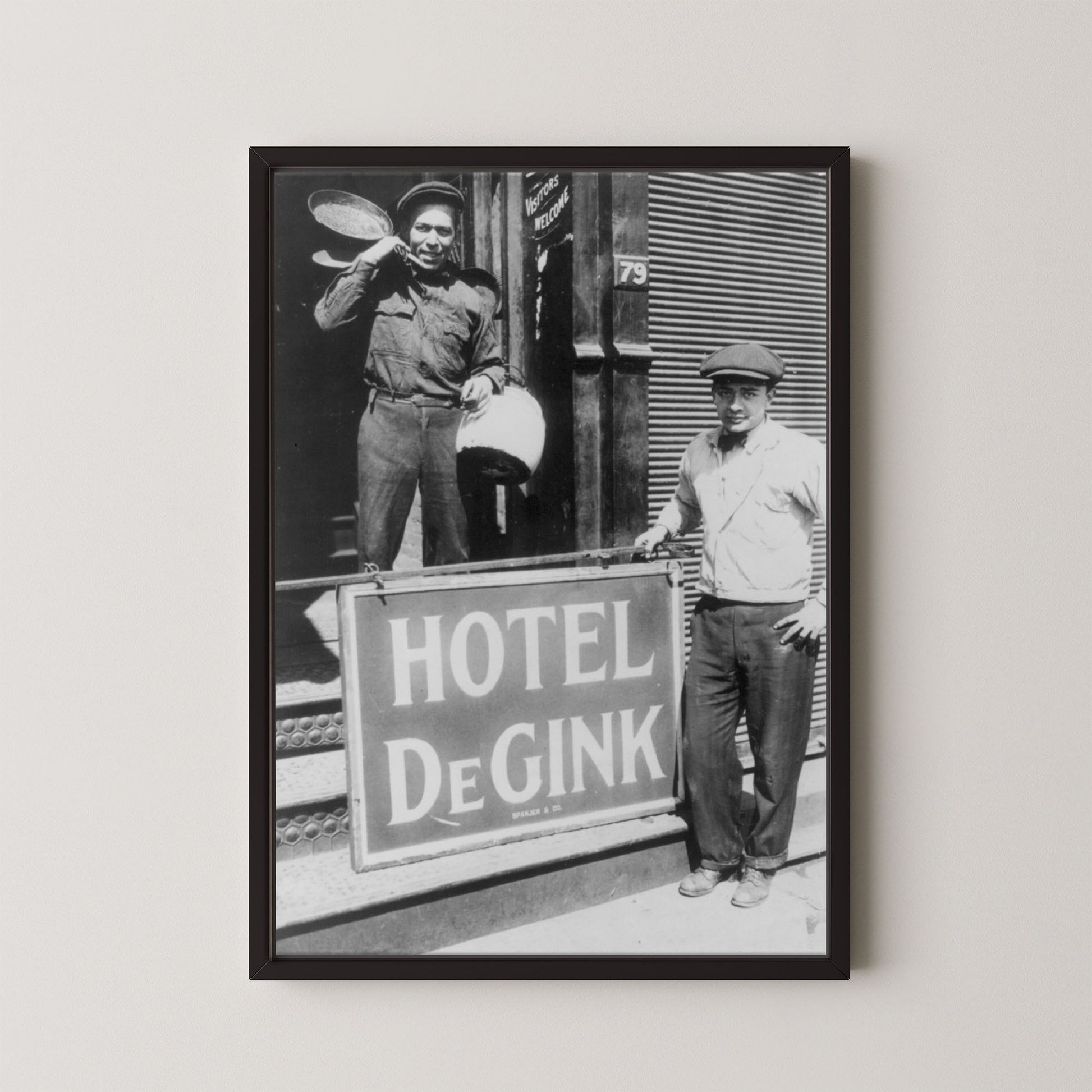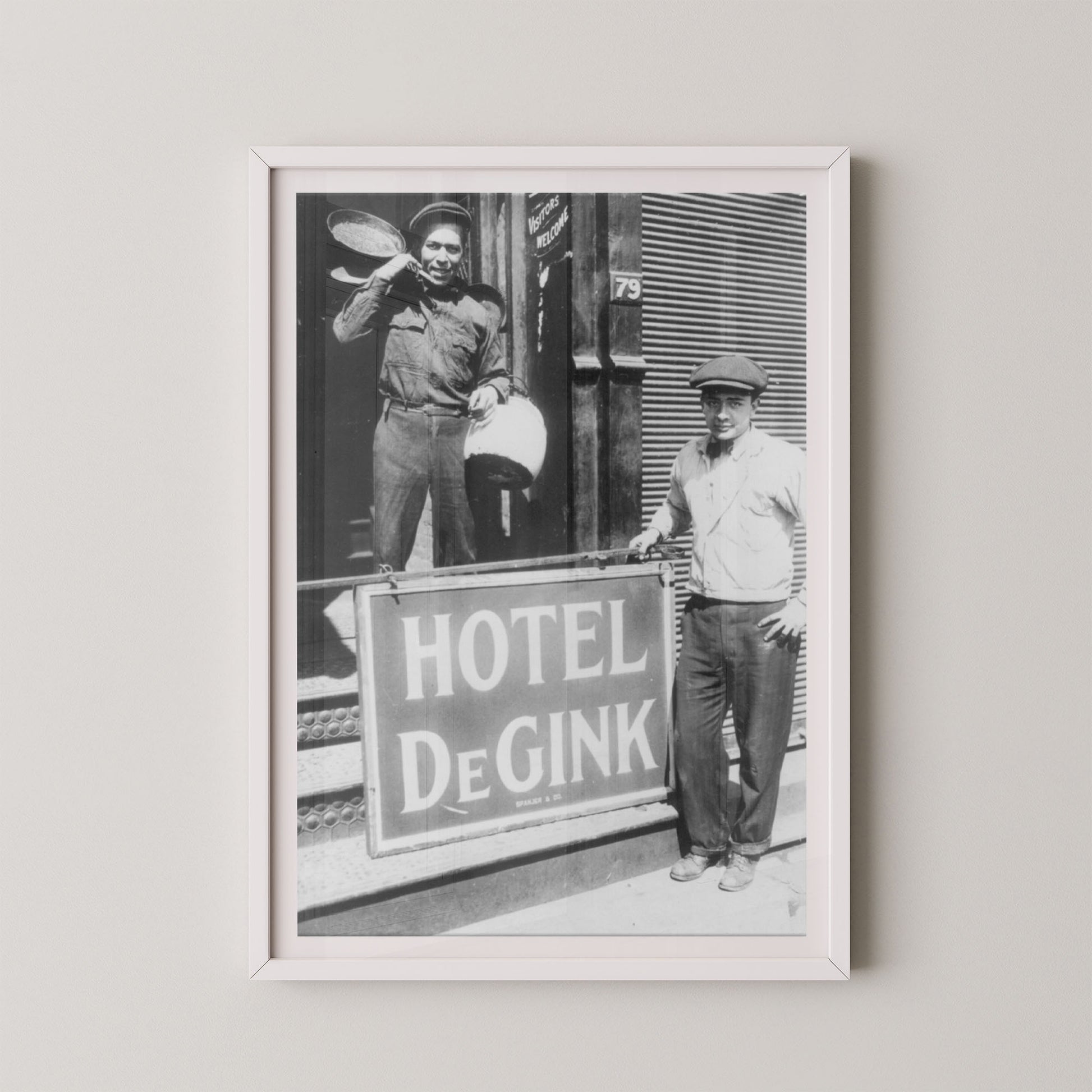Hotel DeGink is a fascinating black-and-white photograph that captures a slice of early 20th-century urban life and camaraderie. Featuring two men standing proudly in front of the “Hotel DeGink” sign, this image blends grit, humor, and history — a rare glimpse into the resilience and character of everyday working-class America.