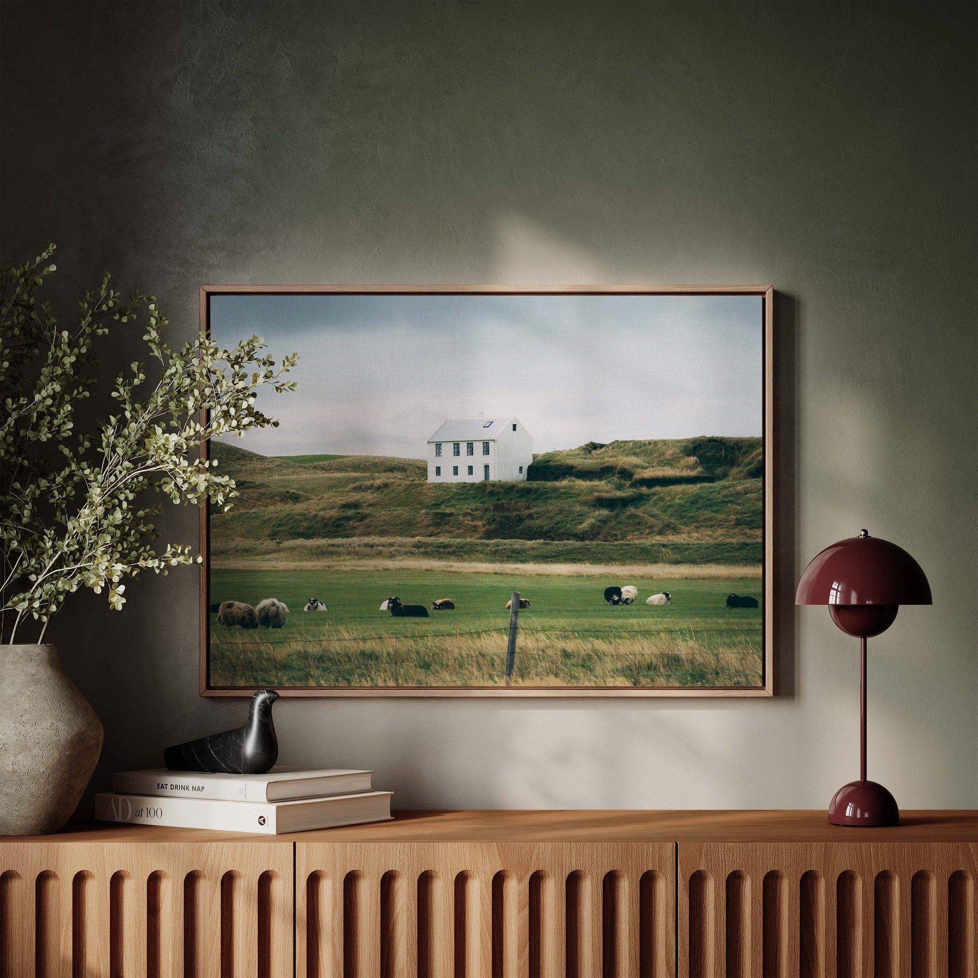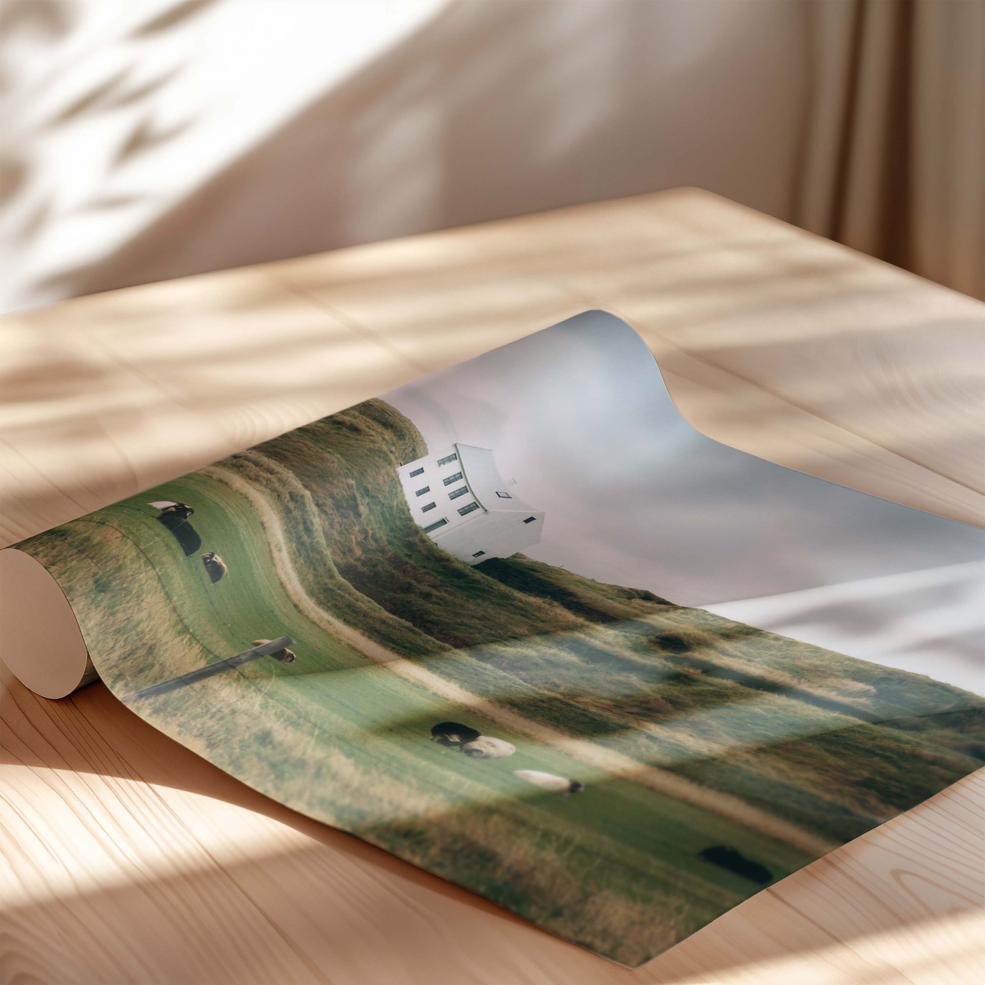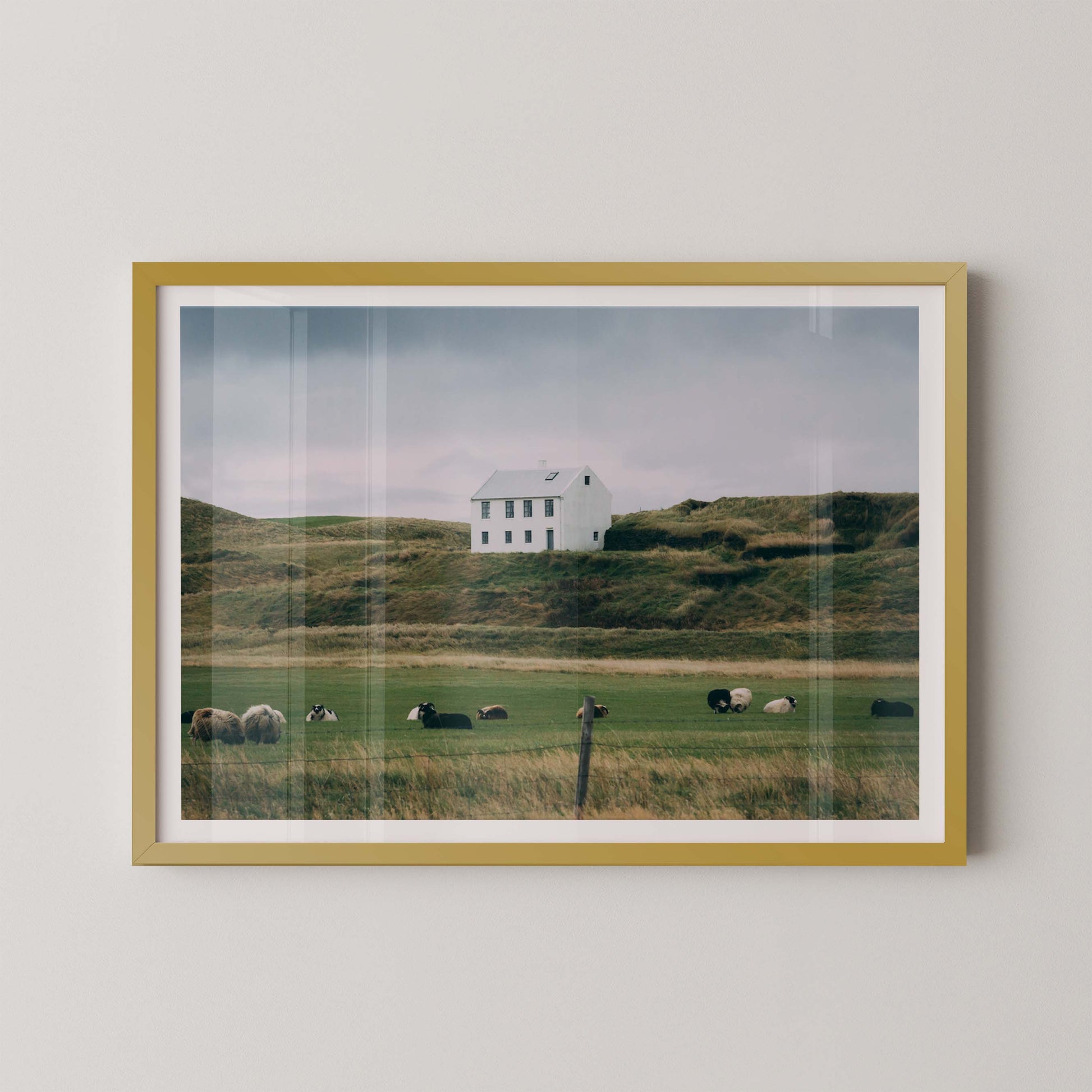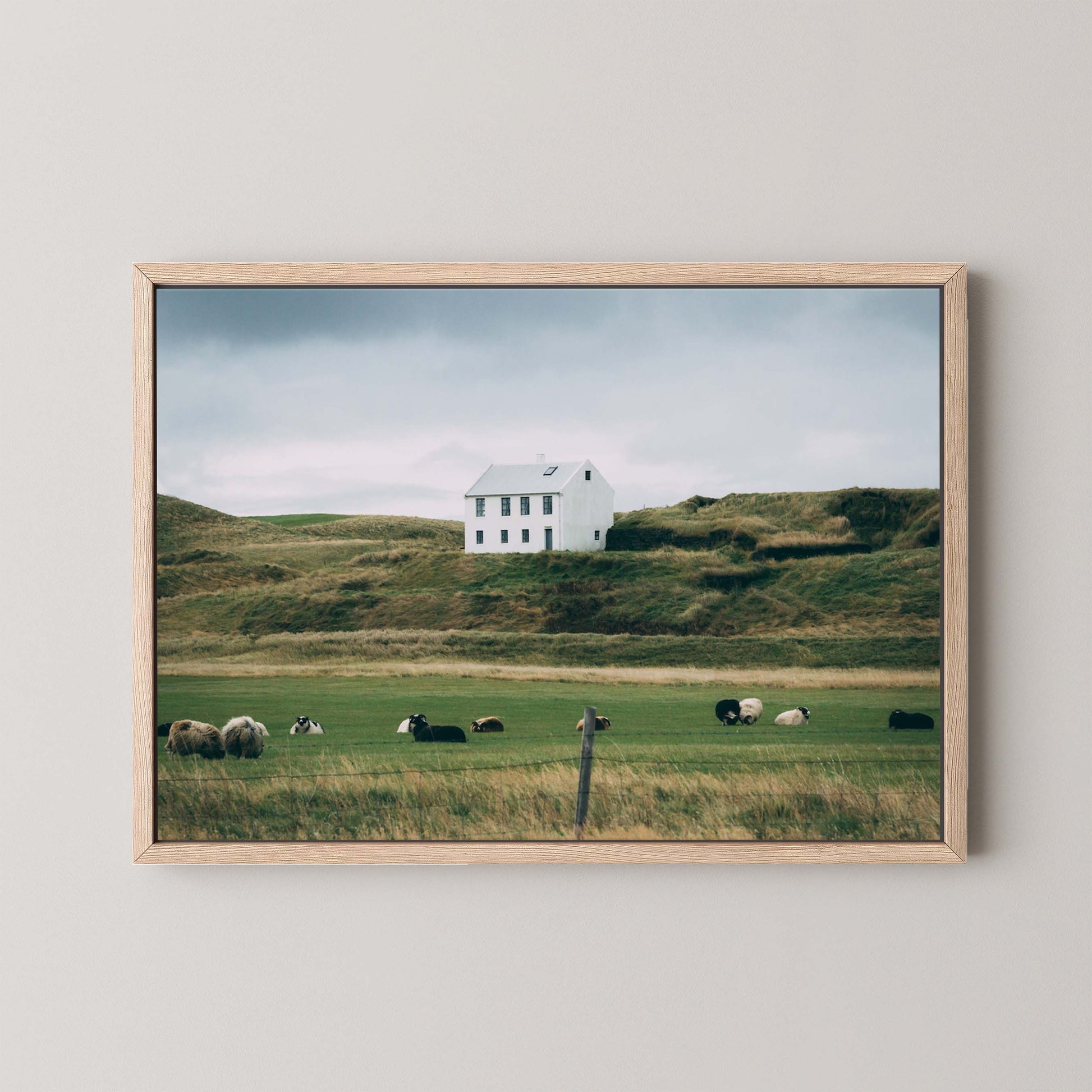 Step into the peaceful rhythm of rural life with "Icelandic Farmhouse", a striking photograph that captures the stillness and solitude of the Icelandic countryside. A white farmhouse stands stoically against windswept hills, while a scattered flock of sheep grazes on the lush green pasture below. The moody skies and subdued tones lend a quiet drama that’s both grounding and inspiring.