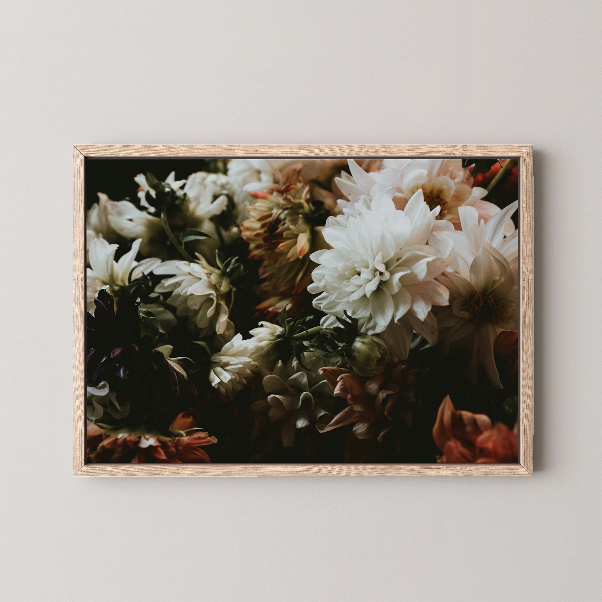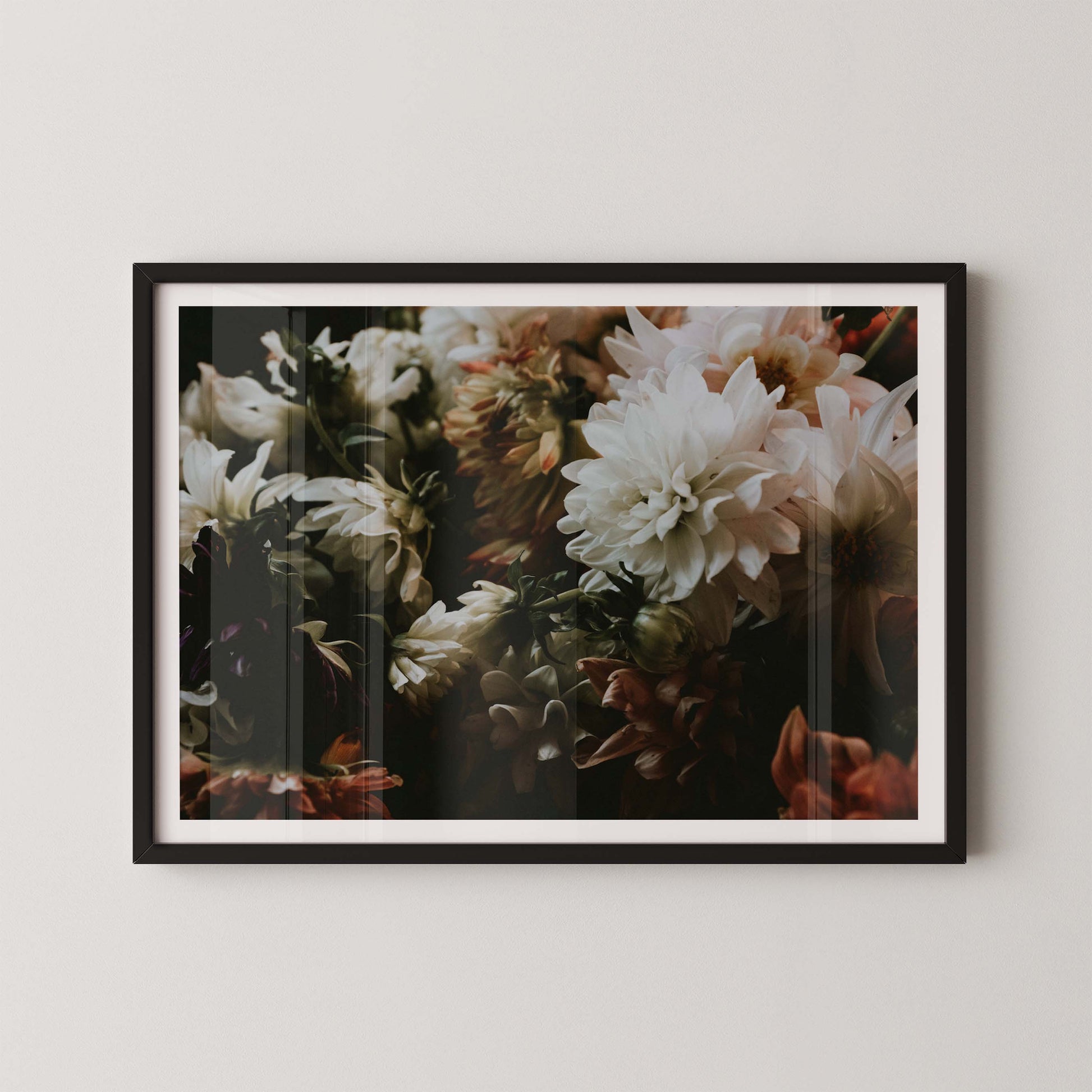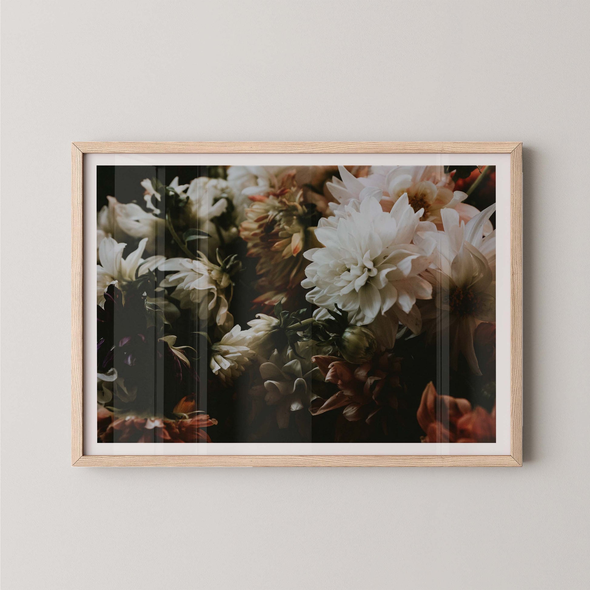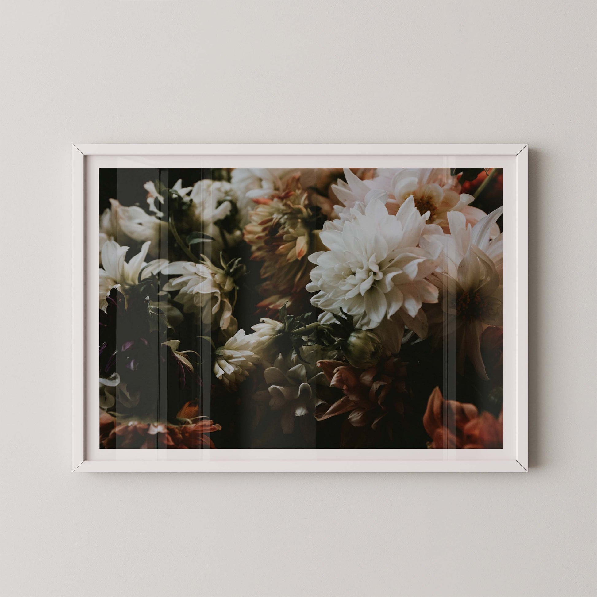 Soft petals, deep shadows, and painterly textures come together in "In Bloom"—a moody floral print that feels both romantic and grounded. Creamy white, soft blush, and rich plum dahlias bloom against a dark background, creating an elegant contrast and timeless appeal. This piece adds depth and softness to any space, offering a sophisticated alternative to traditional floral prints.
