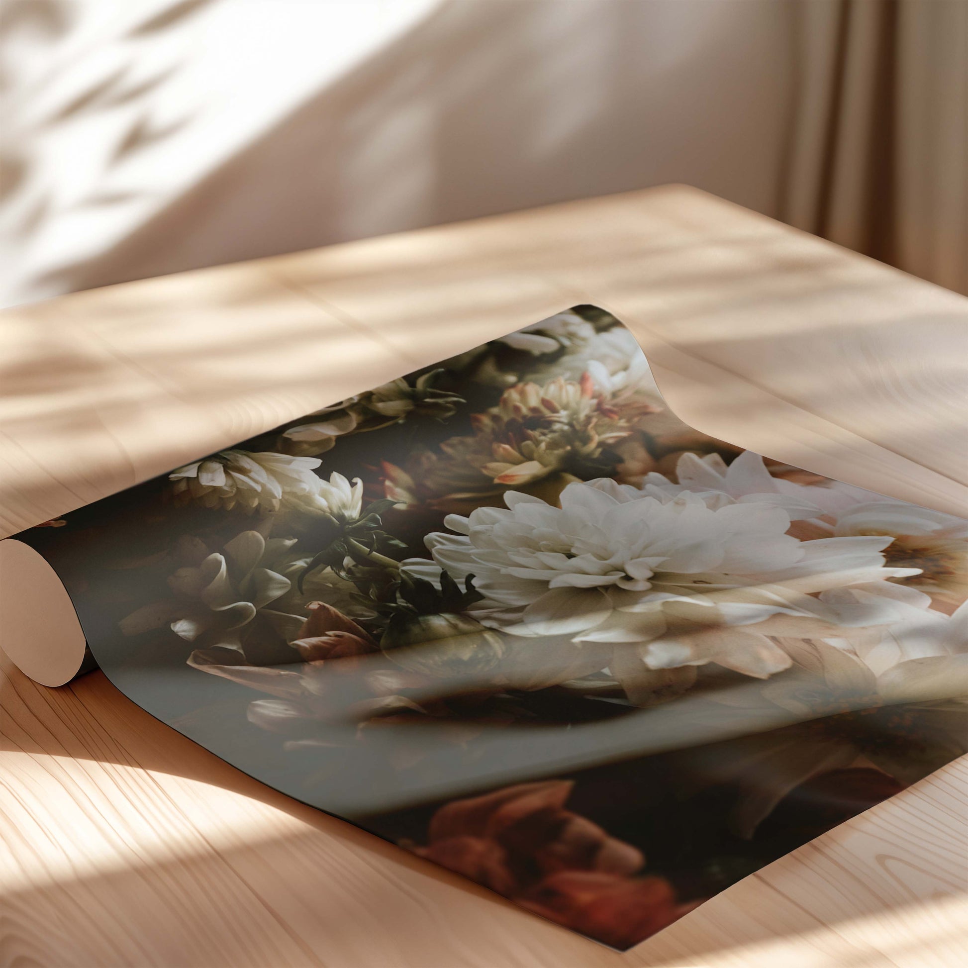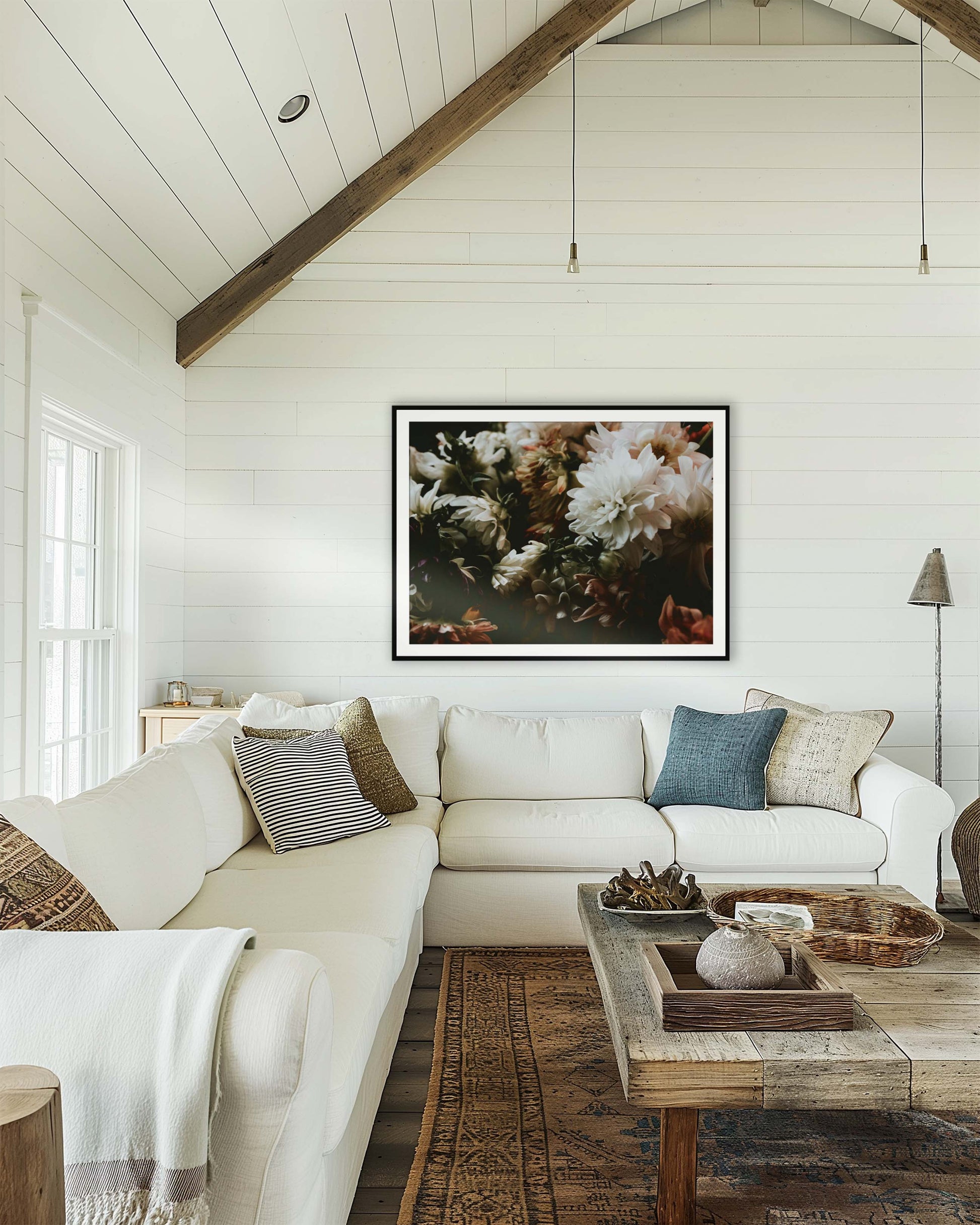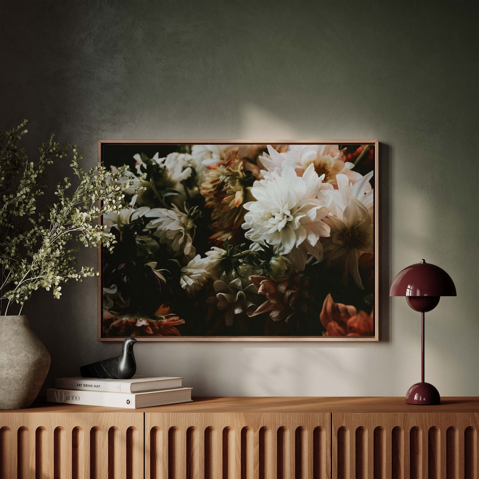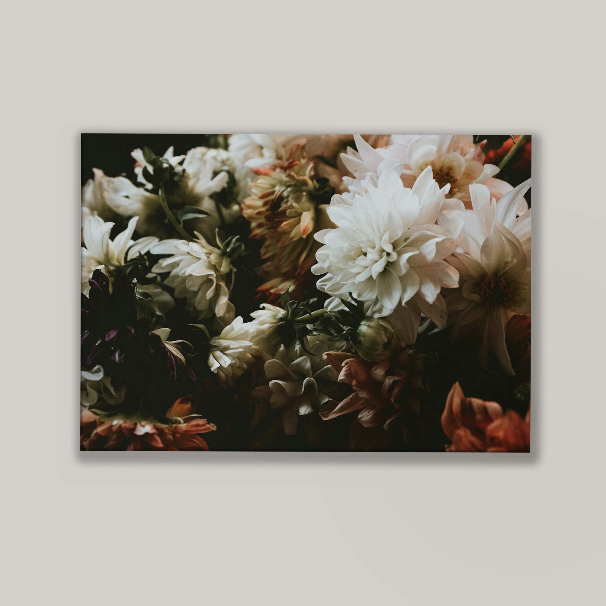 Soft petals, deep shadows, and painterly textures come together in "In Bloom"—a moody floral print that feels both romantic and grounded. Creamy white, soft blush, and rich plum dahlias bloom against a dark background, creating an elegant contrast and timeless appeal. This piece adds depth and softness to any space, offering a sophisticated alternative to traditional floral prints.
