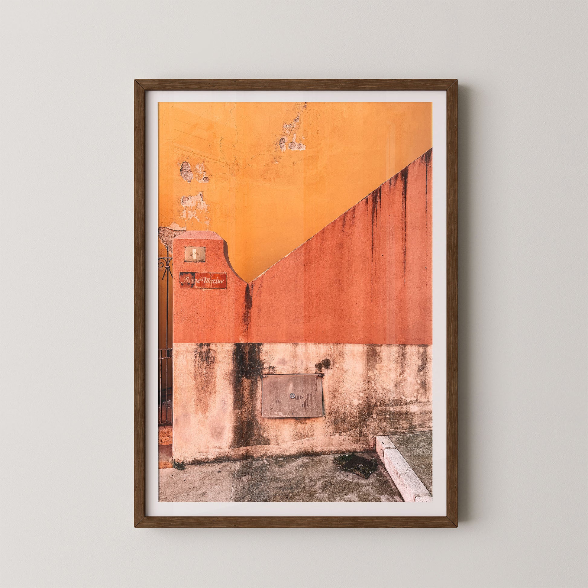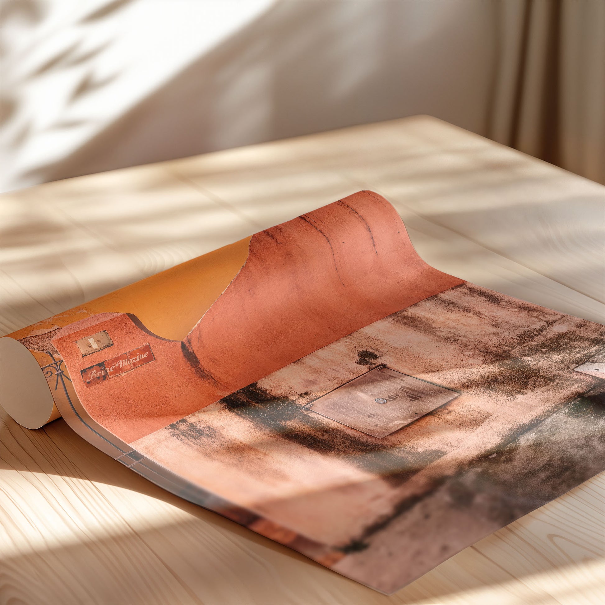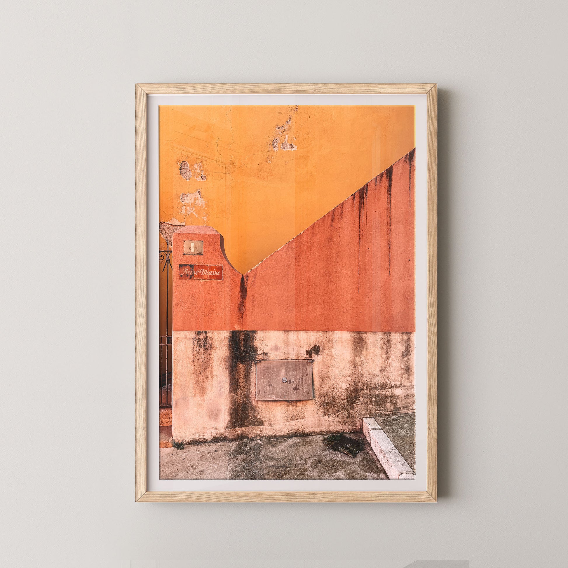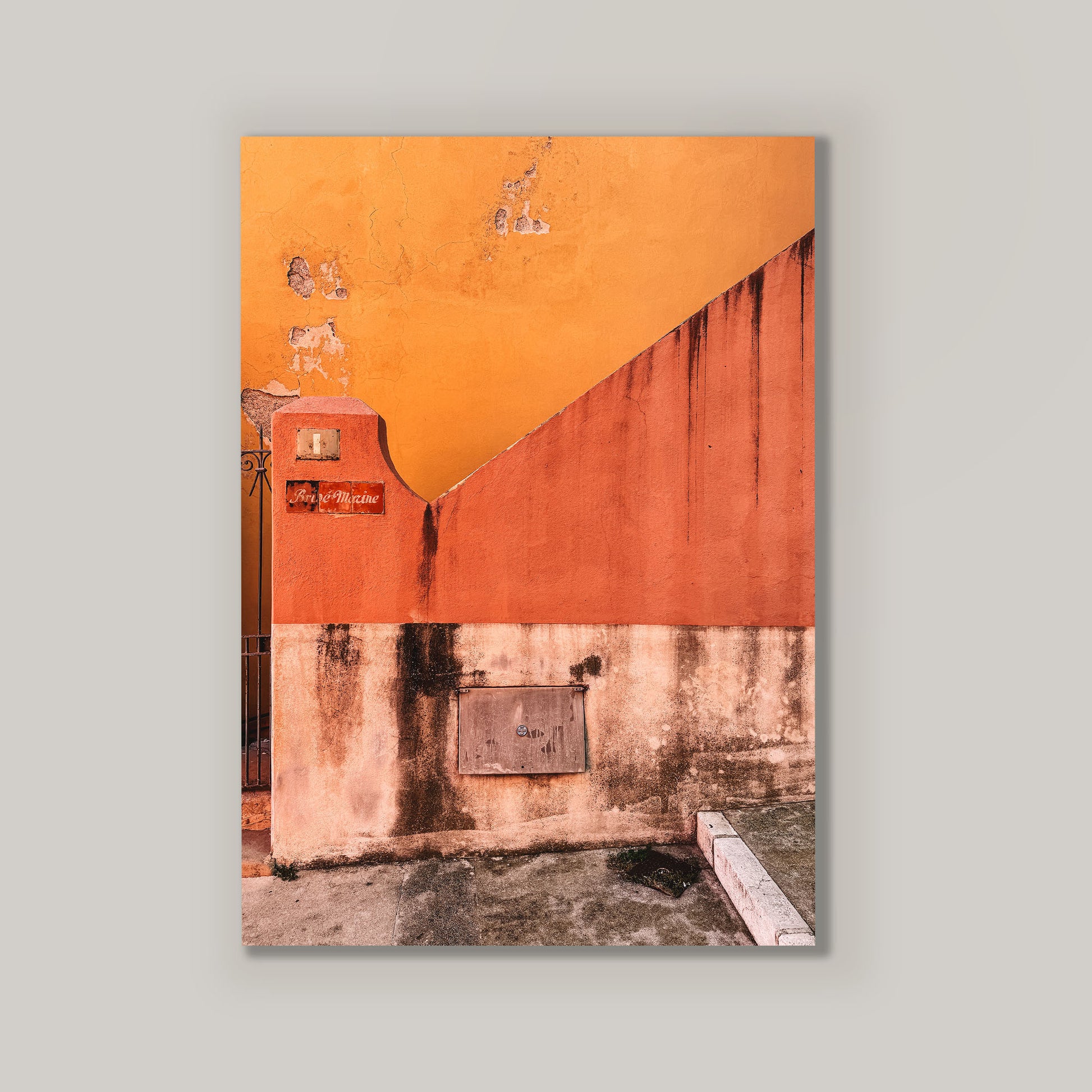 In Good Time is a richly textured architectural photograph that celebrates patience, place, and the quiet beauty of weathered surfaces. Warm terracotta, sunbaked peach, and soft clay tones meet in a striking geometric composition, where peeling plaster and timeworn marks tell a story that only age can write.