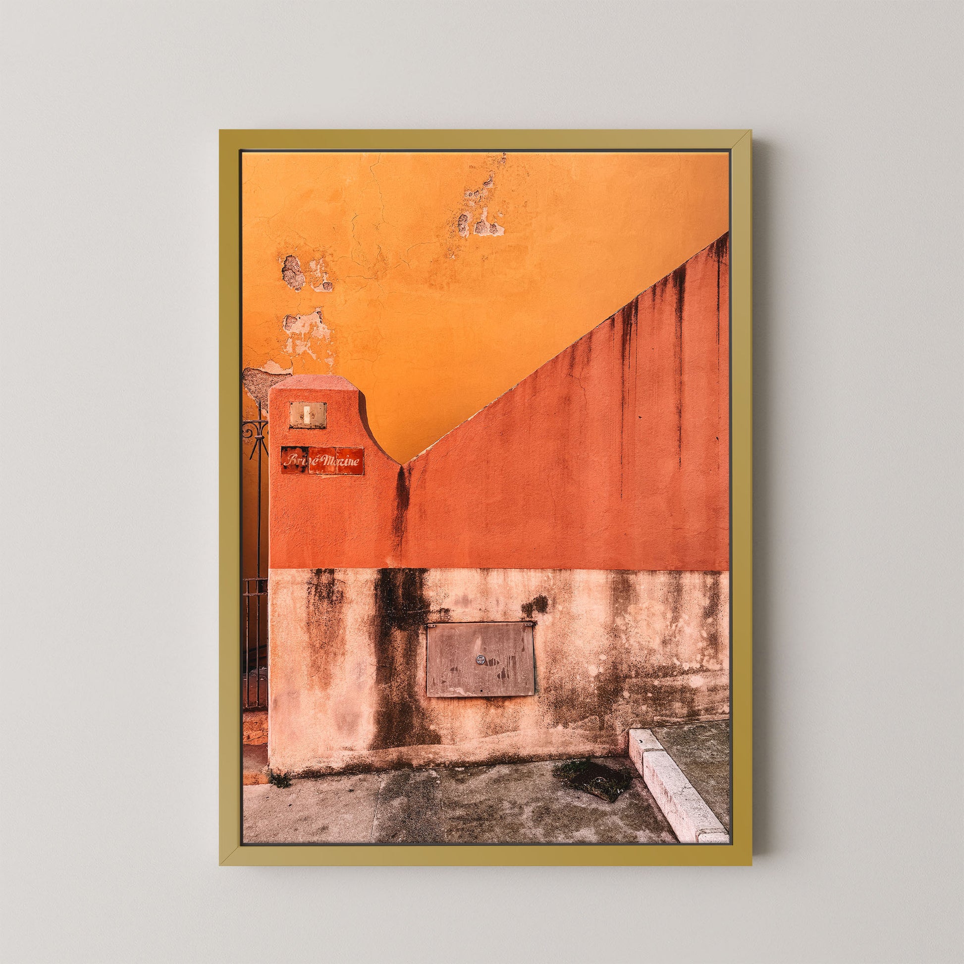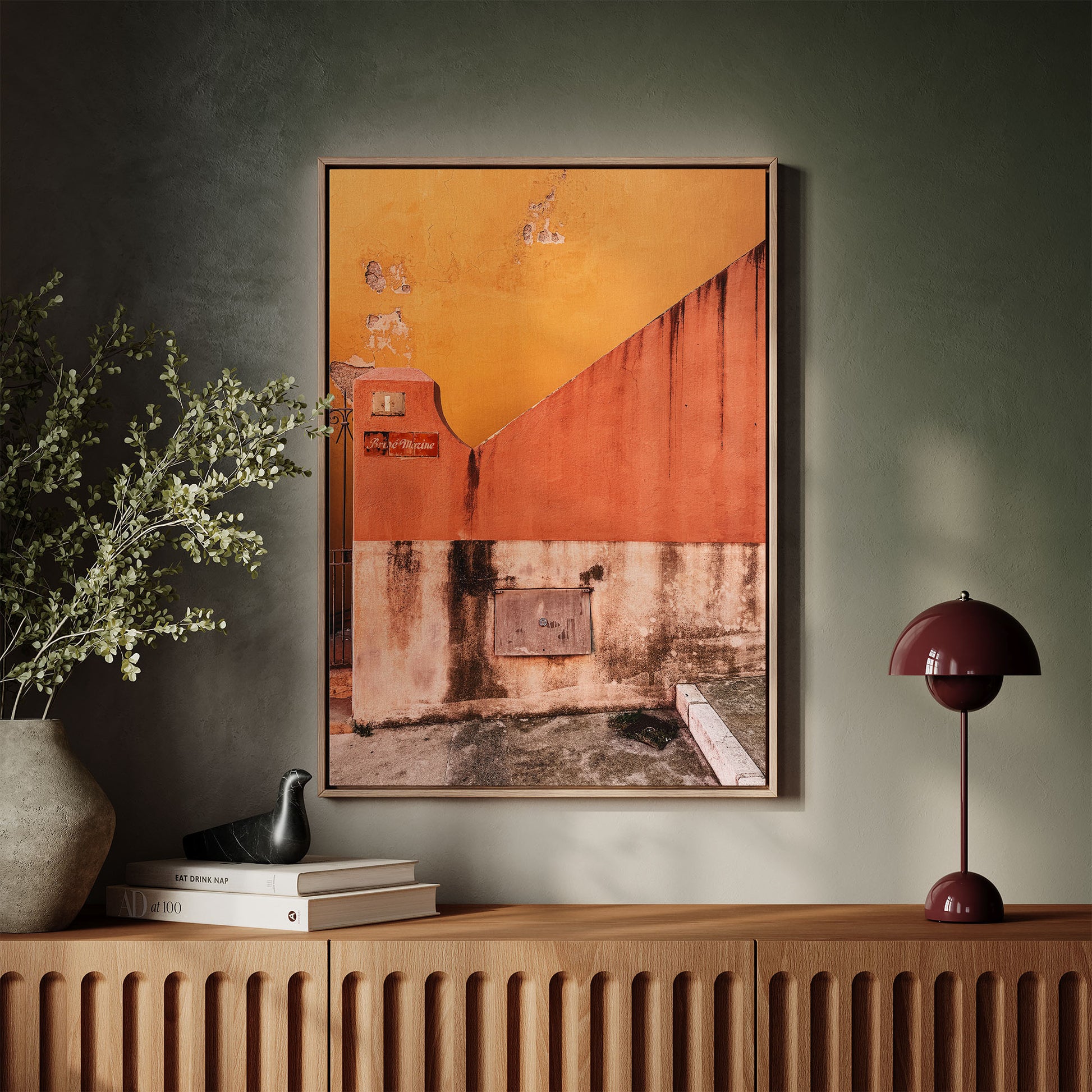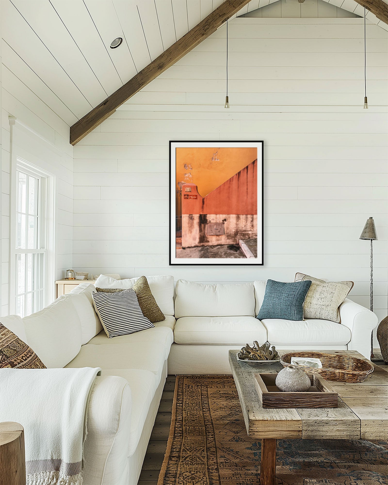 In Good Time is a richly textured architectural photograph that celebrates patience, place, and the quiet beauty of weathered surfaces. Warm terracotta, sunbaked peach, and soft clay tones meet in a striking geometric composition, where peeling plaster and timeworn marks tell a story that only age can write.
