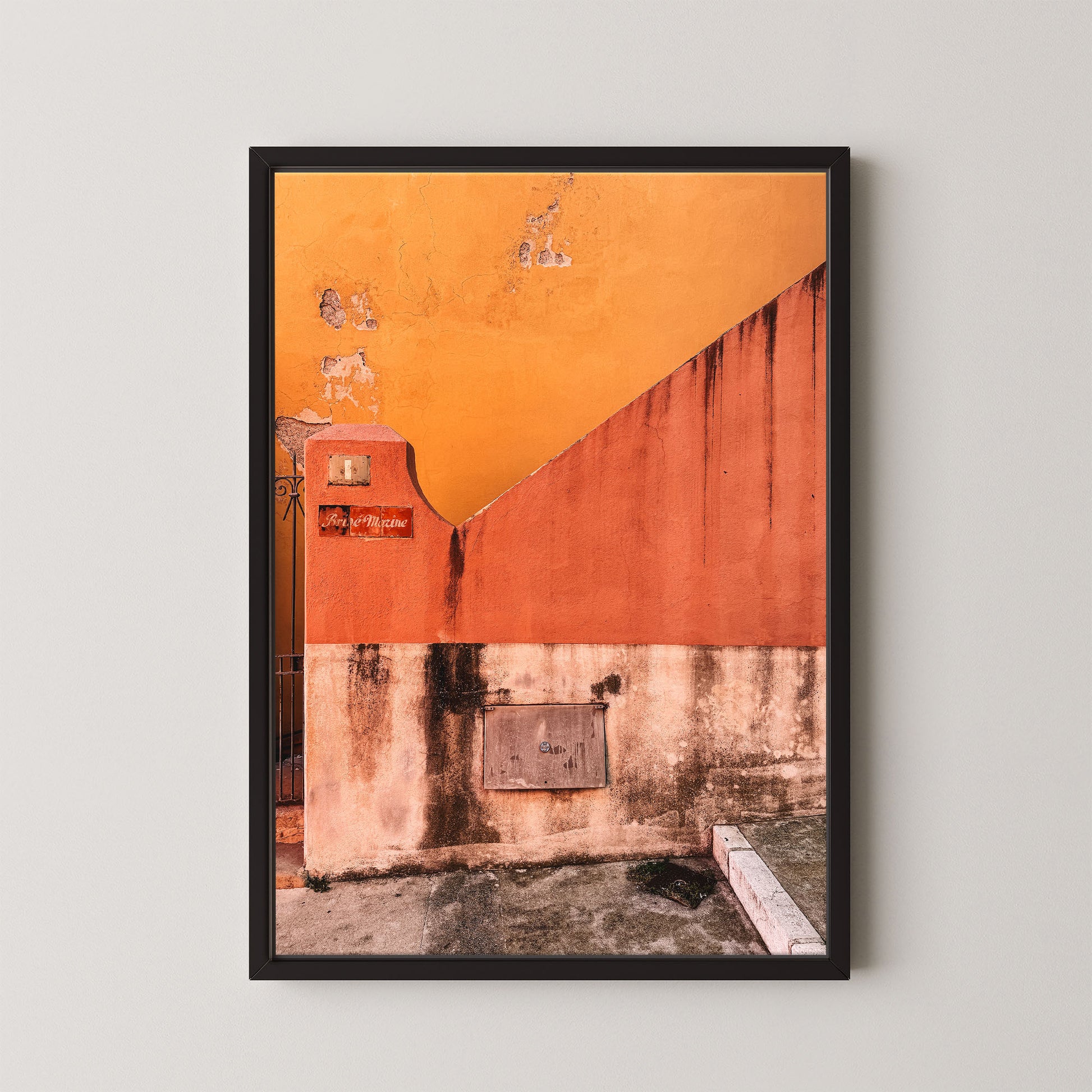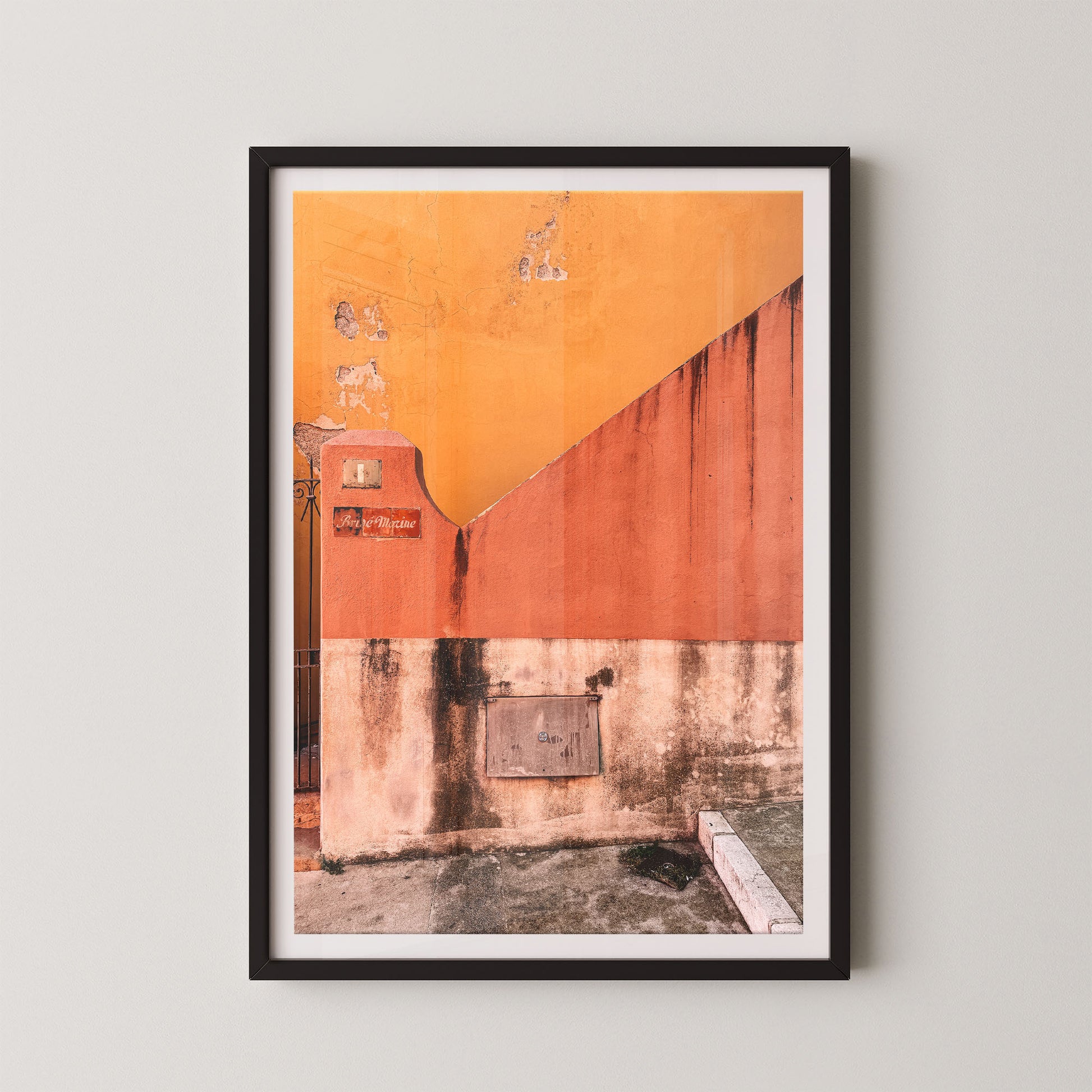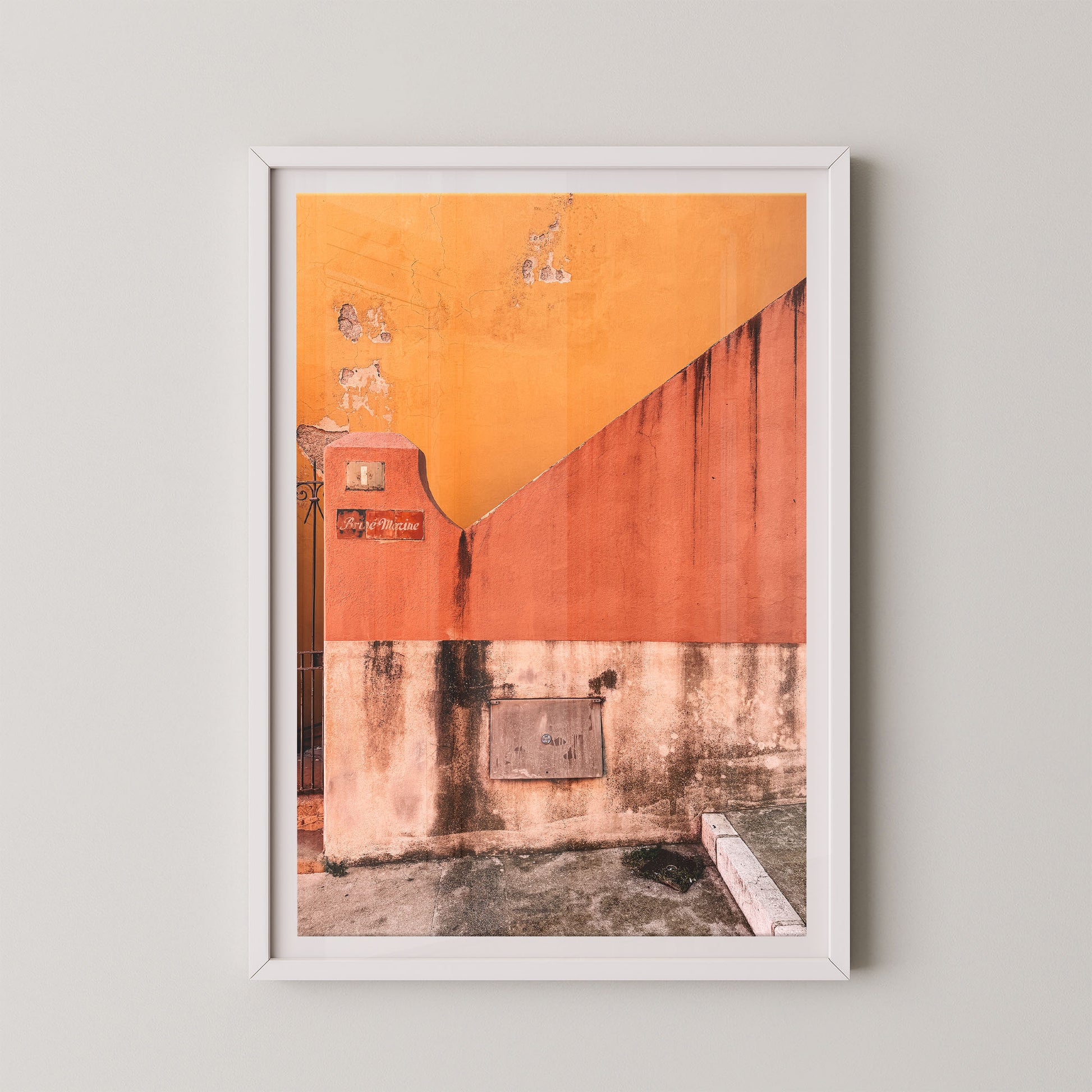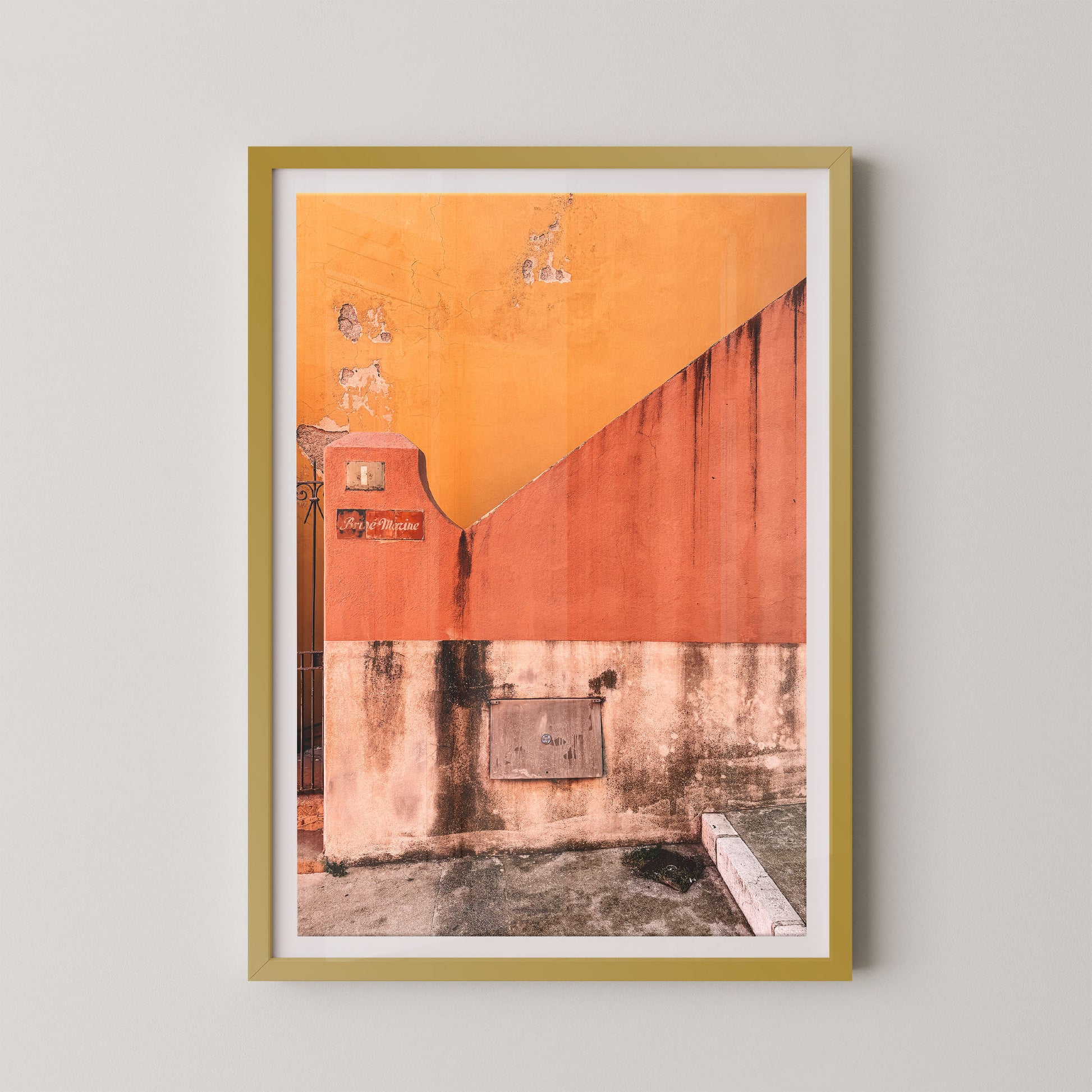 In Good Time is a richly textured architectural photograph that celebrates patience, place, and the quiet beauty of weathered surfaces. Warm terracotta, sunbaked peach, and soft clay tones meet in a striking geometric composition, where peeling plaster and timeworn marks tell a story that only age can write.