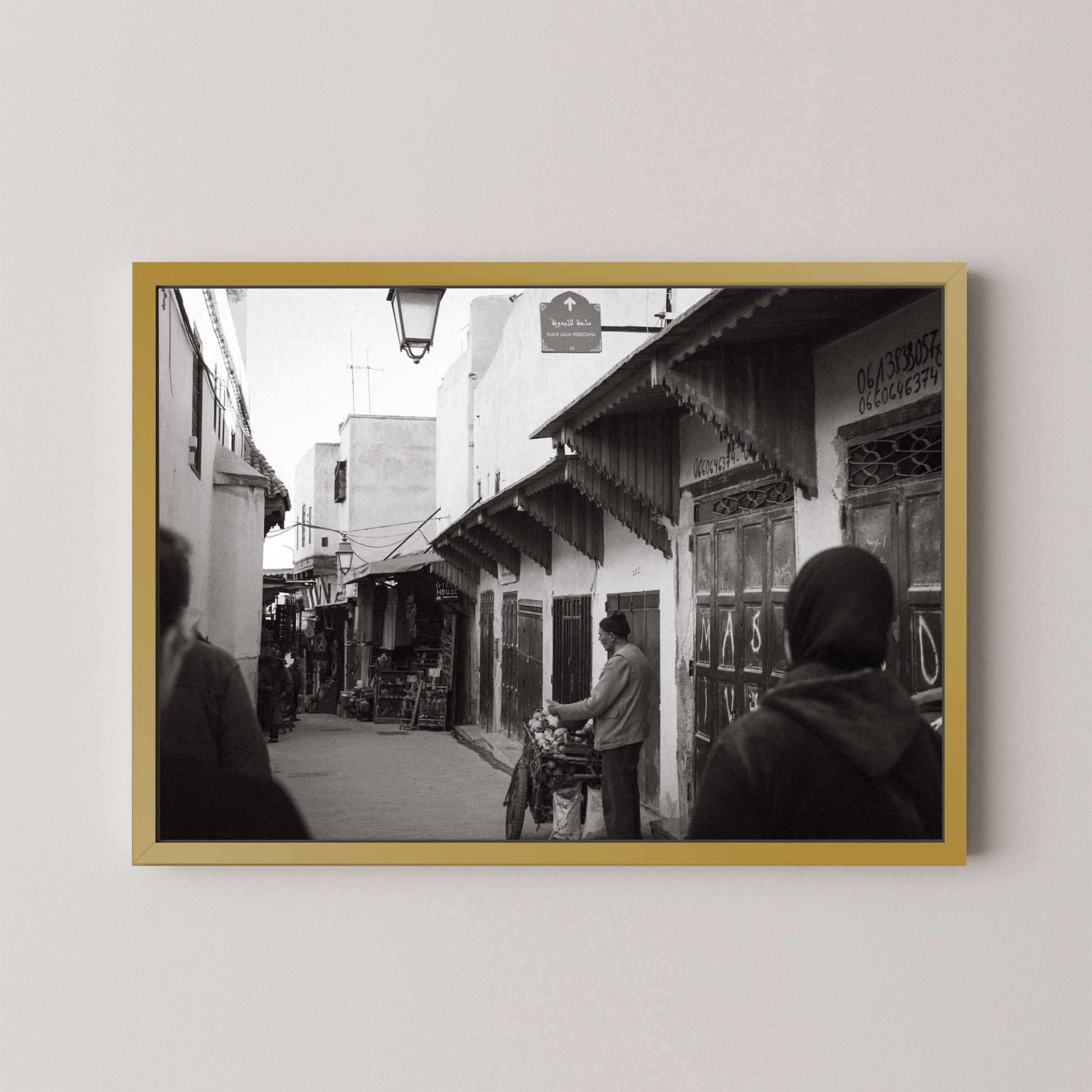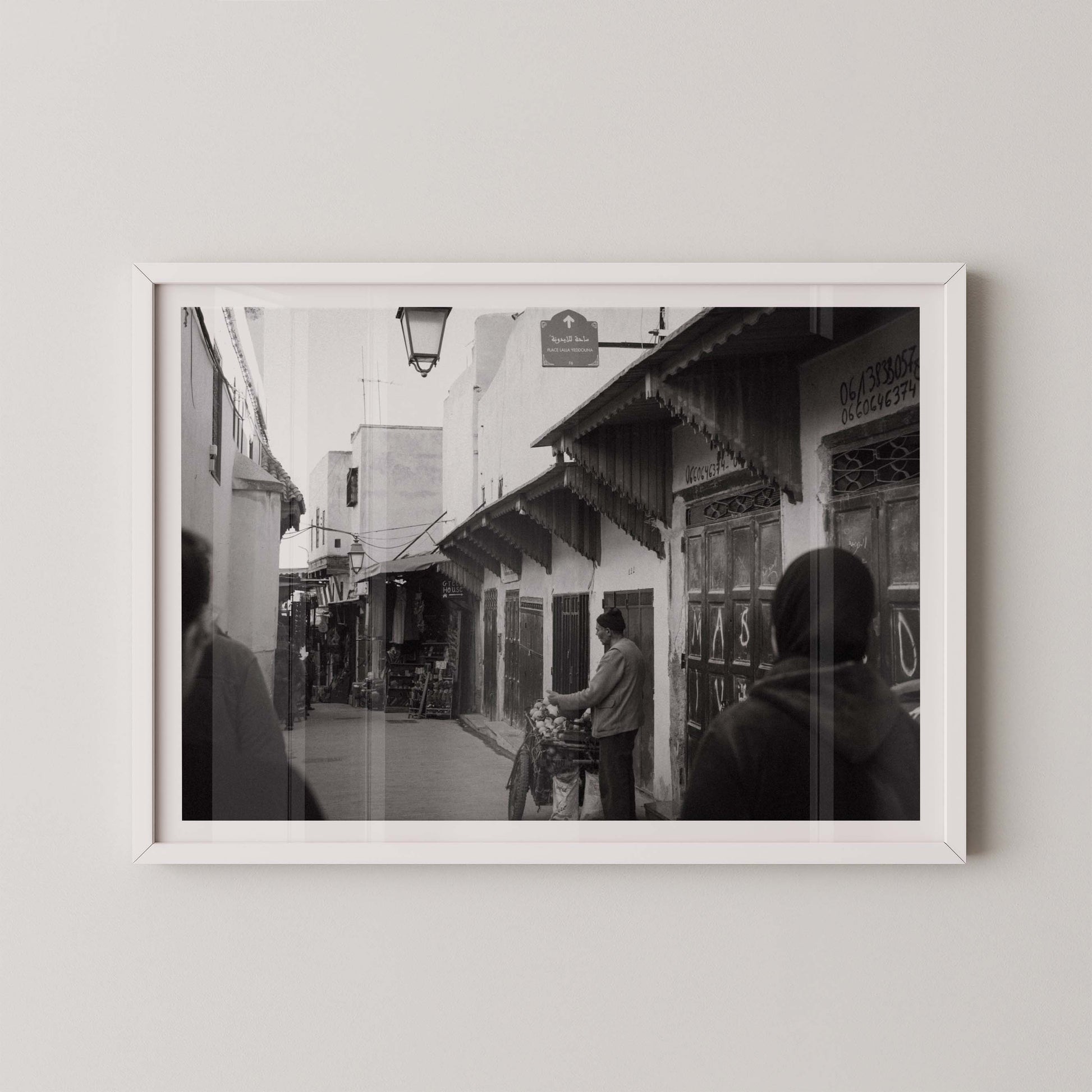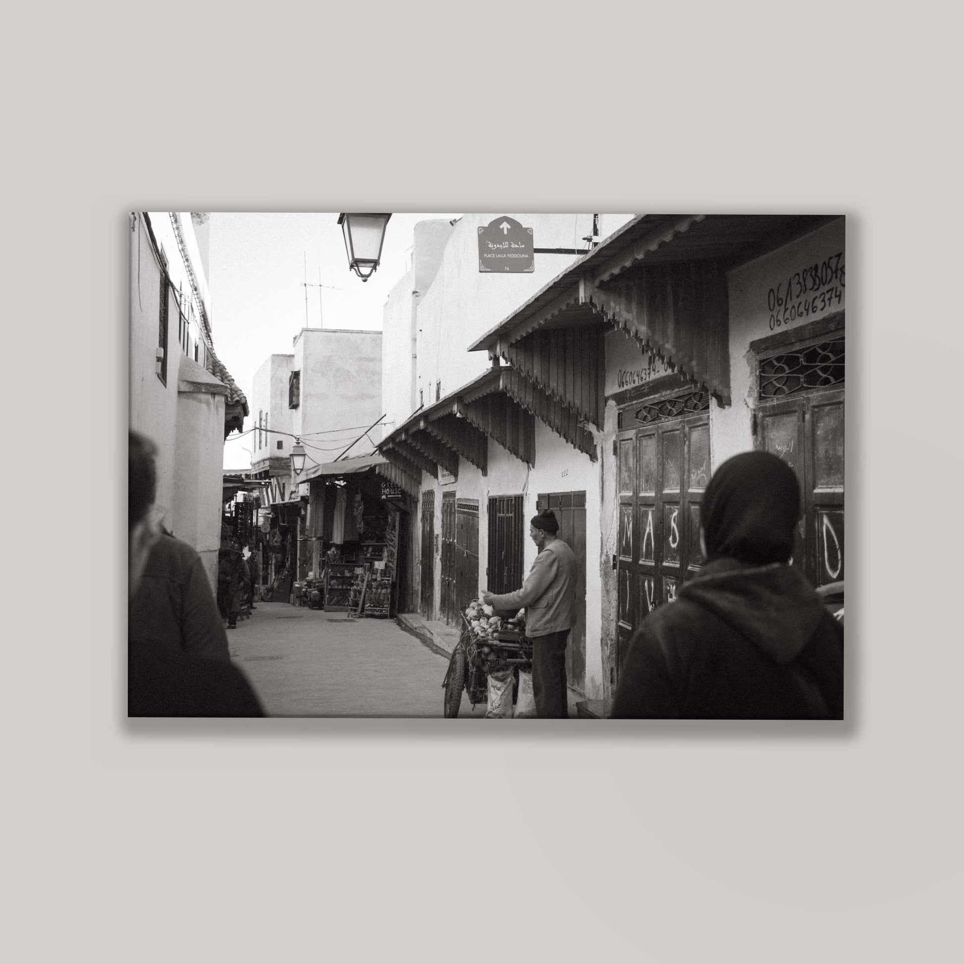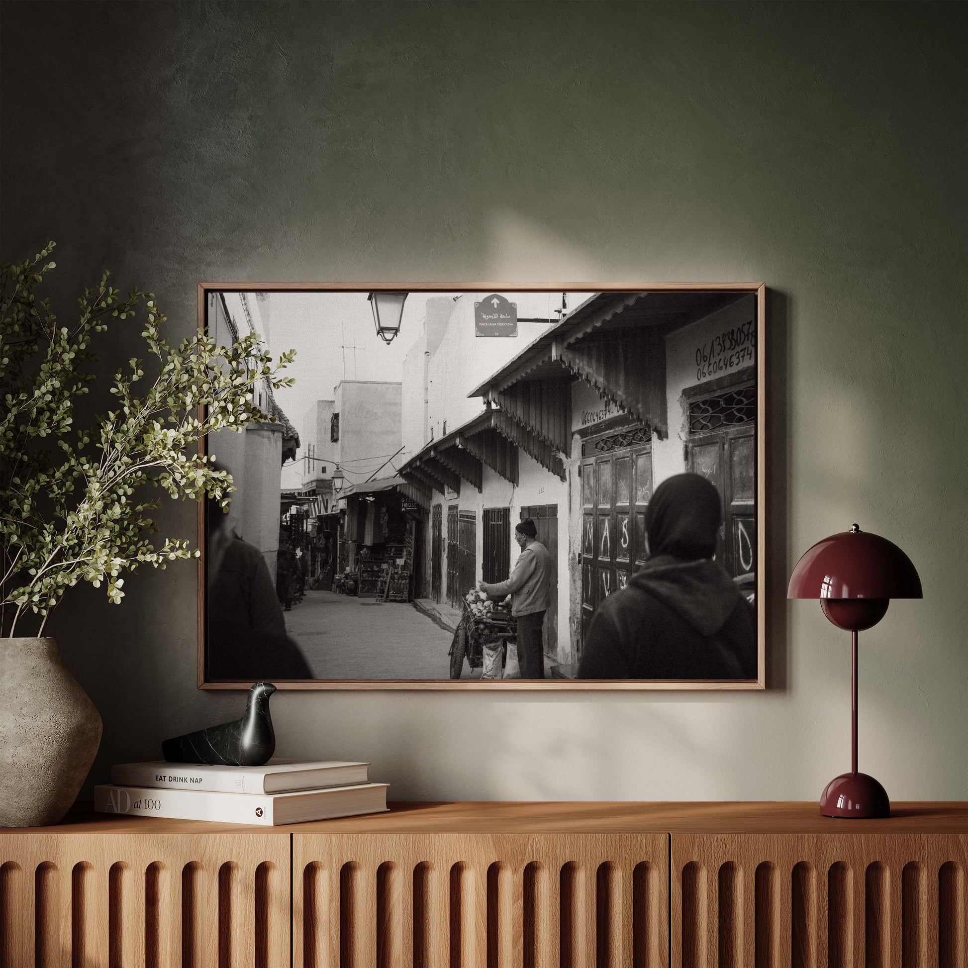 "Moody Market" captures a fleeting moment in the heart of a Moroccan medina—where quiet exchanges unfold beneath hand-carved eaves and worn shop doors whisper stories of the past. Rendered in timeless black and white, this photograph brings depth, texture, and human presence into any space.