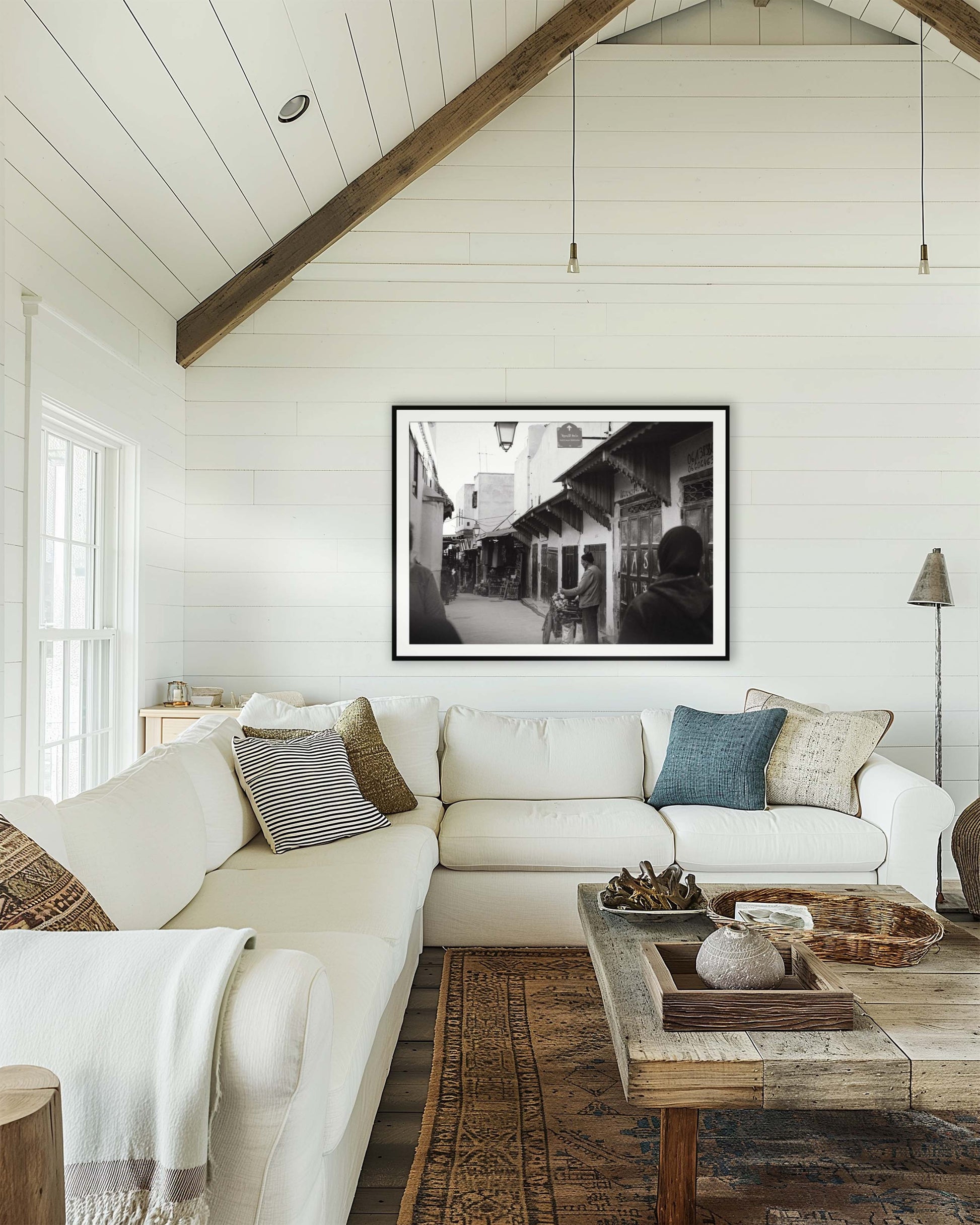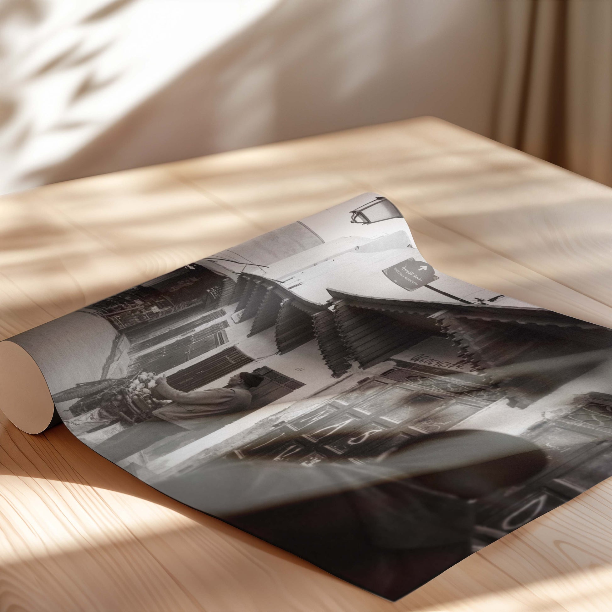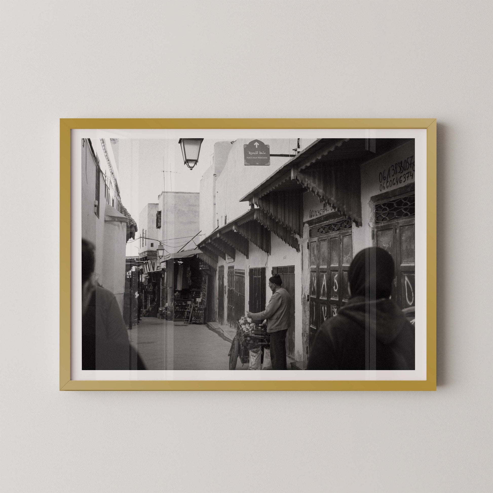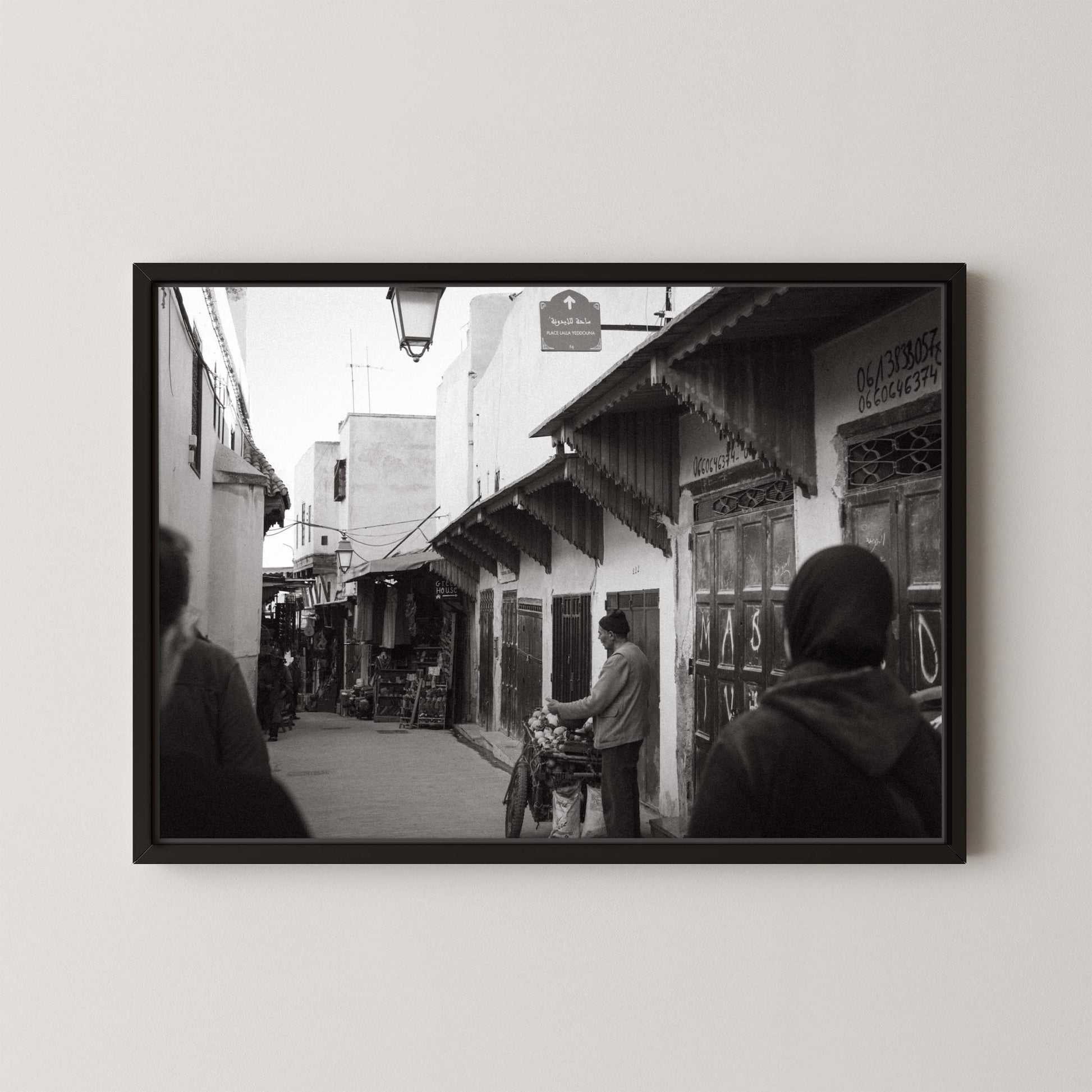 "Moody Market" captures a fleeting moment in the heart of a Moroccan medina—where quiet exchanges unfold beneath hand-carved eaves and worn shop doors whisper stories of the past. Rendered in timeless black and white, this photograph brings depth, texture, and human presence into any space.