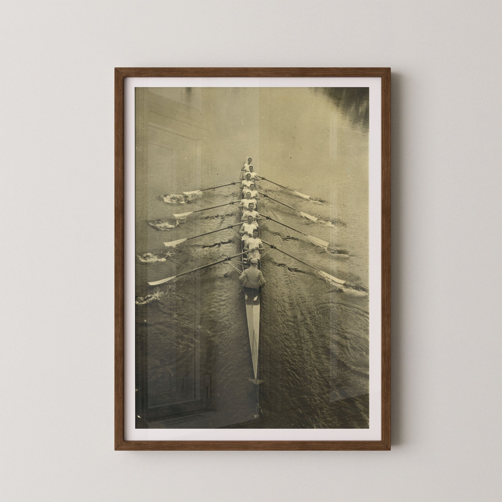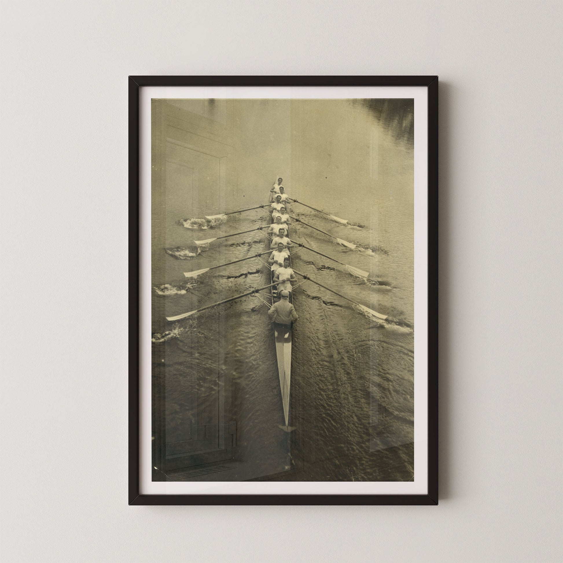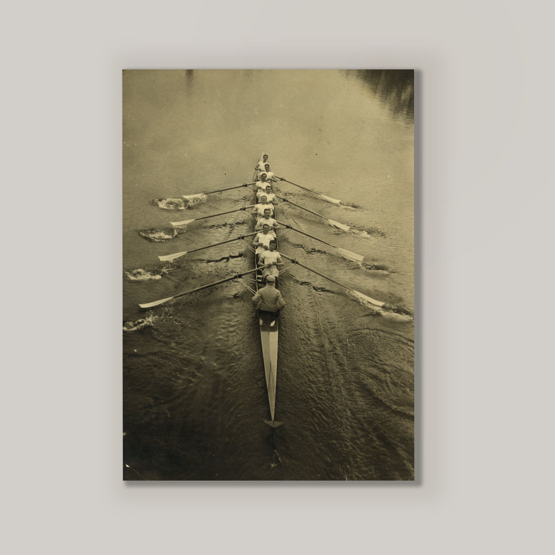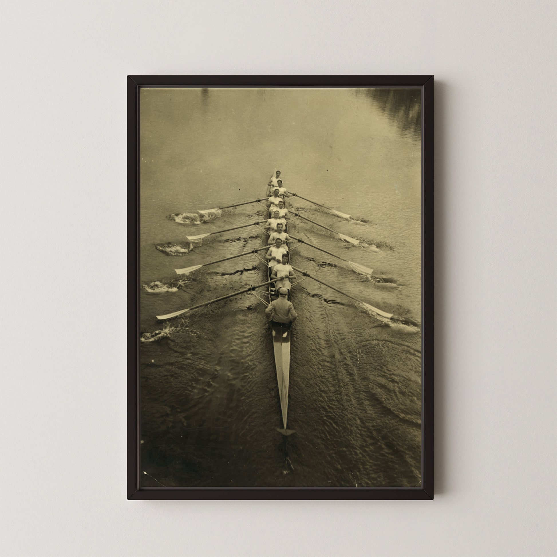 Morning Crew captures the precision, teamwork, and quiet rhythm of dawn on the water. This sepia-toned vintage photograph features a rowing team in perfect unison, cutting through still waters with grace and discipline — a timeless celebration of human endurance, coordination, and calm focus.