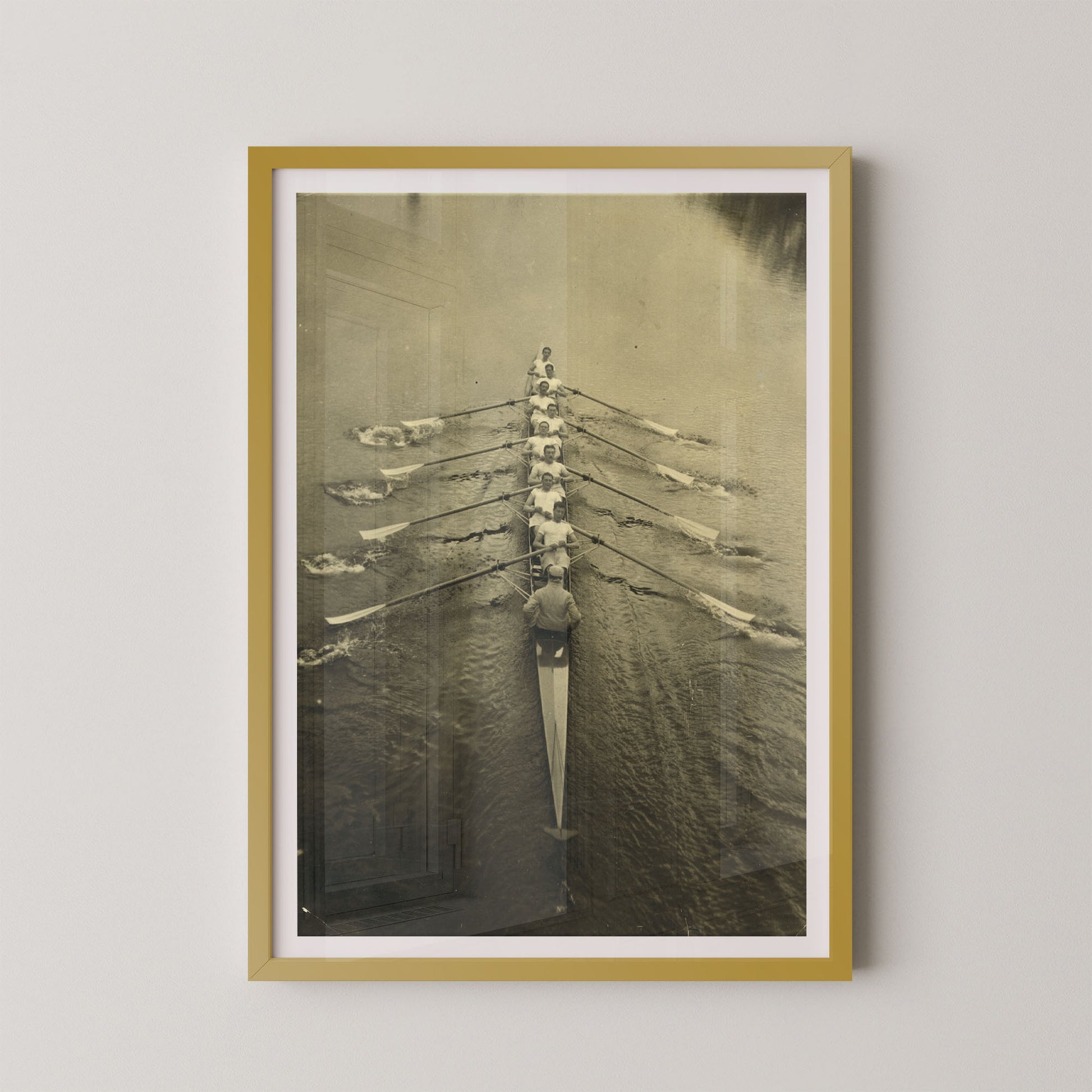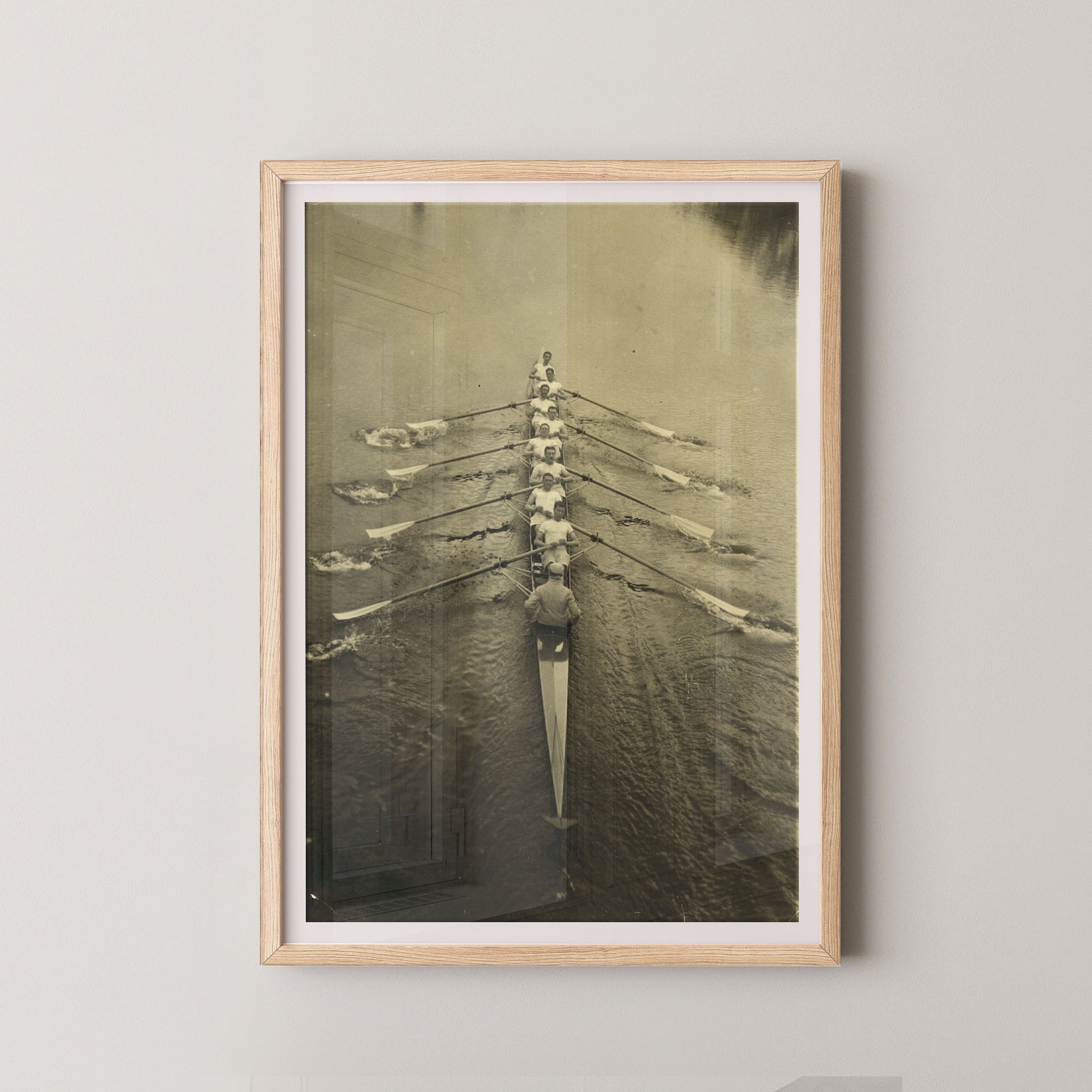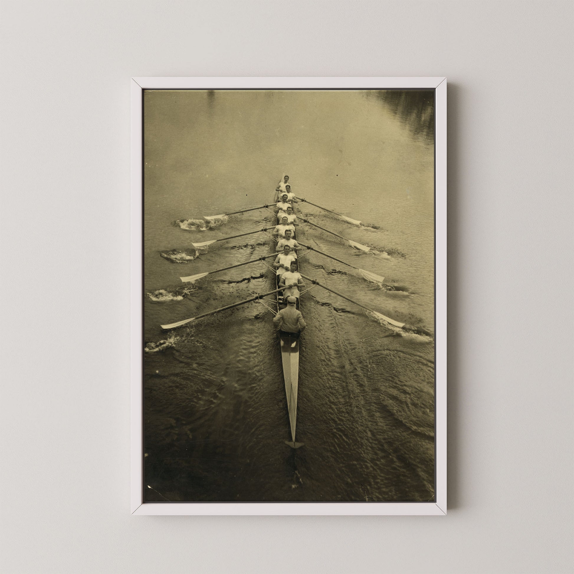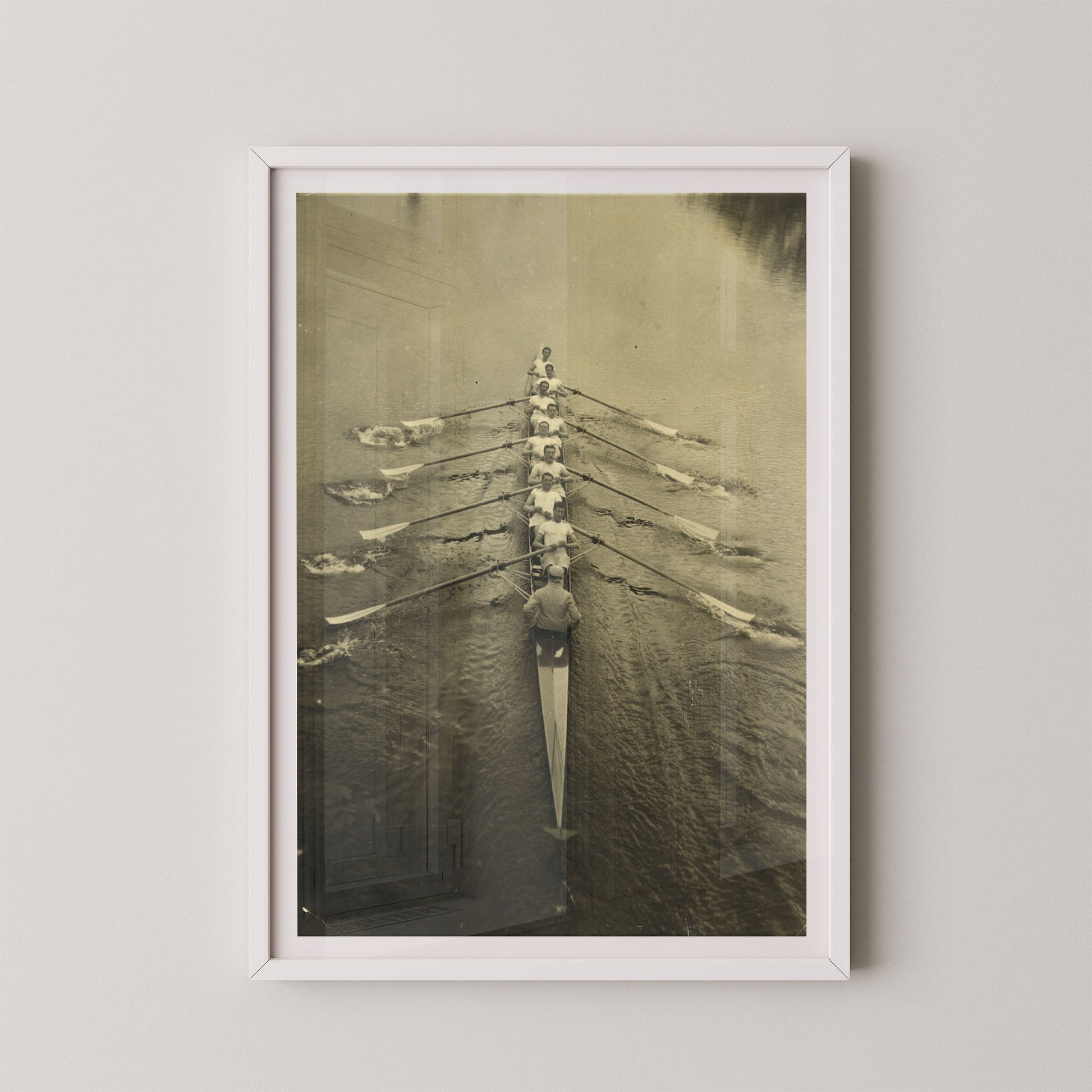 Morning Crew captures the precision, teamwork, and quiet rhythm of dawn on the water. This sepia-toned vintage photograph features a rowing team in perfect unison, cutting through still waters with grace and discipline — a timeless celebration of human endurance, coordination, and calm focus.