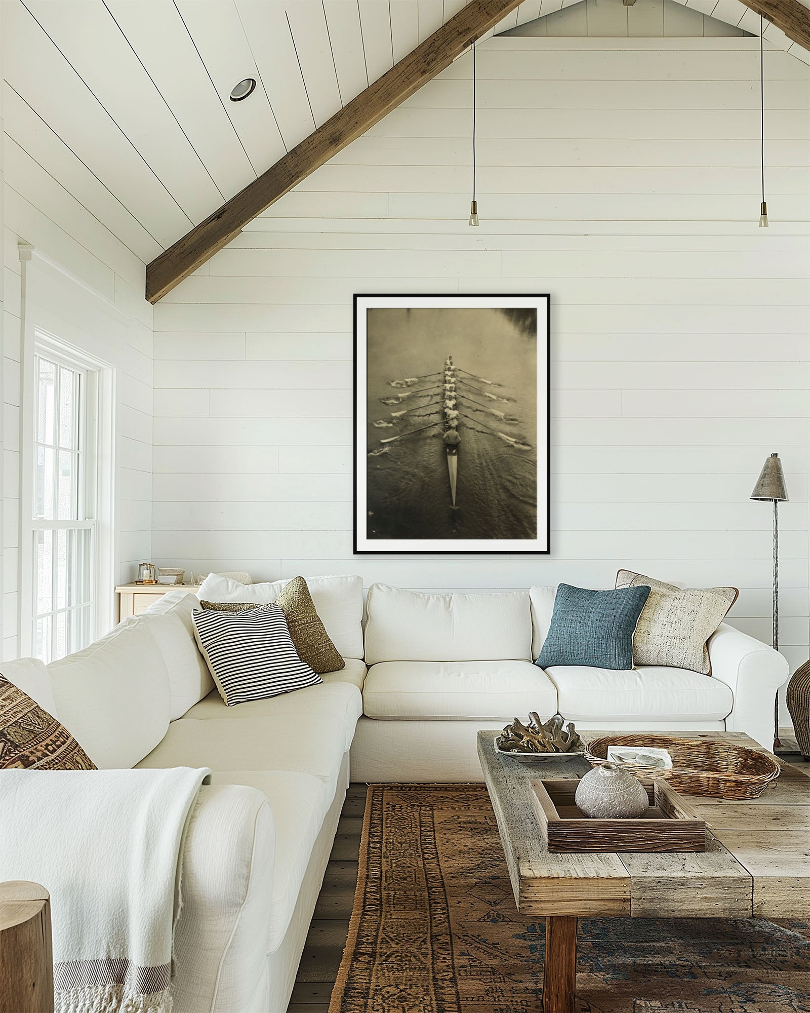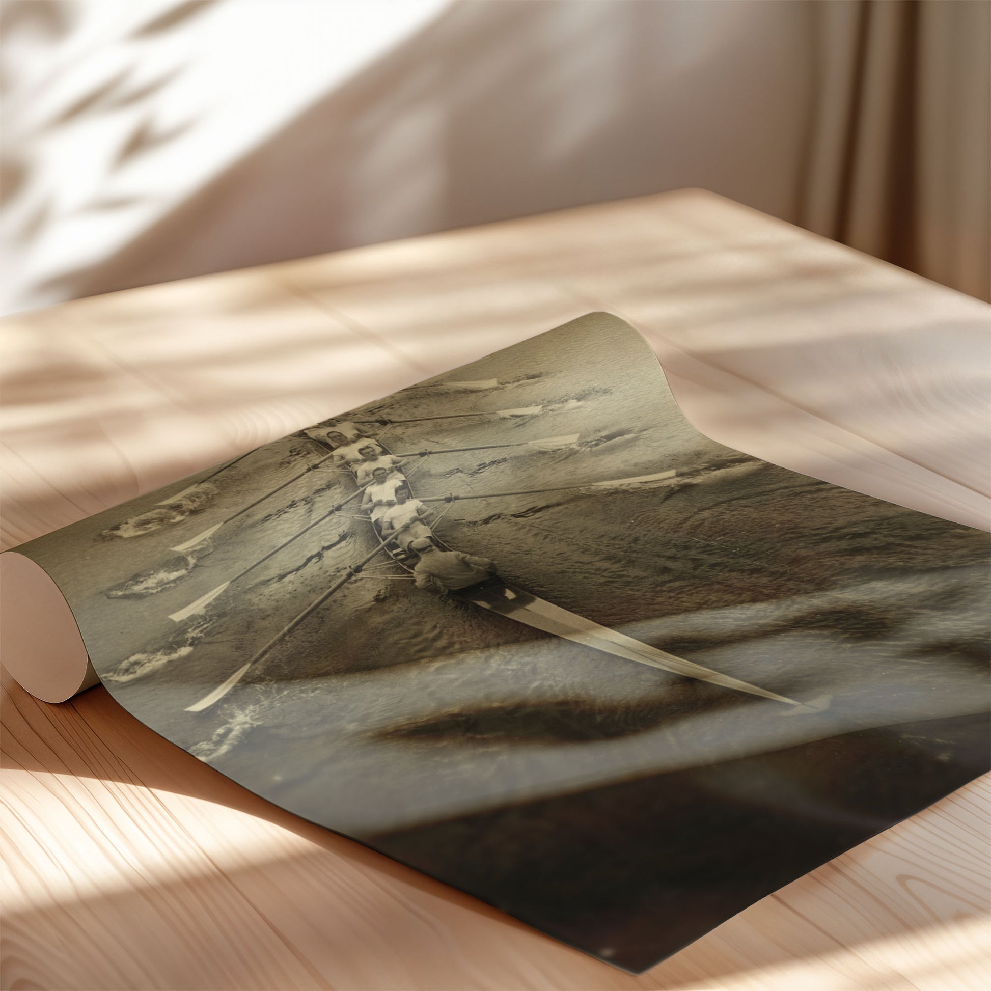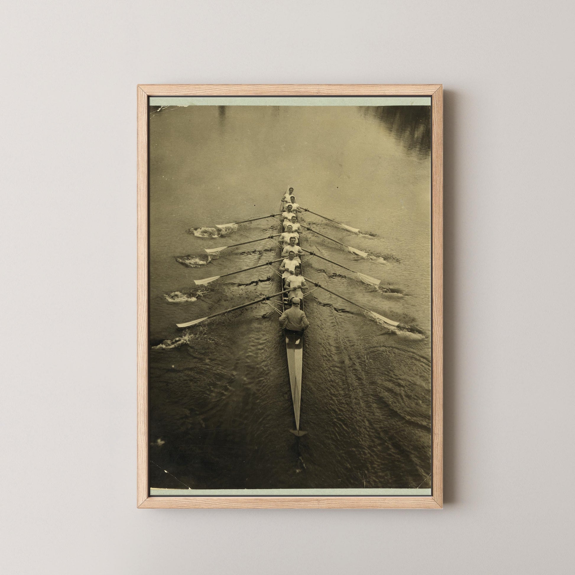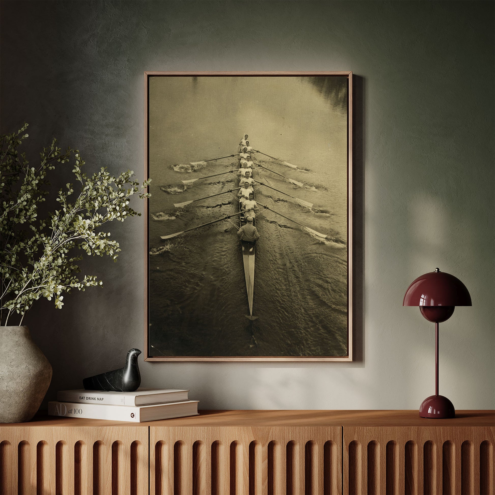 Morning Crew captures the precision, teamwork, and quiet rhythm of dawn on the water. This sepia-toned vintage photograph features a rowing team in perfect unison, cutting through still waters with grace and discipline — a timeless celebration of human endurance, coordination, and calm focus.