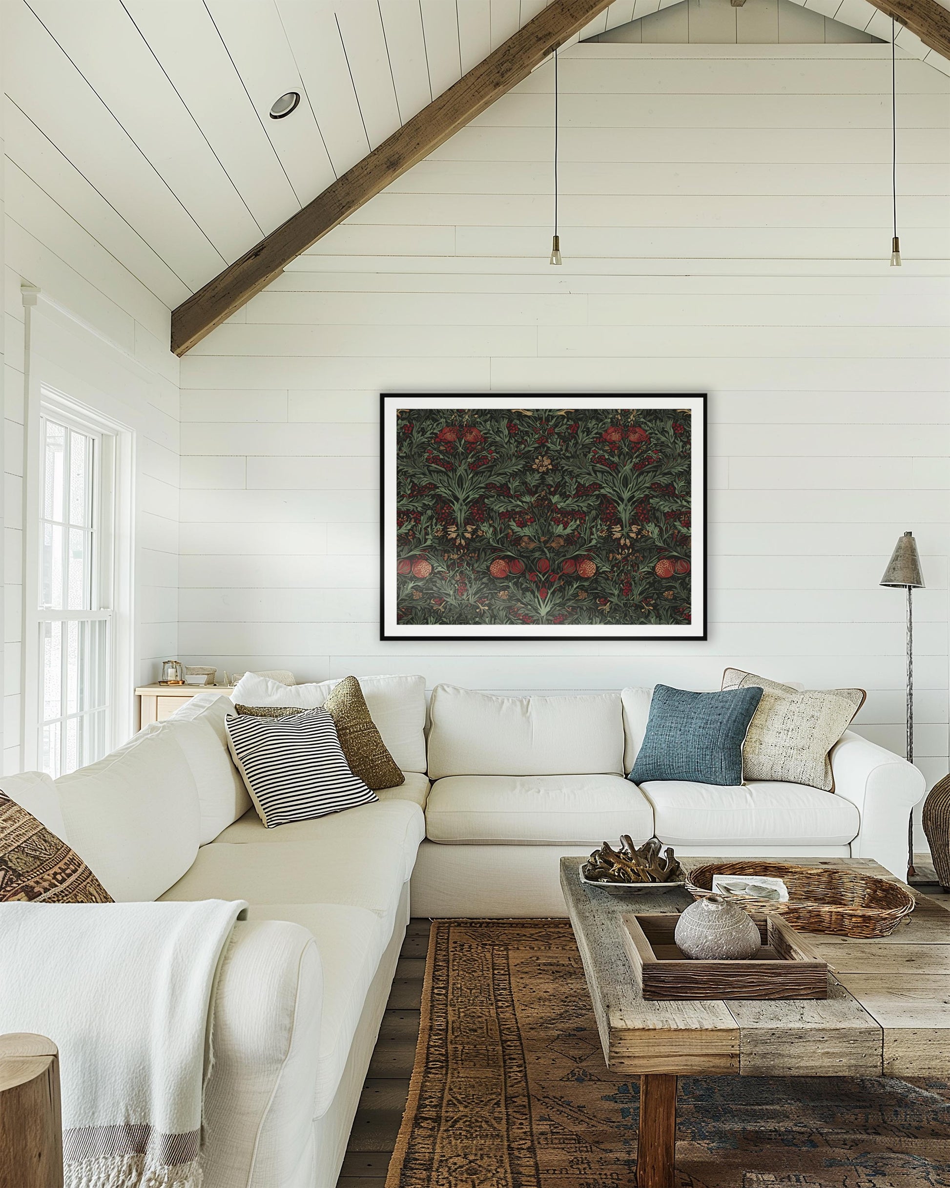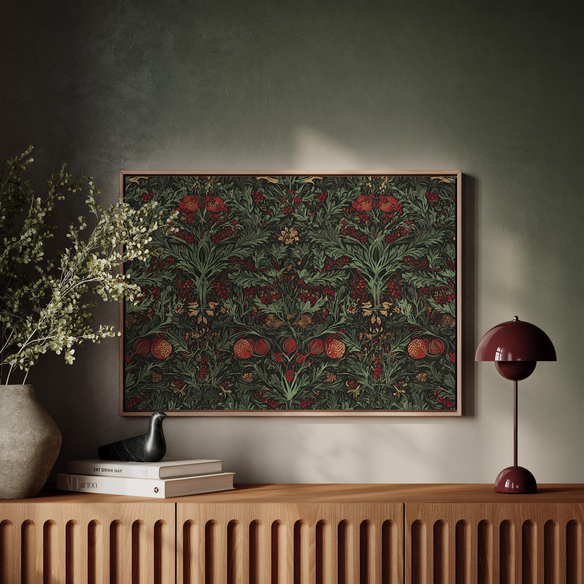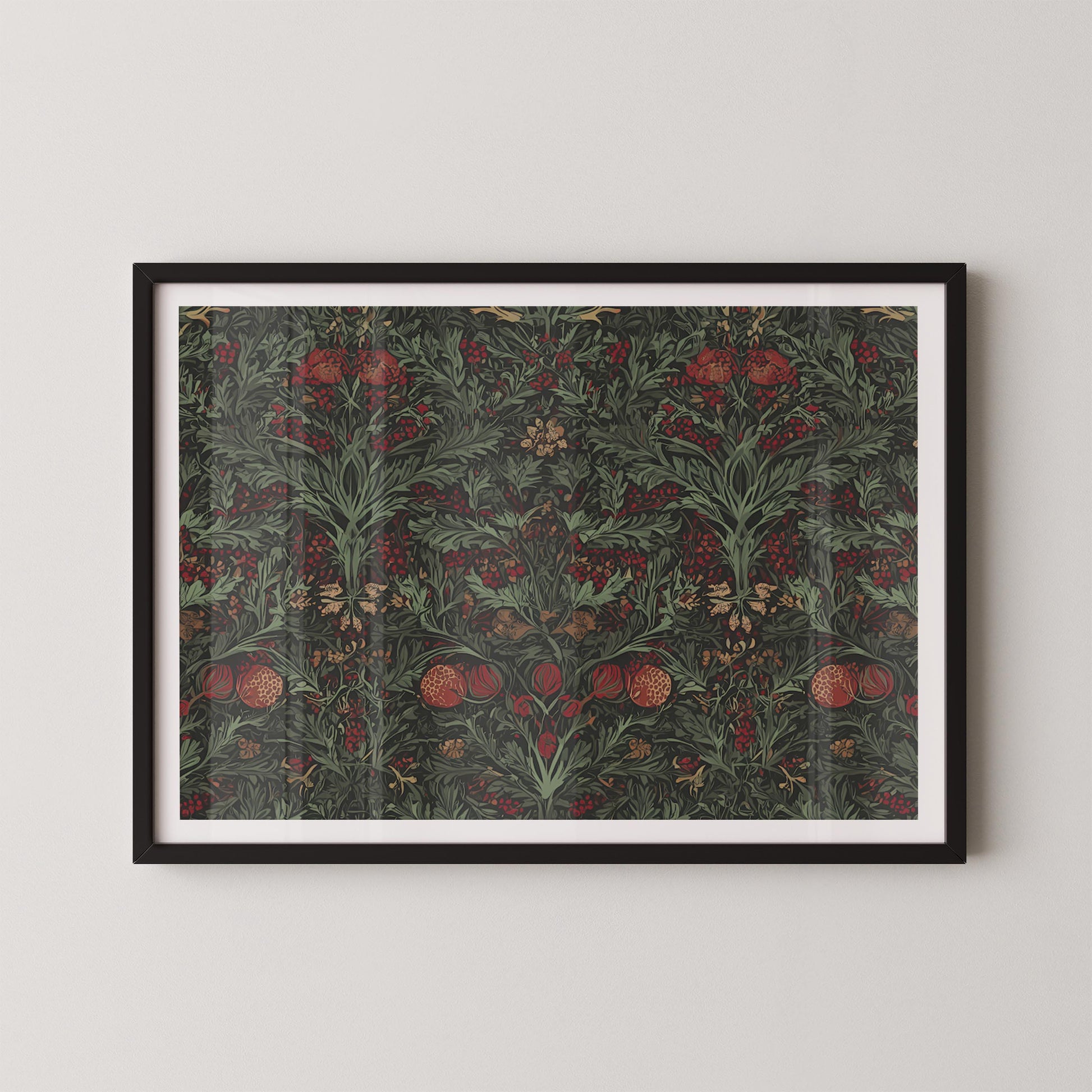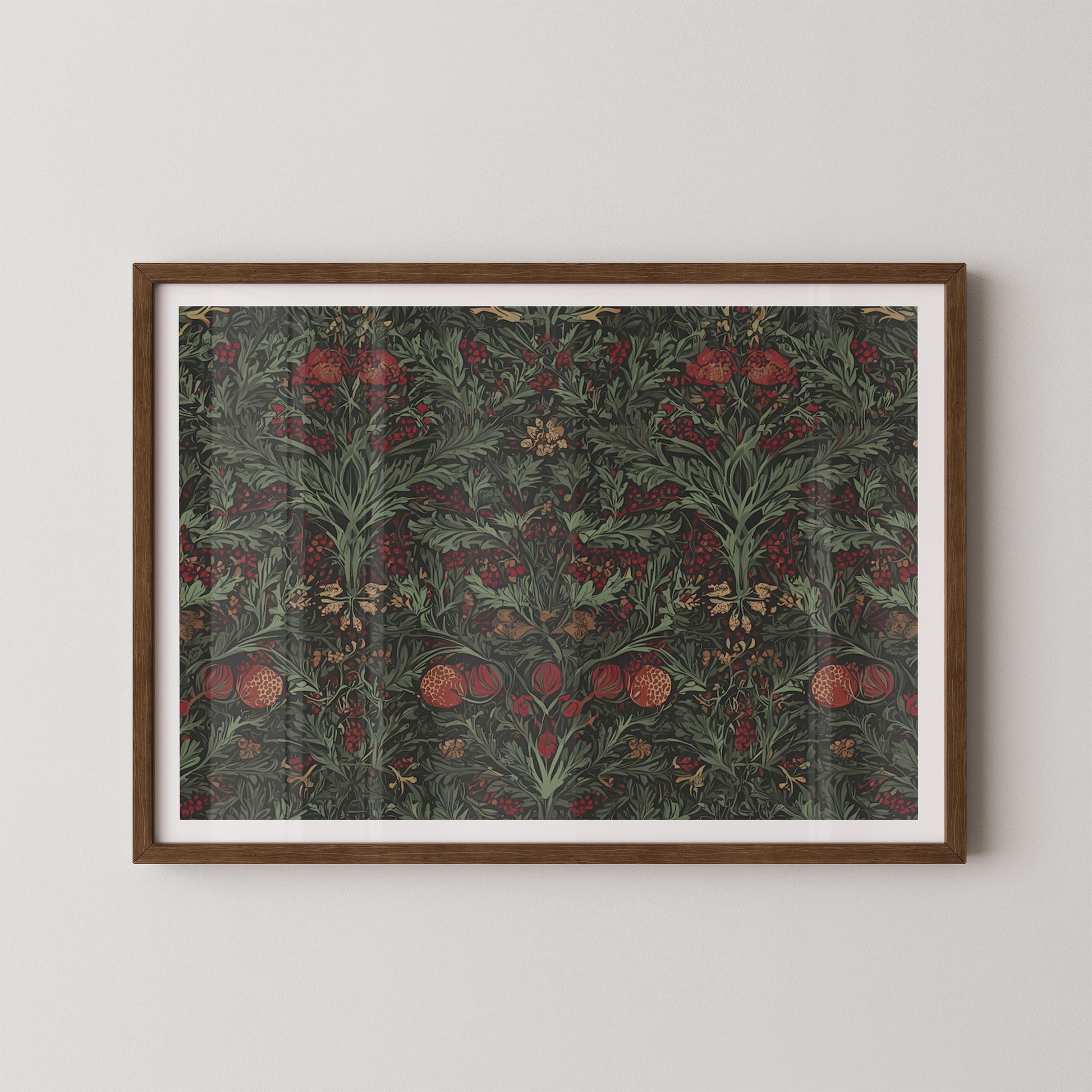 Rich in heritage and holiday spirit, Morris Christmas IV is a stunning art print inspired by William Morris’s timeless botanical patterns. Deep greens, pomegranate reds, and gold accents create a festive tapestry that feels both historic and refined — a perfect nod to the Victorian Christmas aesthetic.