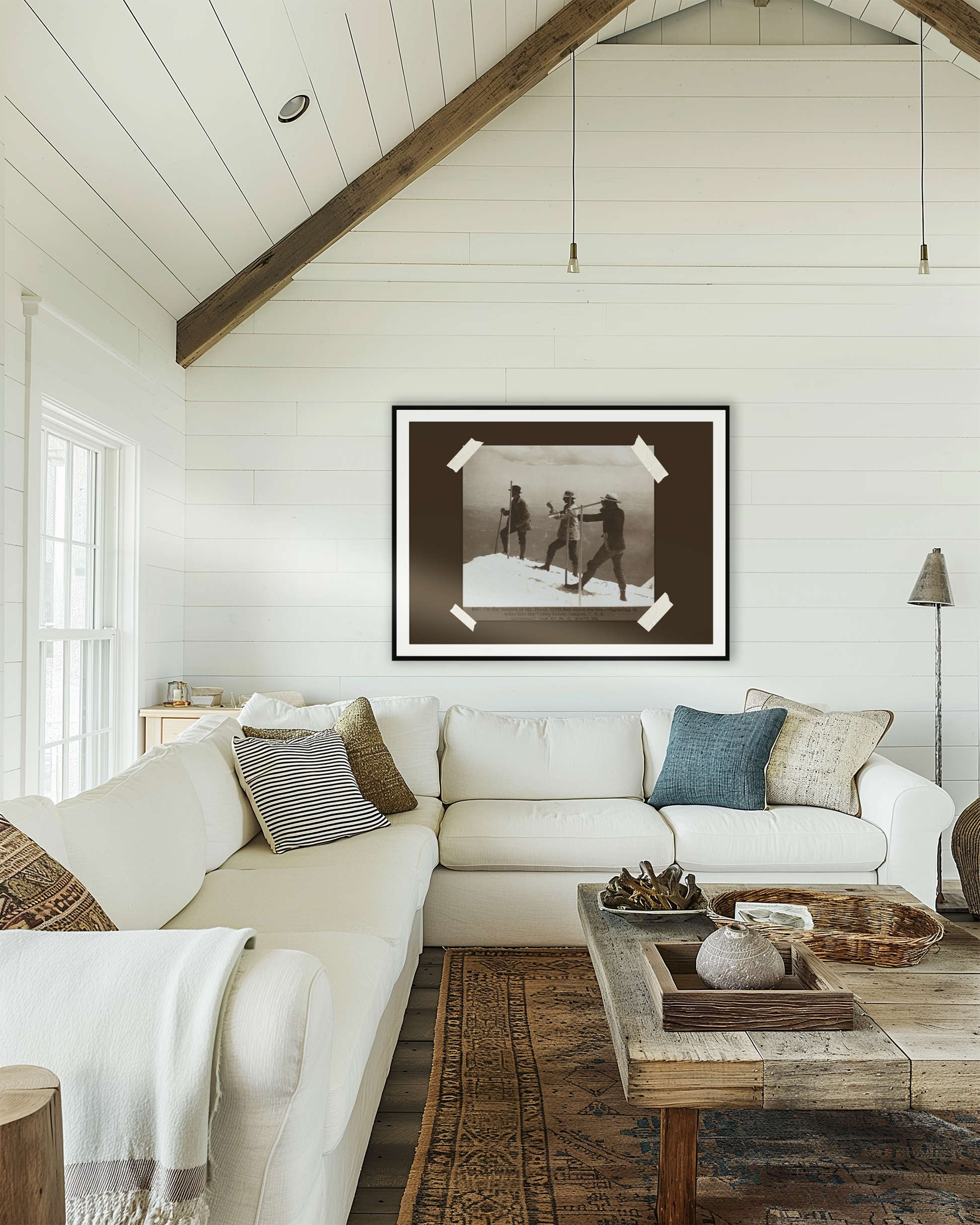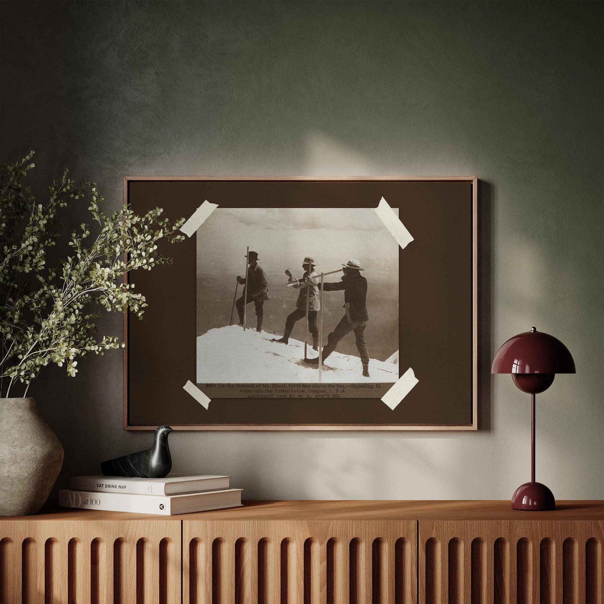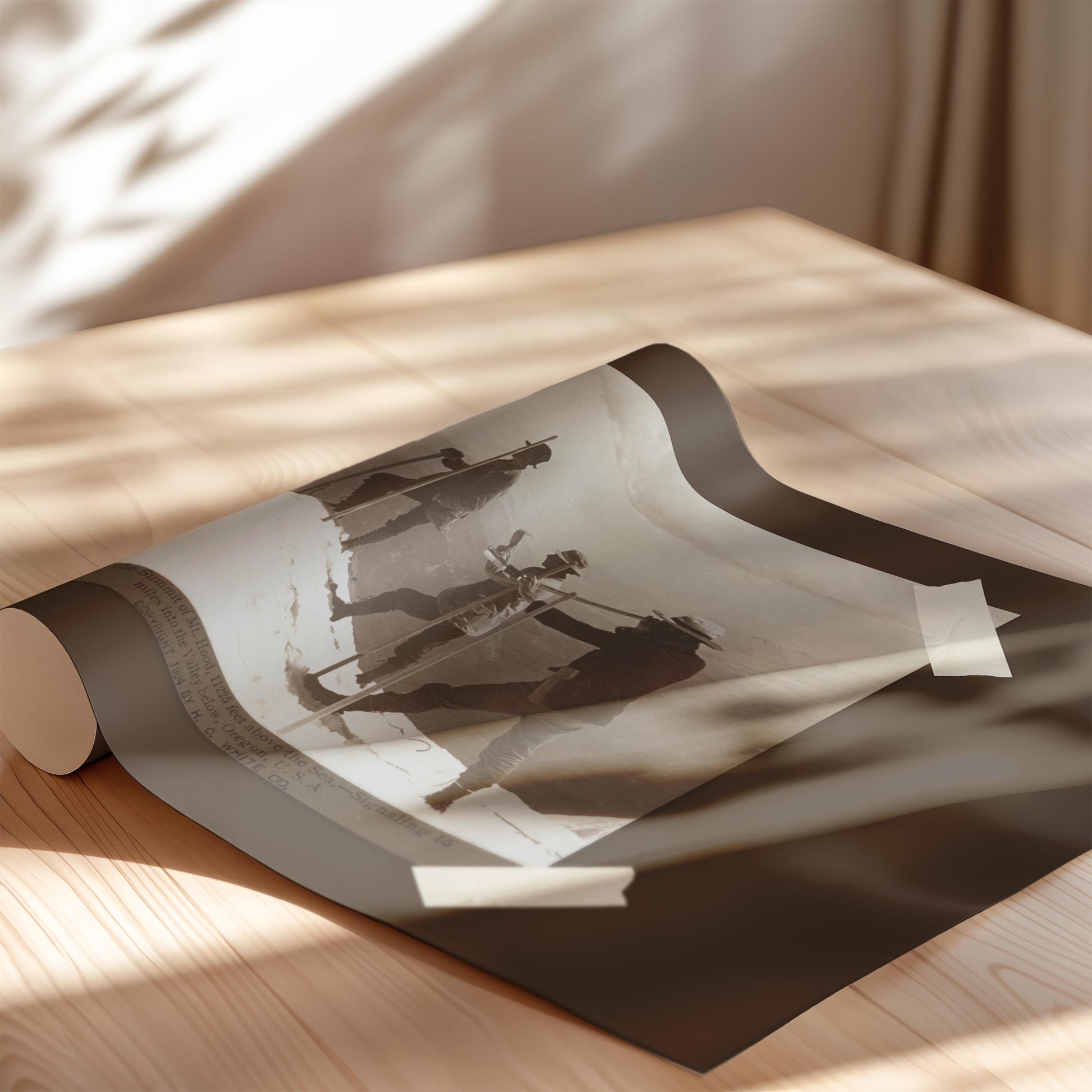 Set against a warm espresso background and framed with subtle vintage tape details, this art print blends historic photography with modern design, making it an ideal piece for cabins, lodges, and travel-inspired interiors.