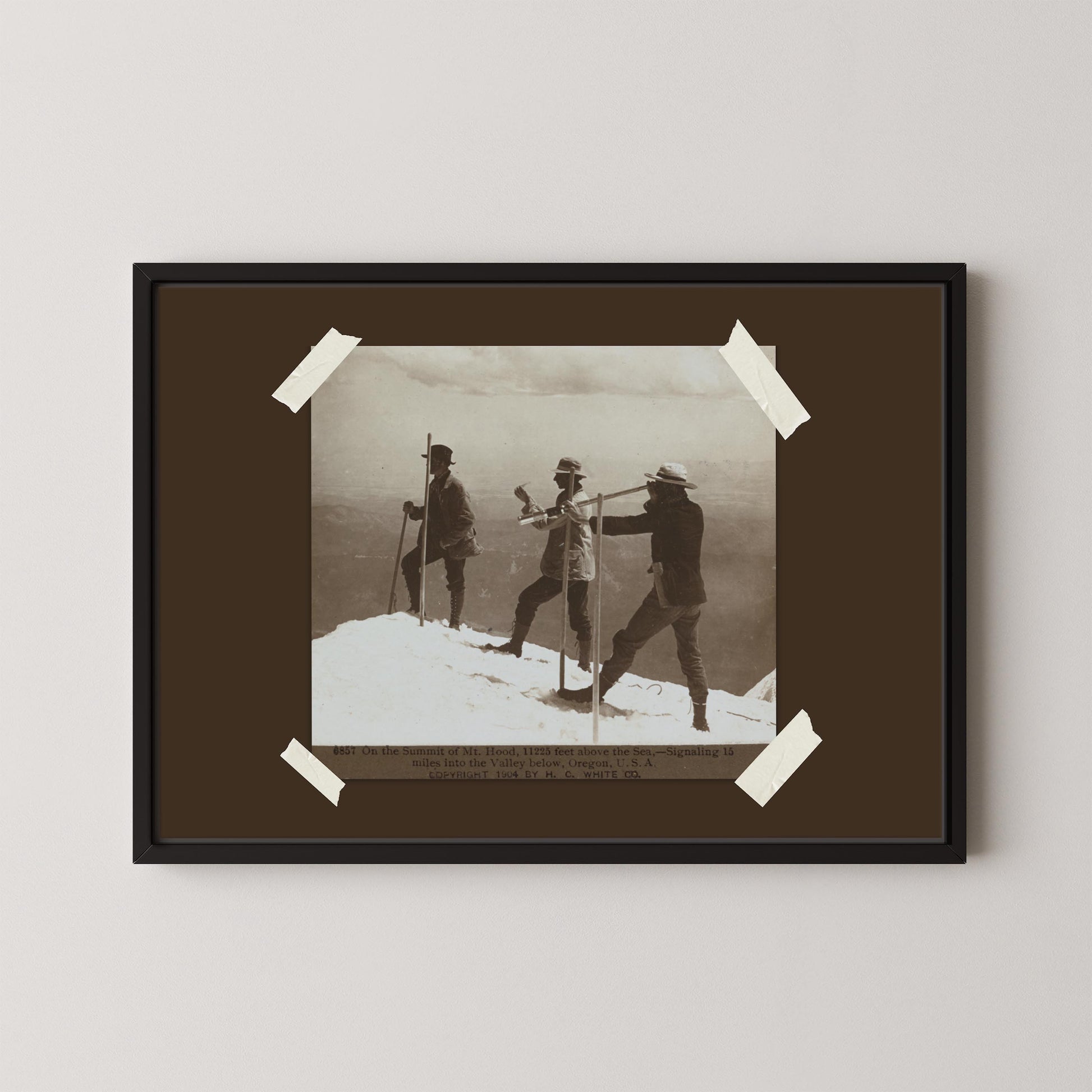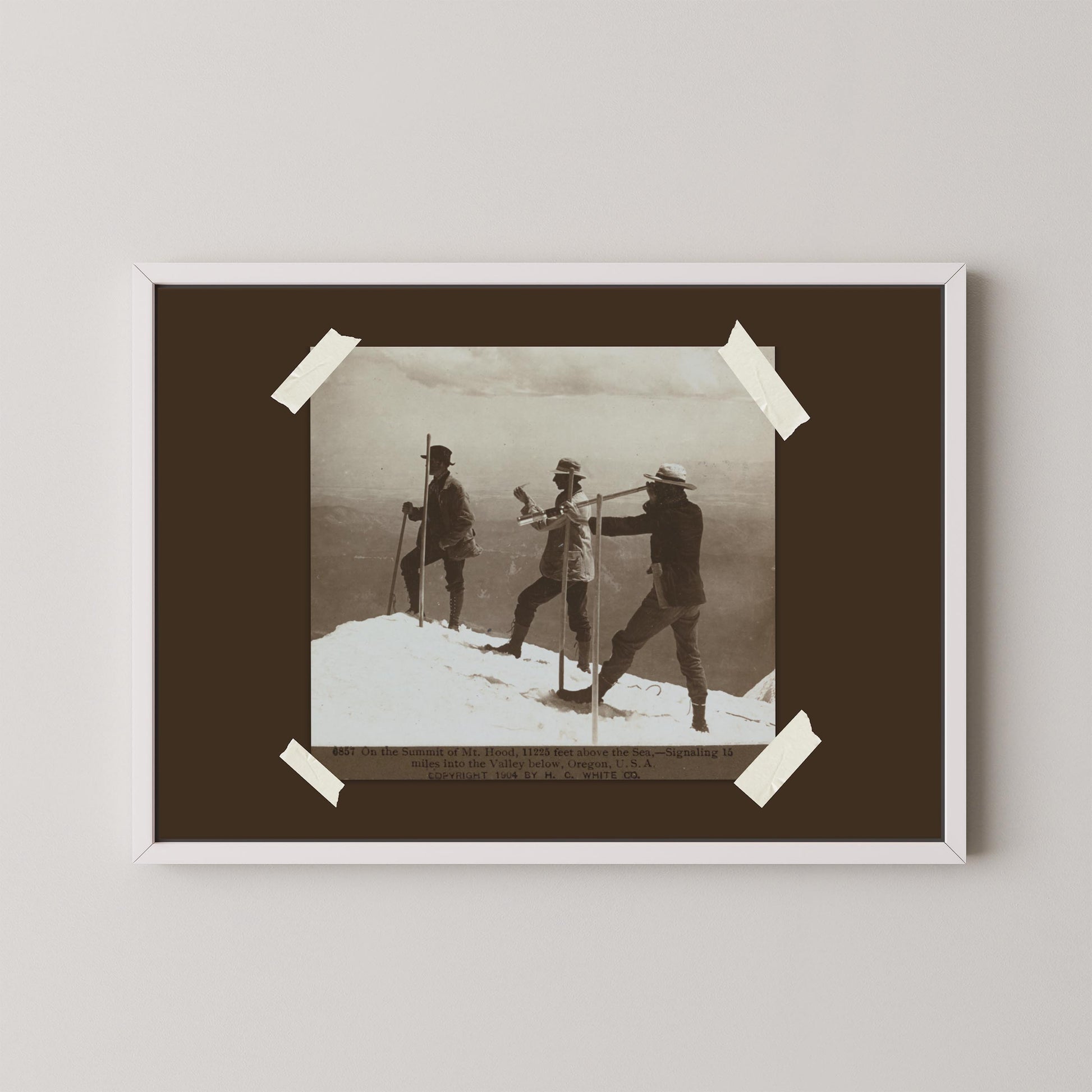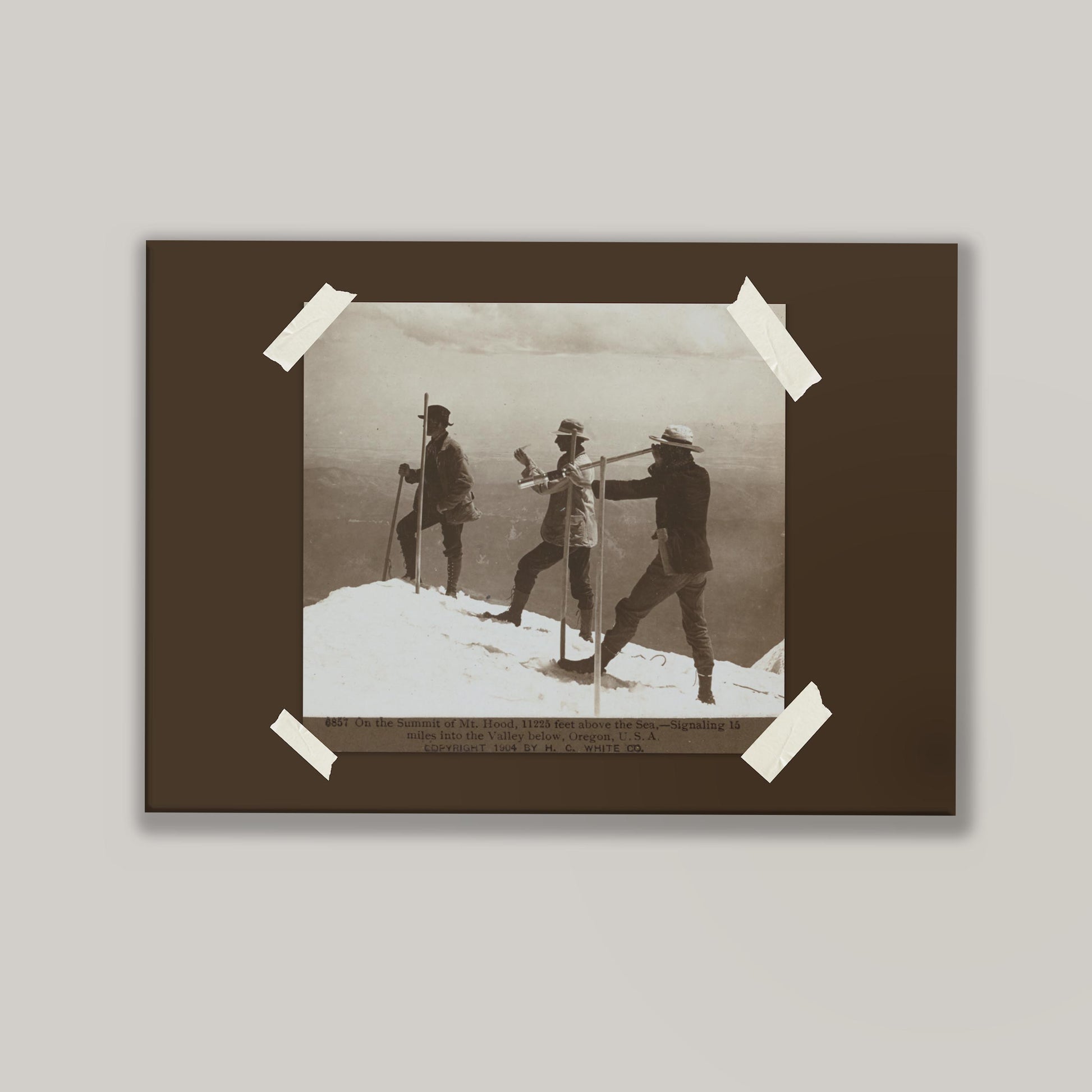 - Depicts early explorers on the summit of Mount Hood