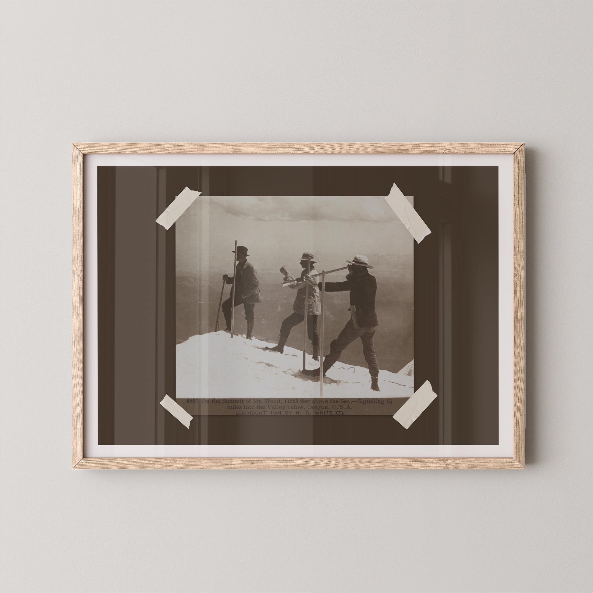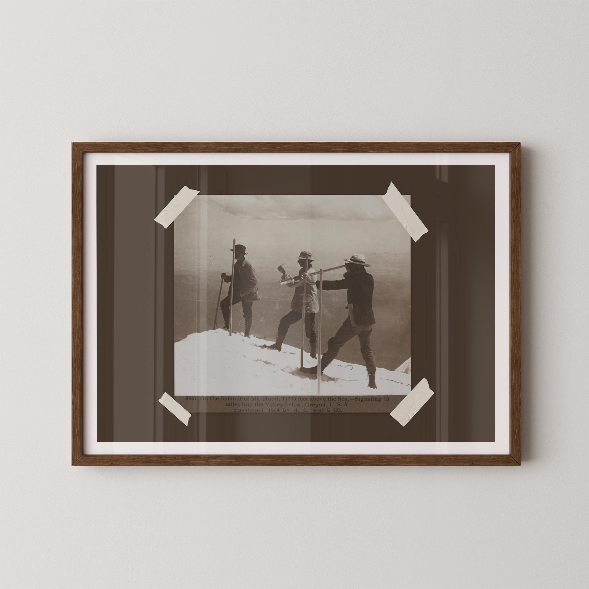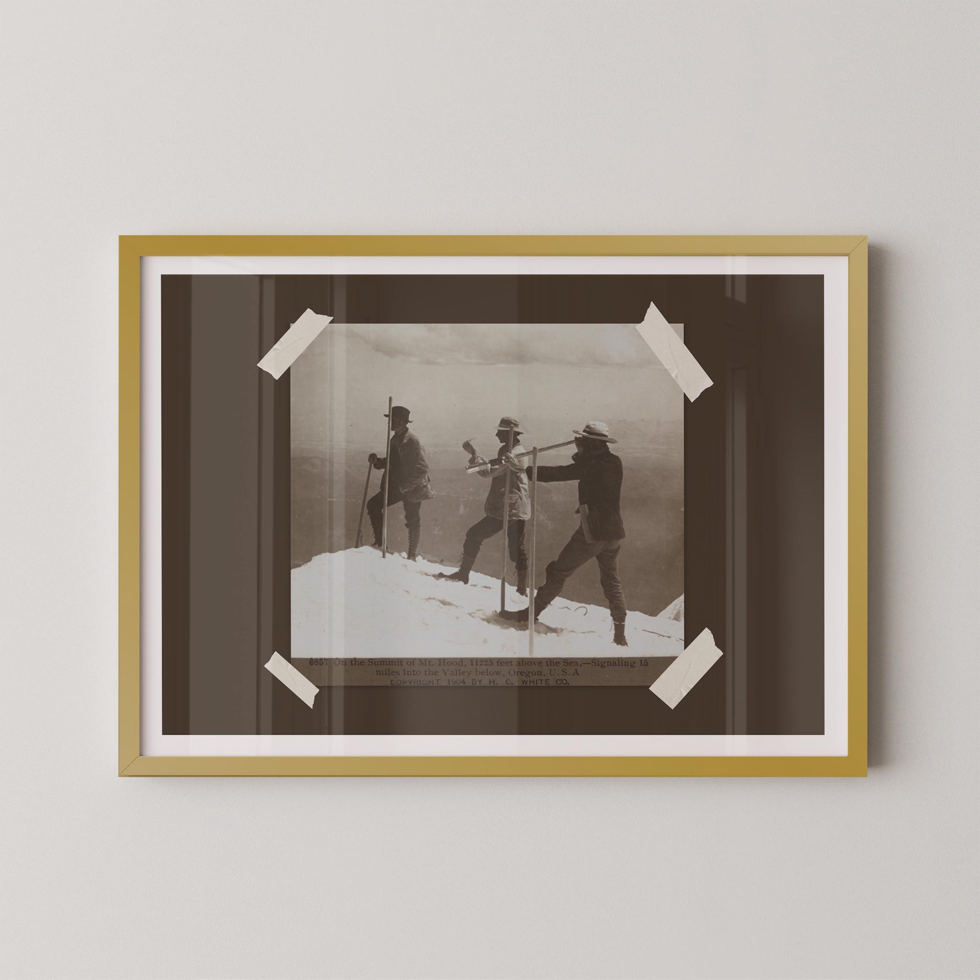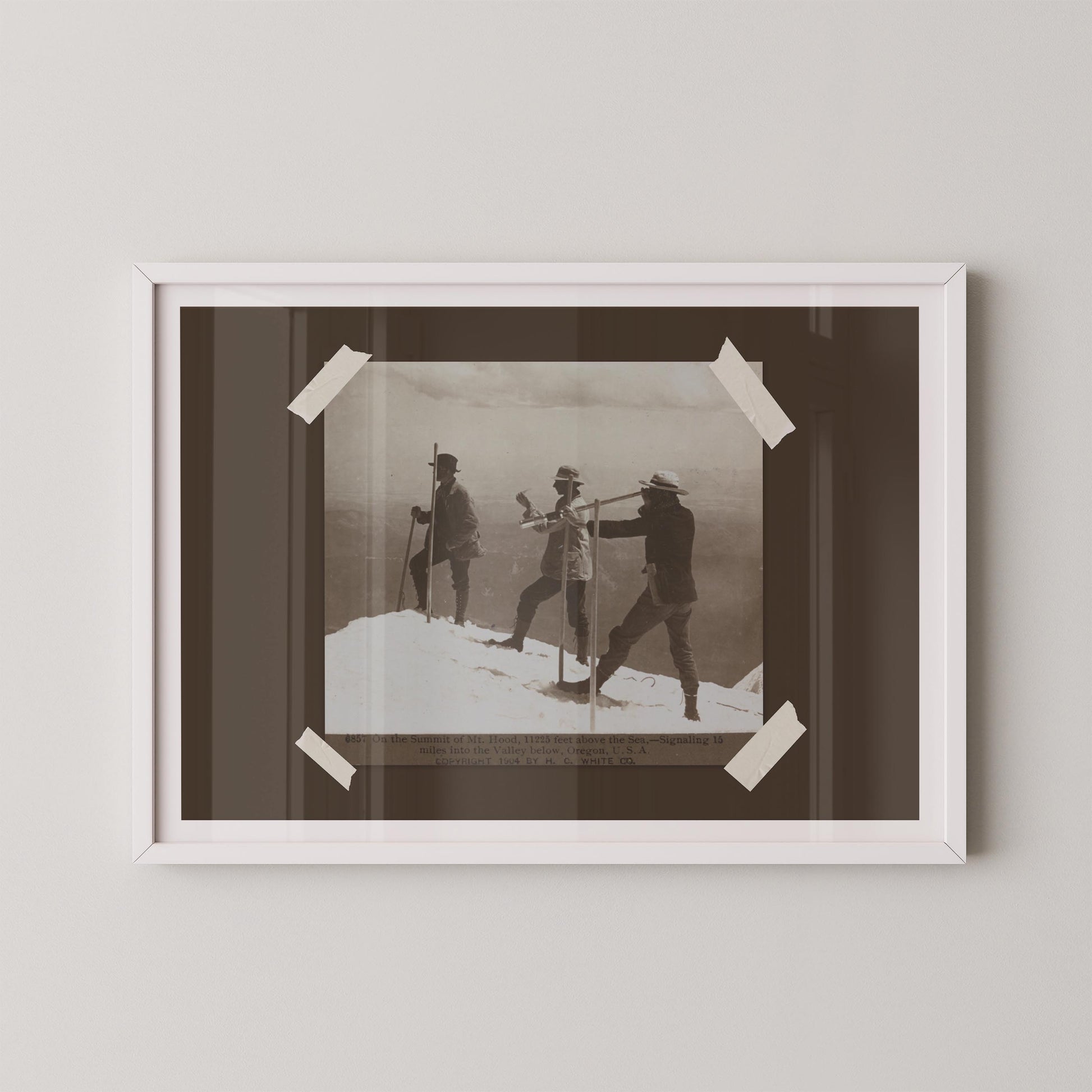 - Depicts early explorers on the summit of Mount Hood