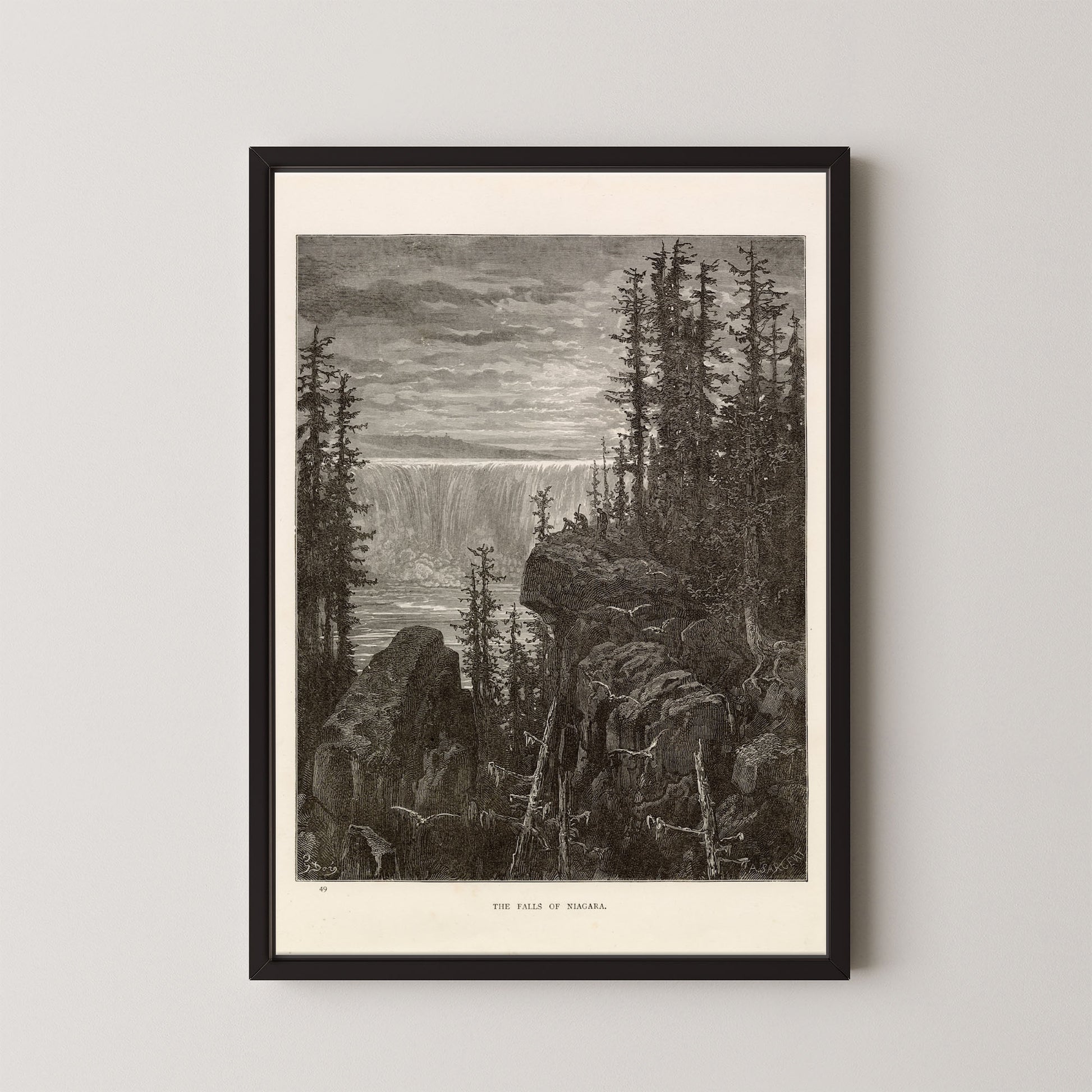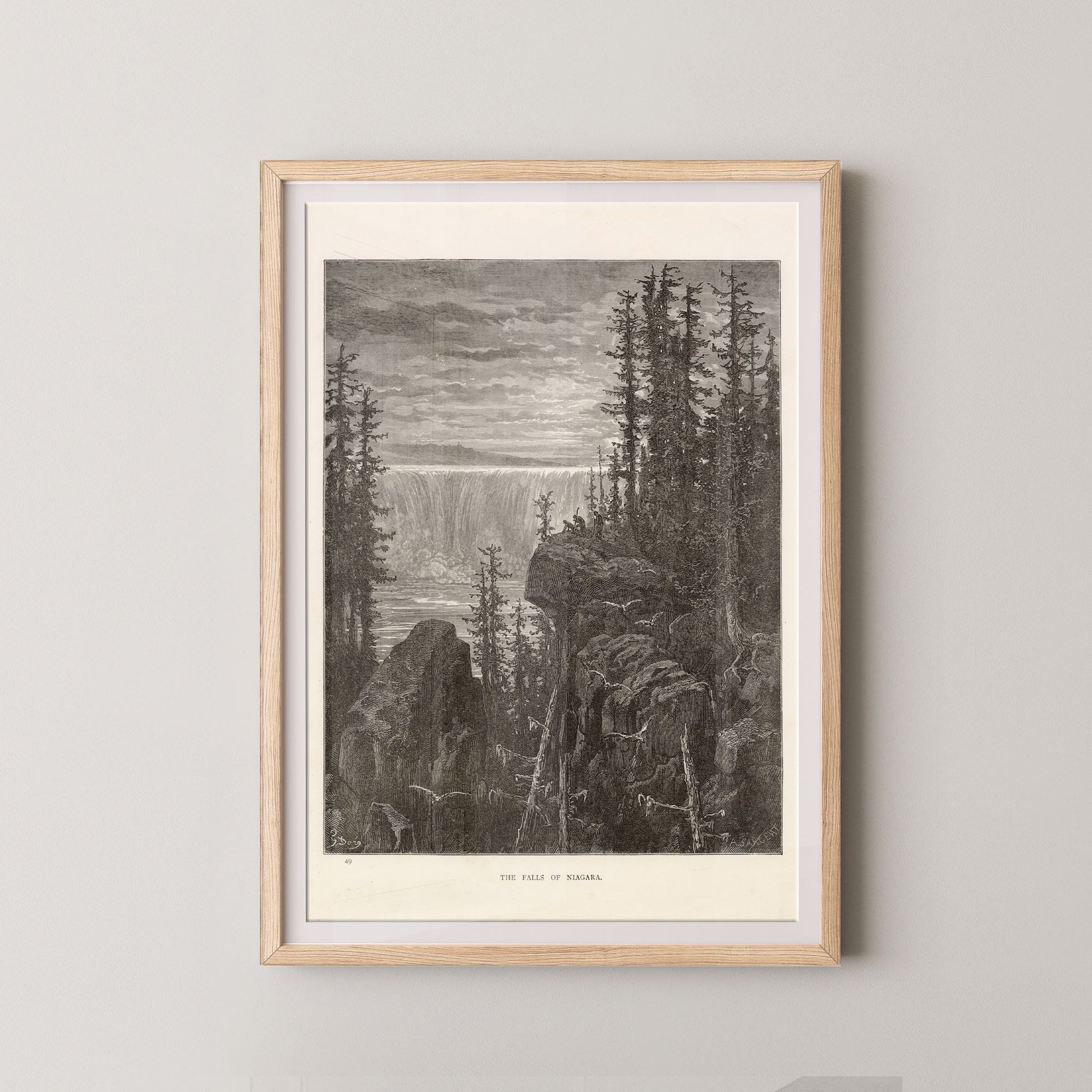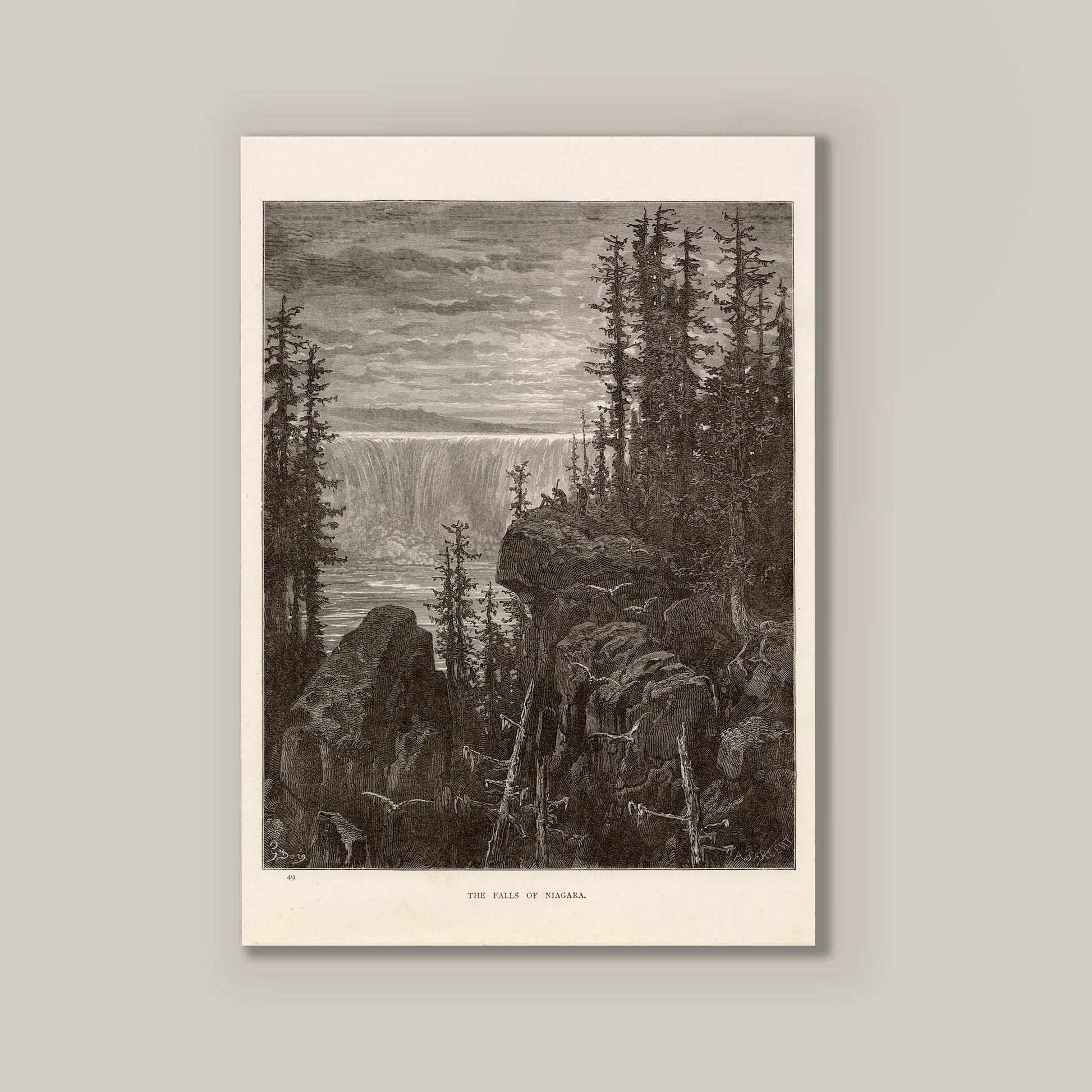 Niagara Falls is a breathtaking vintage engraving that captures the majesty and power of one of nature’s greatest wonders. The scene depicts the roaring cascade framed by towering evergreens and dramatic rock formations, showcasing both the beauty and the awe-inspiring force of the landscape. The fine linework and atmospheric depth create a timeless composition that celebrates the intersection of nature and artistry.