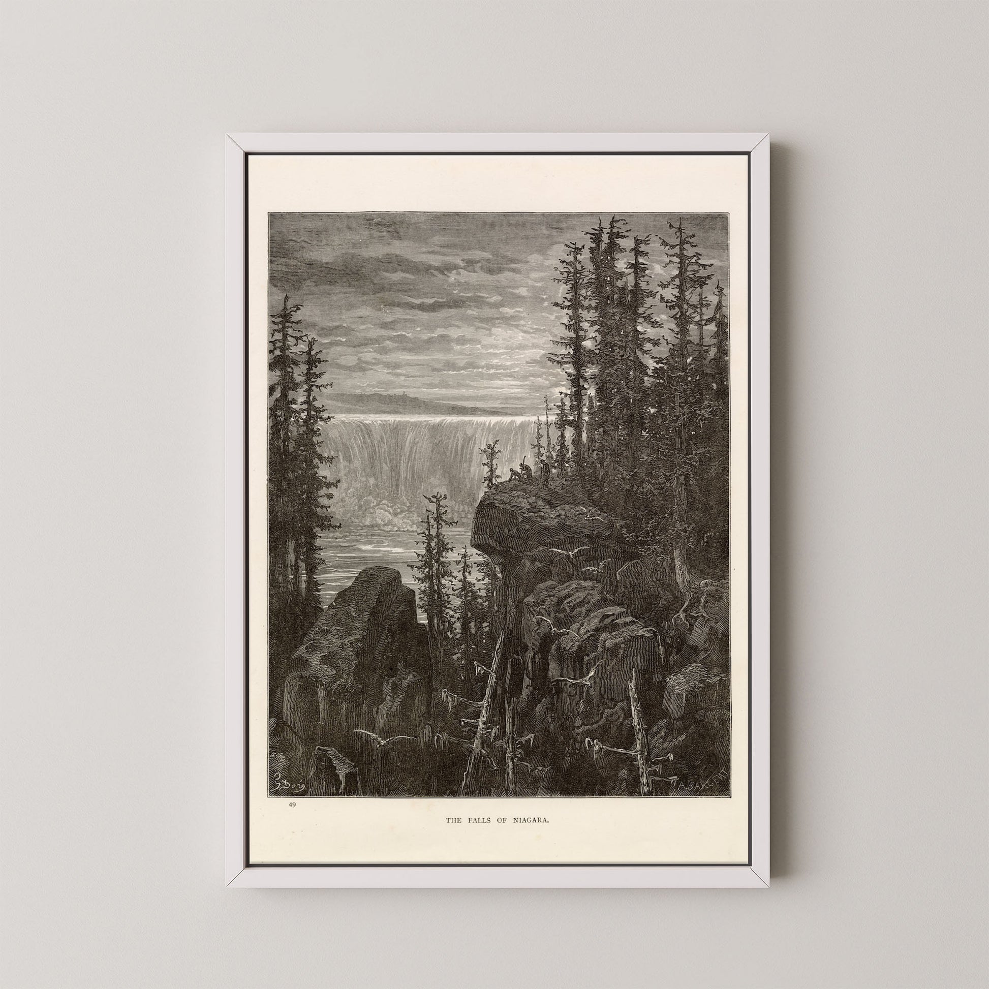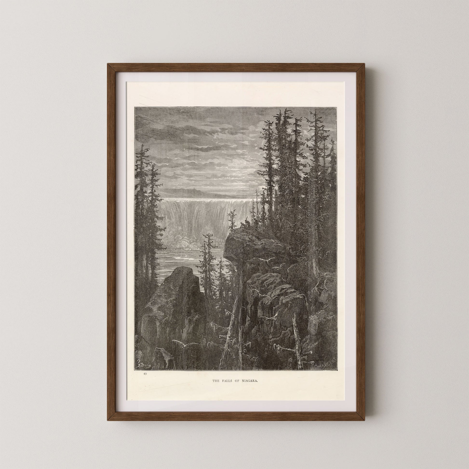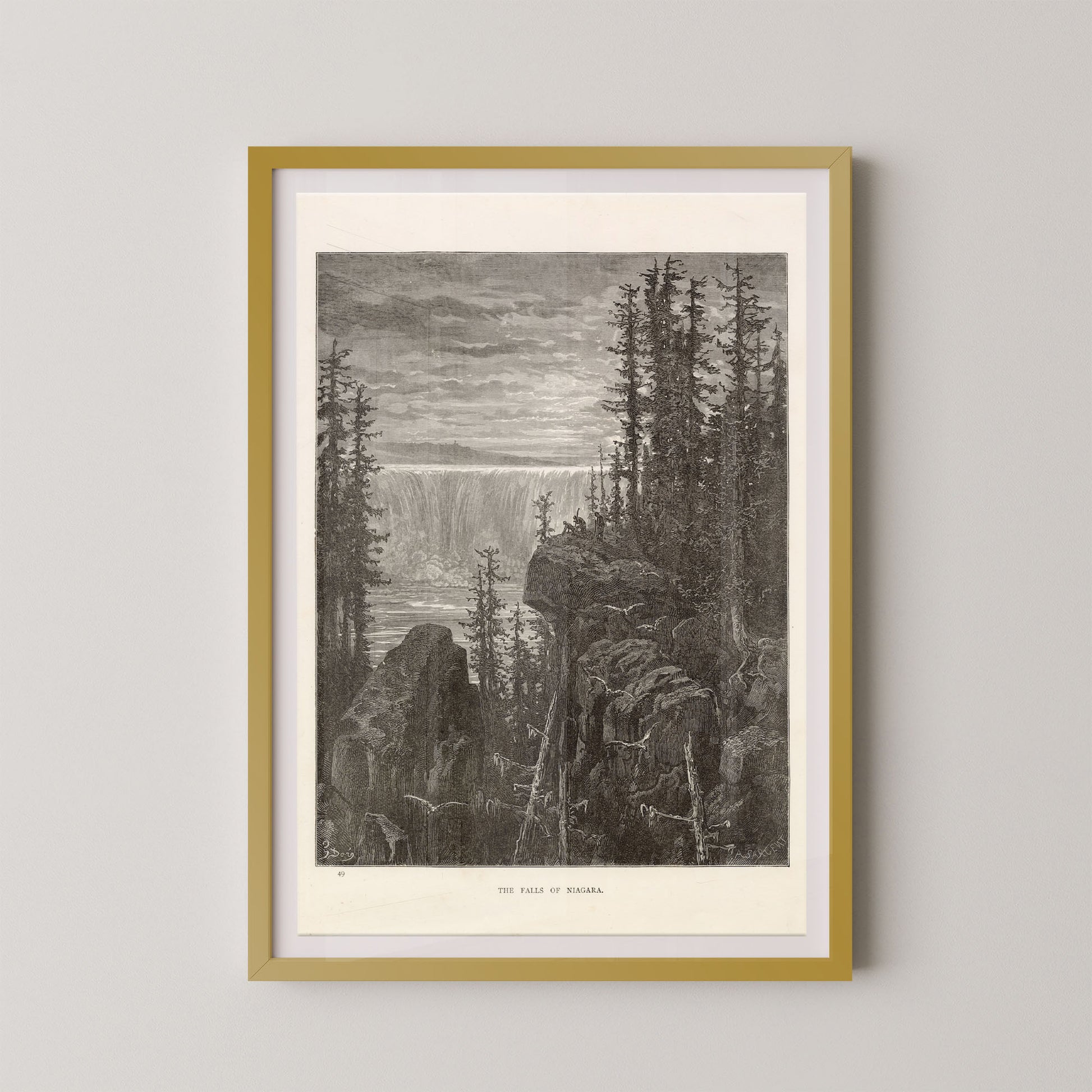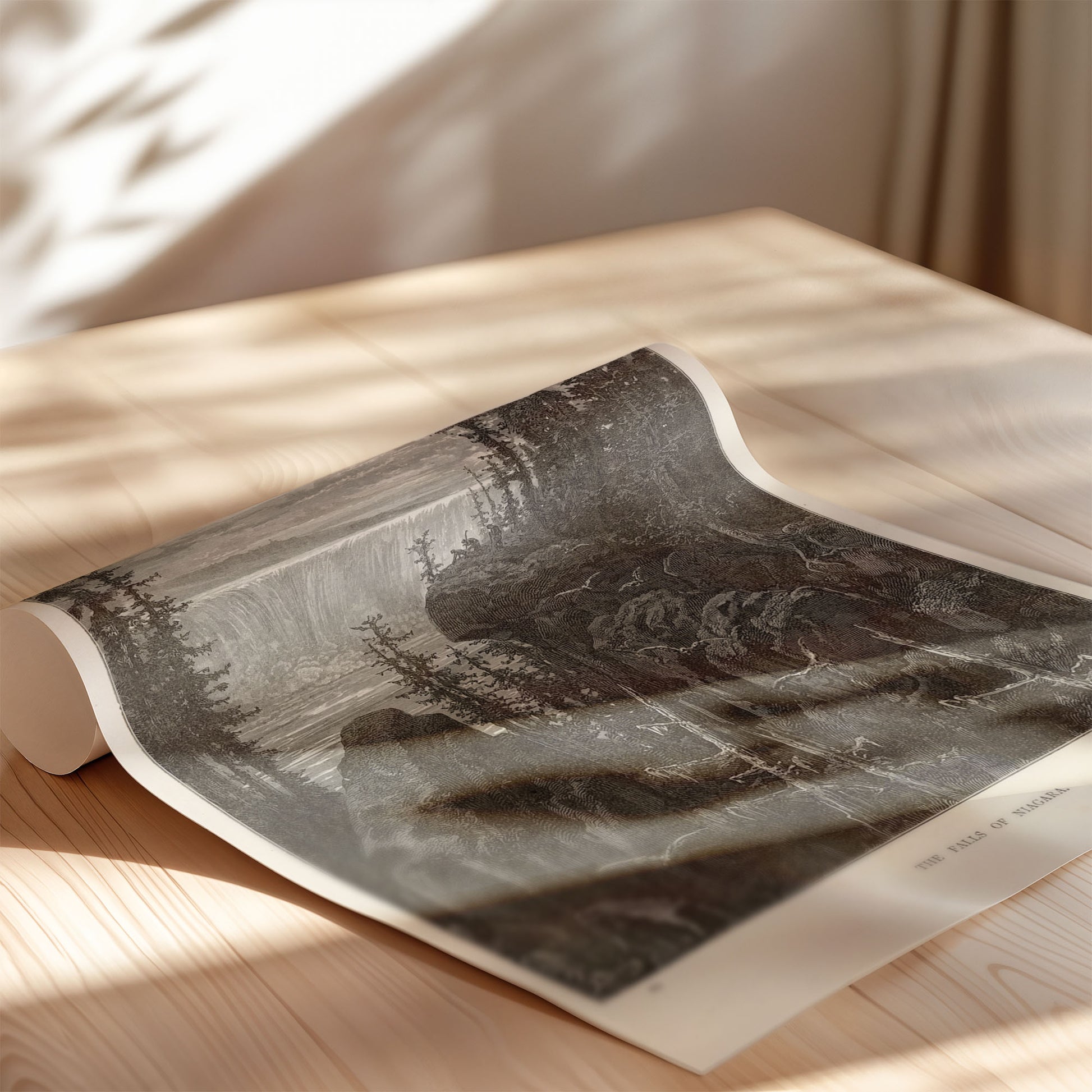 Niagara Falls is a breathtaking vintage engraving that captures the majesty and power of one of nature’s greatest wonders. The scene depicts the roaring cascade framed by towering evergreens and dramatic rock formations, showcasing both the beauty and the awe-inspiring force of the landscape. The fine linework and atmospheric depth create a timeless composition that celebrates the intersection of nature and artistry.