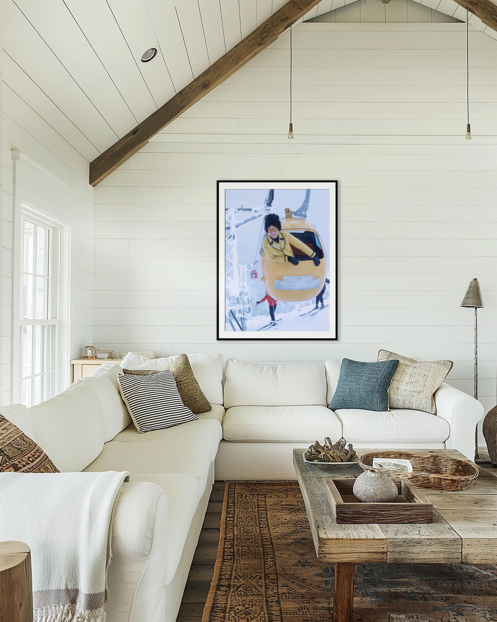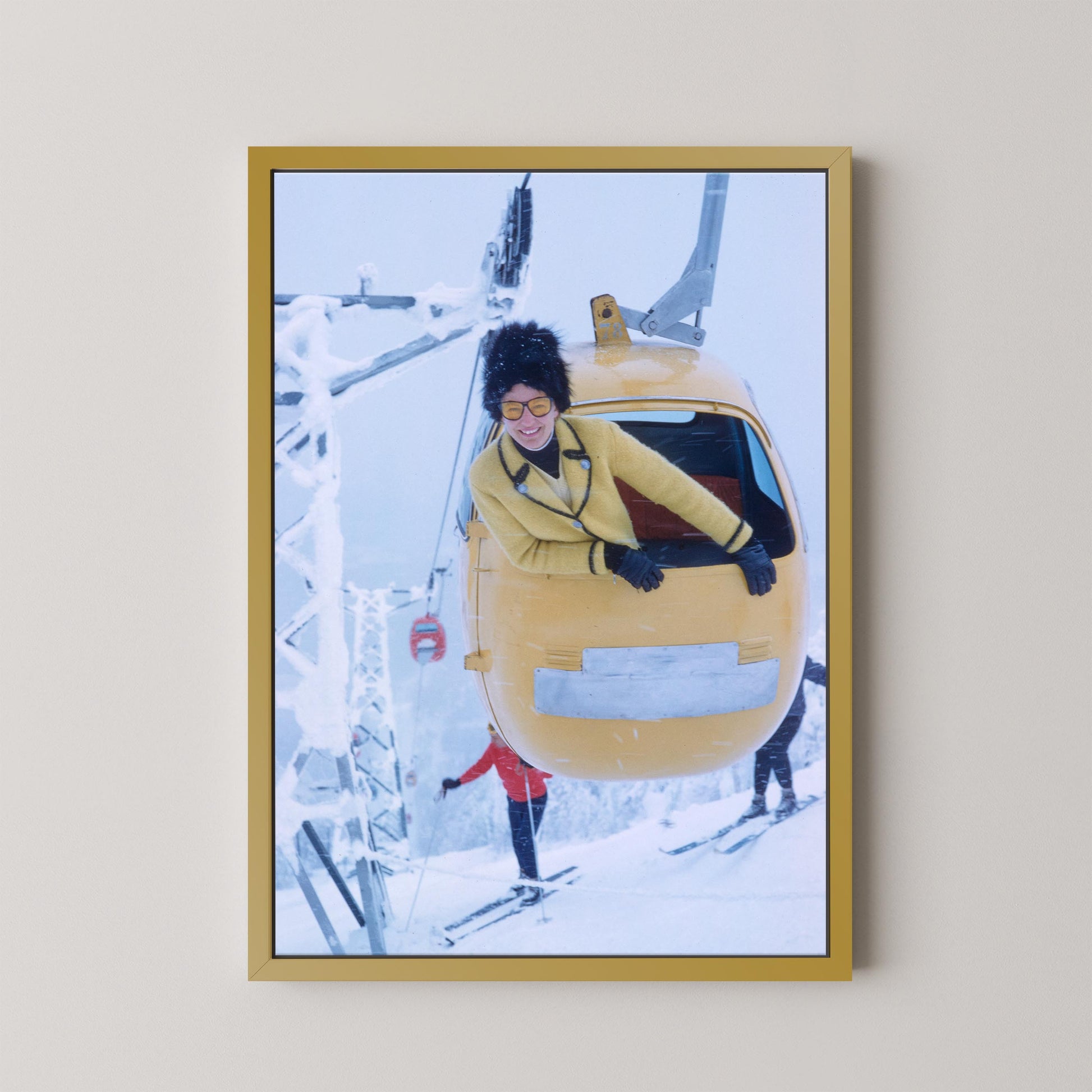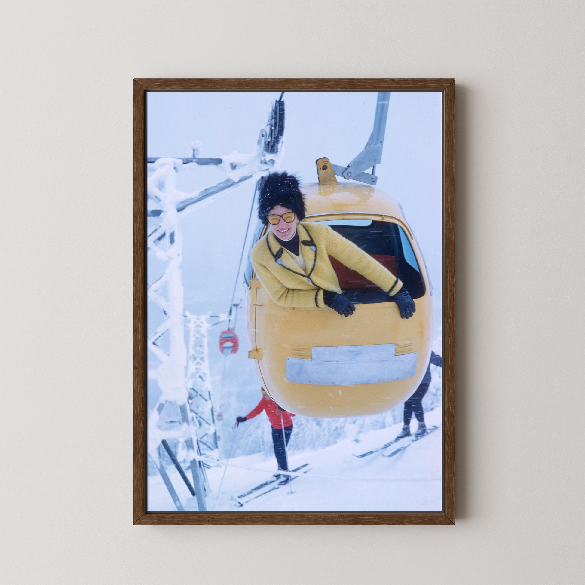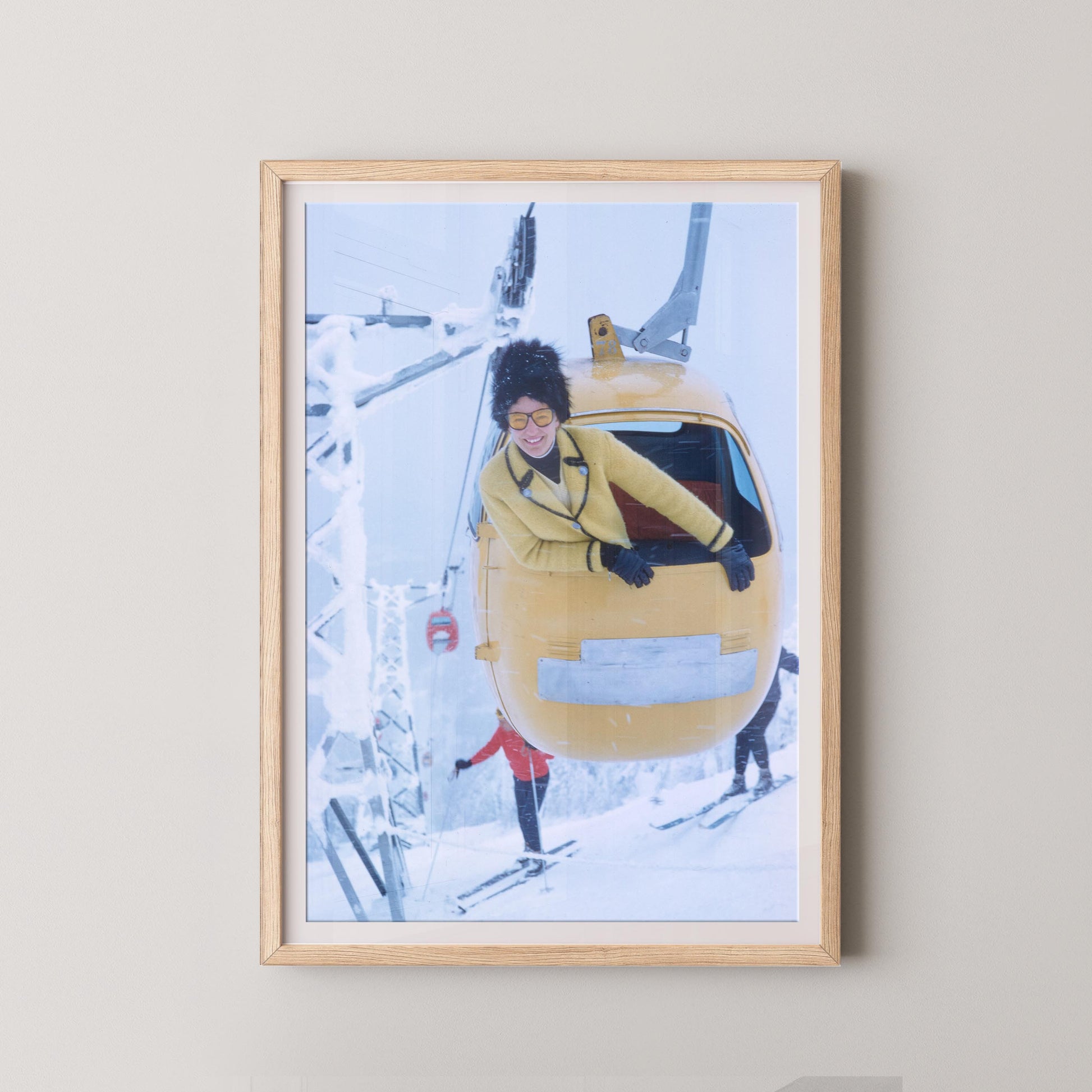 Bold, bright, and full of vintage charm, Retro Gondola captures the carefree glamour of mid-century ski culture. Featuring a cheerful skier leaning from a sunshine-yellow gondola against a snowy alpine backdrop, this vibrant photograph embodies the playful elegance of the 1960s ski scene.