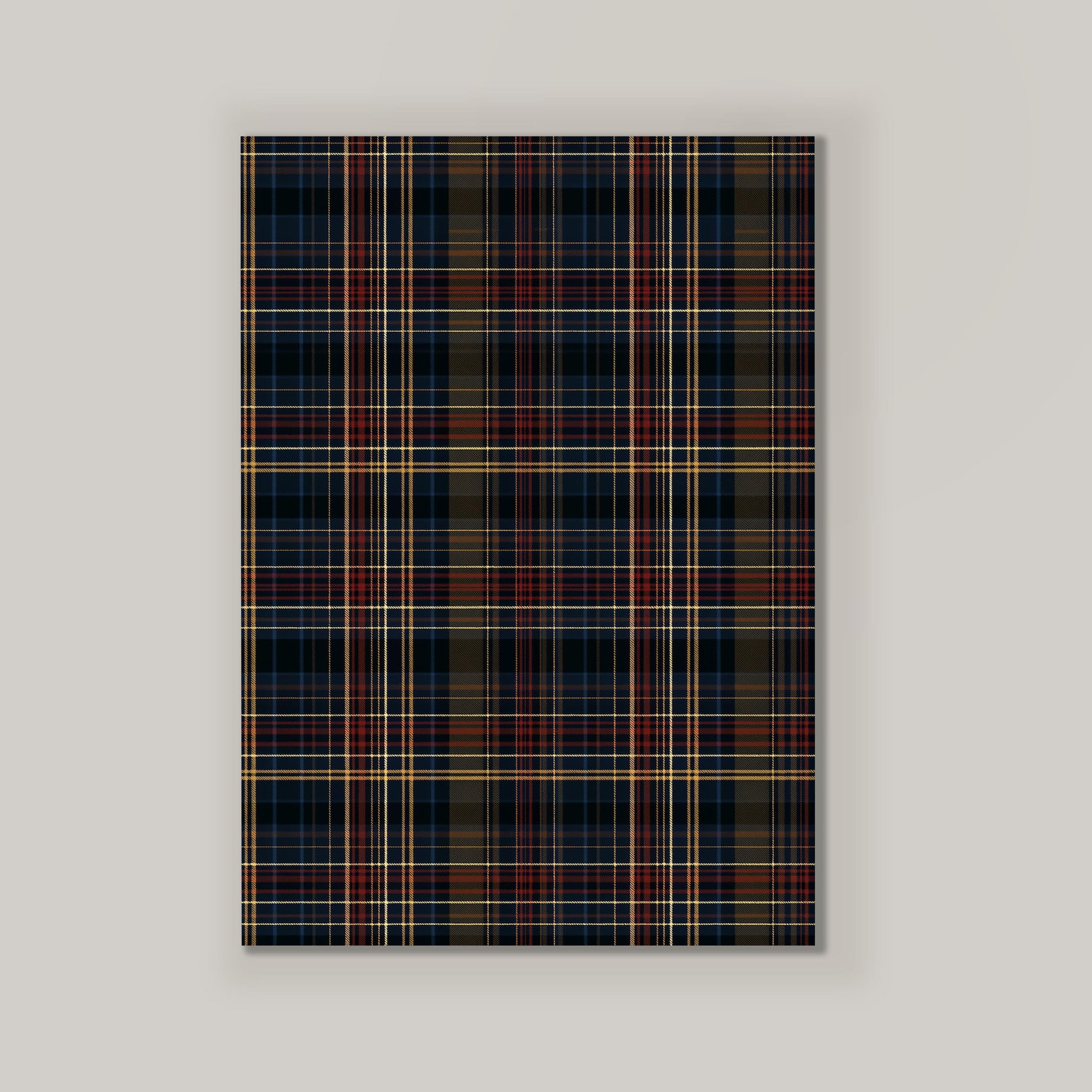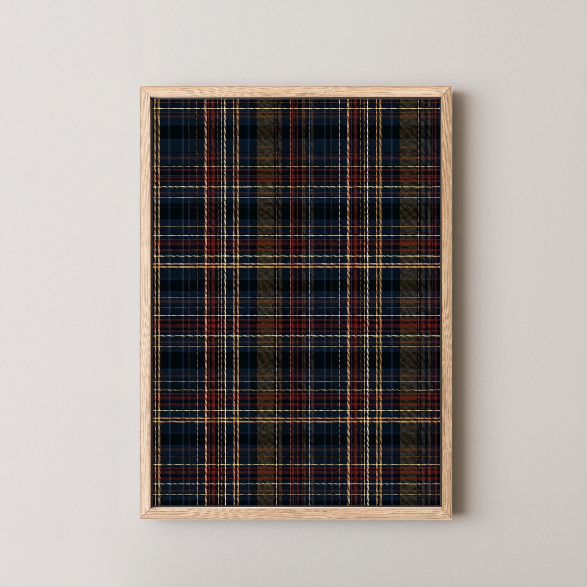 - Rich, high-contrast tartan in navy, crimson, and gold tones.