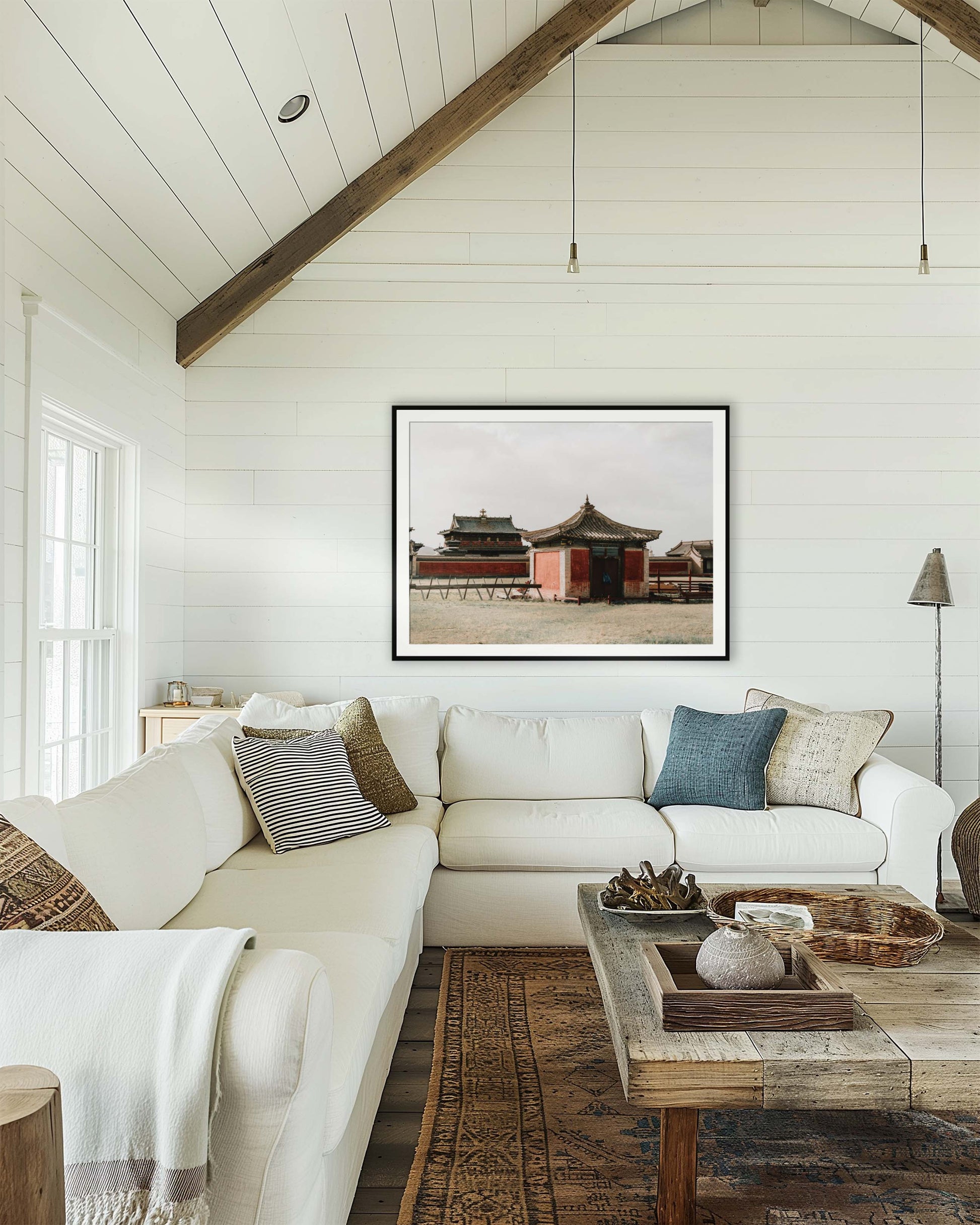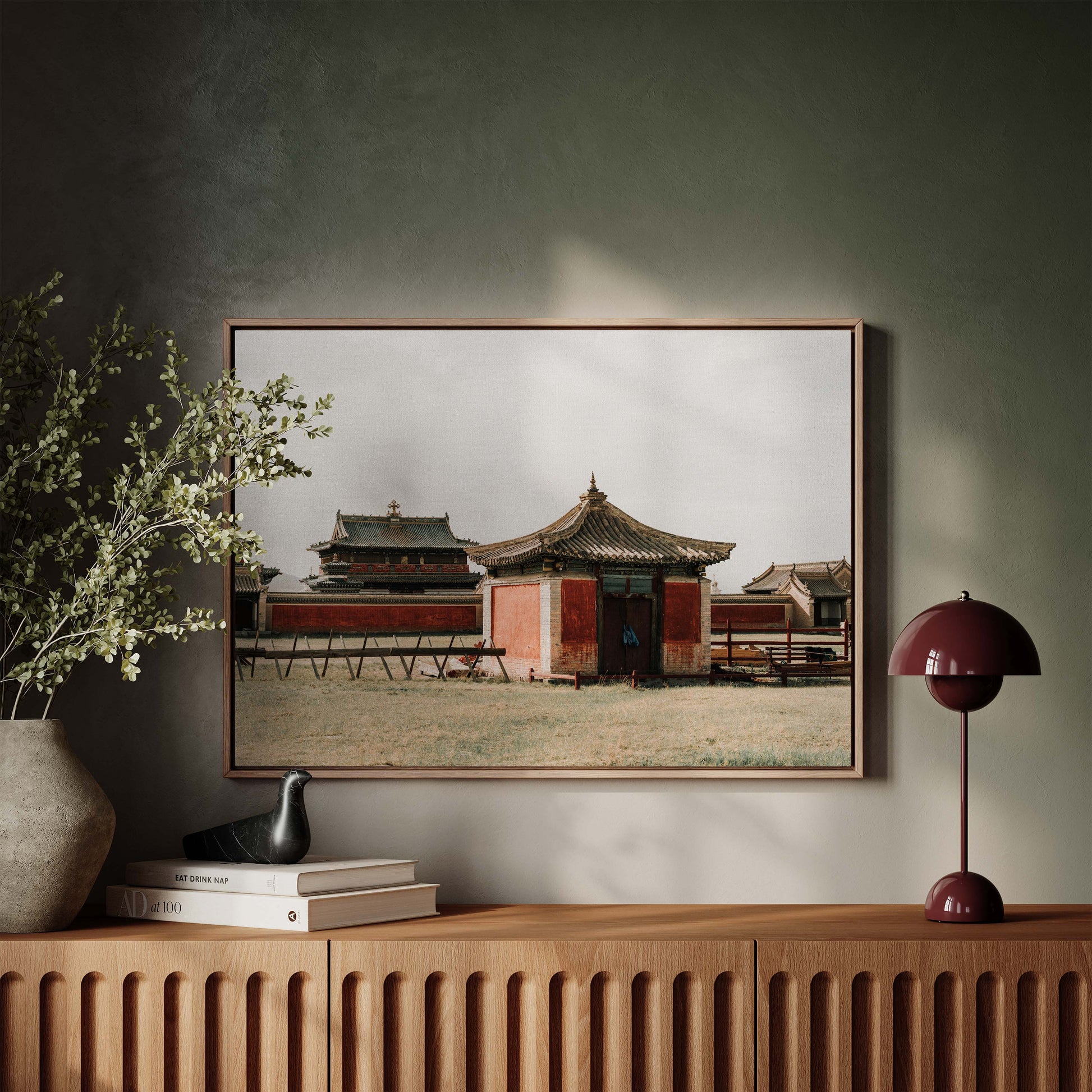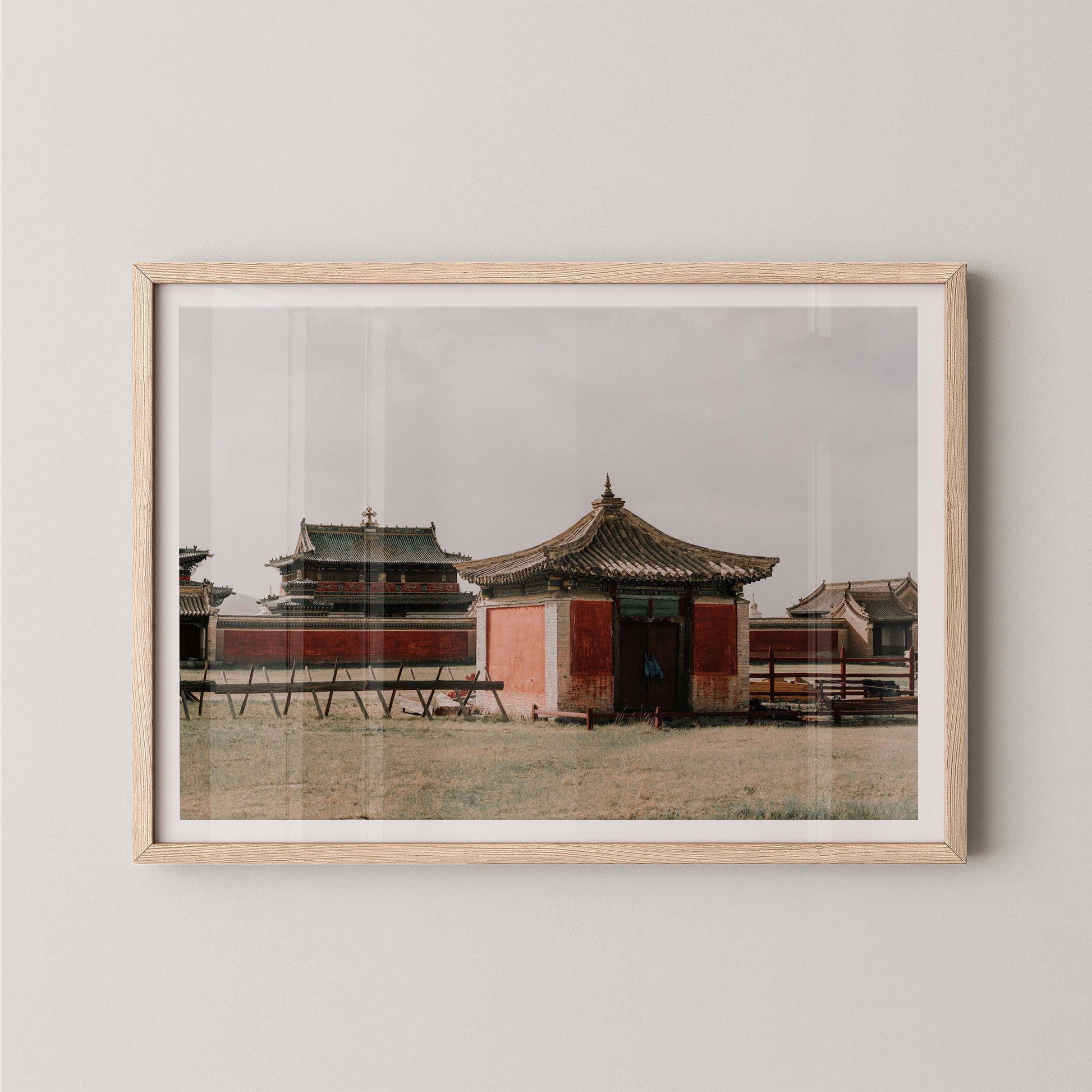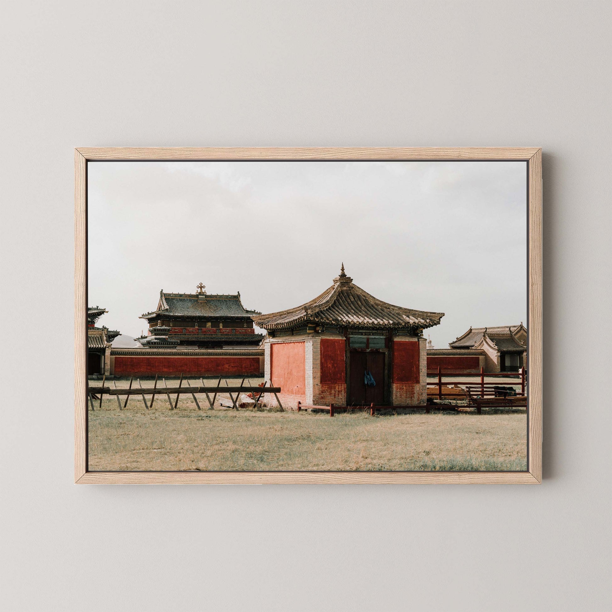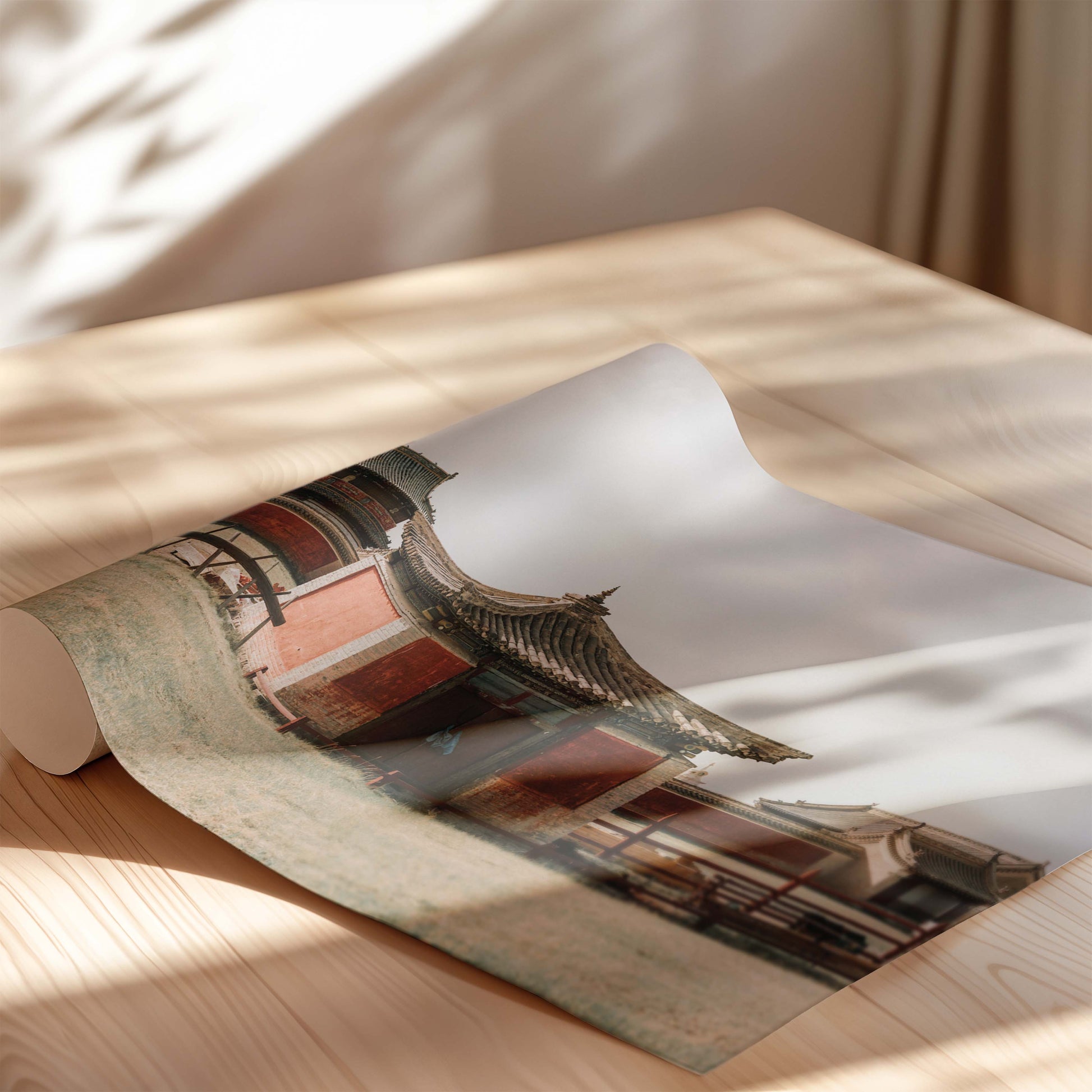 Step into the stillness of an ancient world with "Sacred Ground I," a warm, sunlit photograph capturing the quiet elegance of historic temple architecture. With its weathered red walls, sloping tiled roofs, and pastoral surroundings, this piece exudes a sense of rootedness, tradition, and contemplative calm.