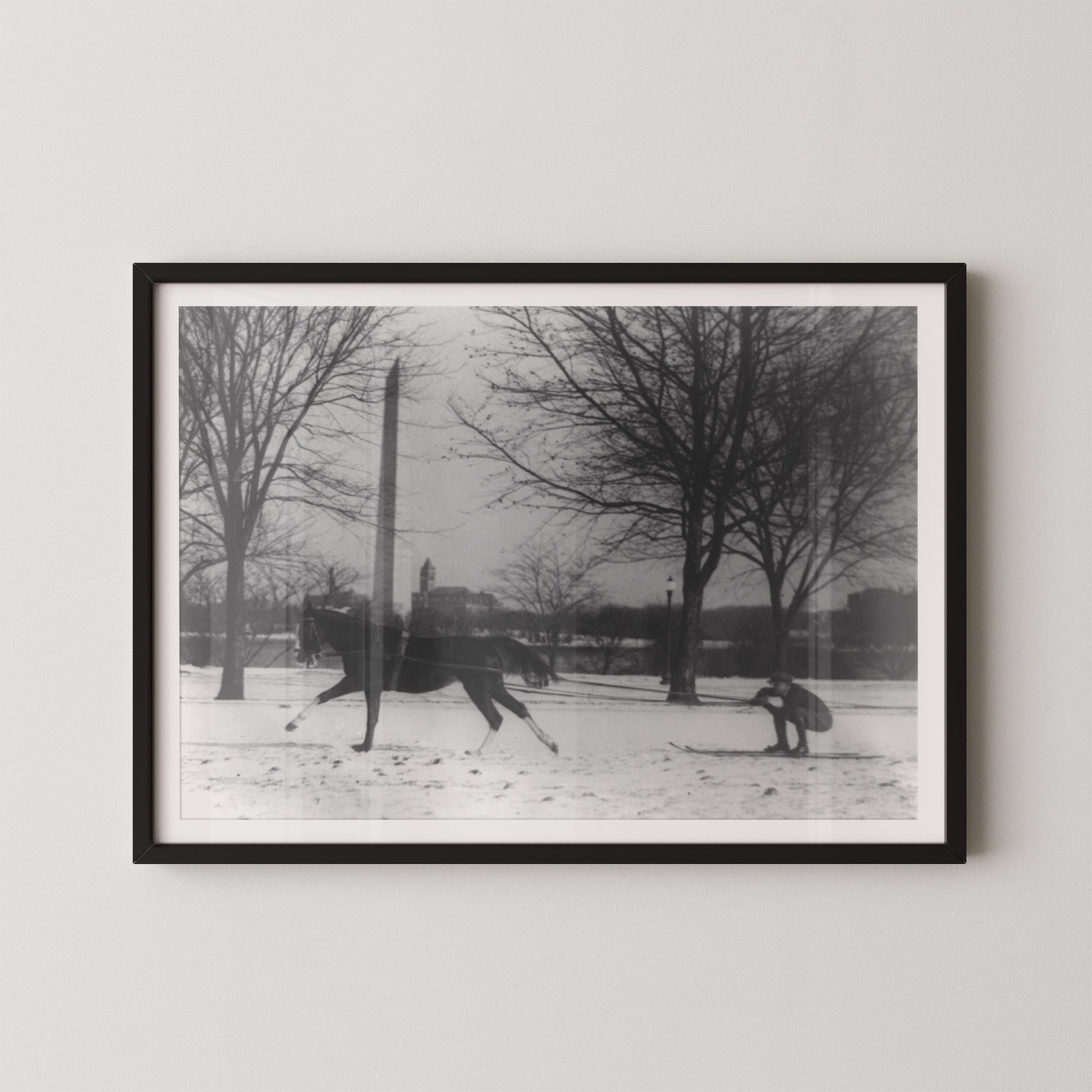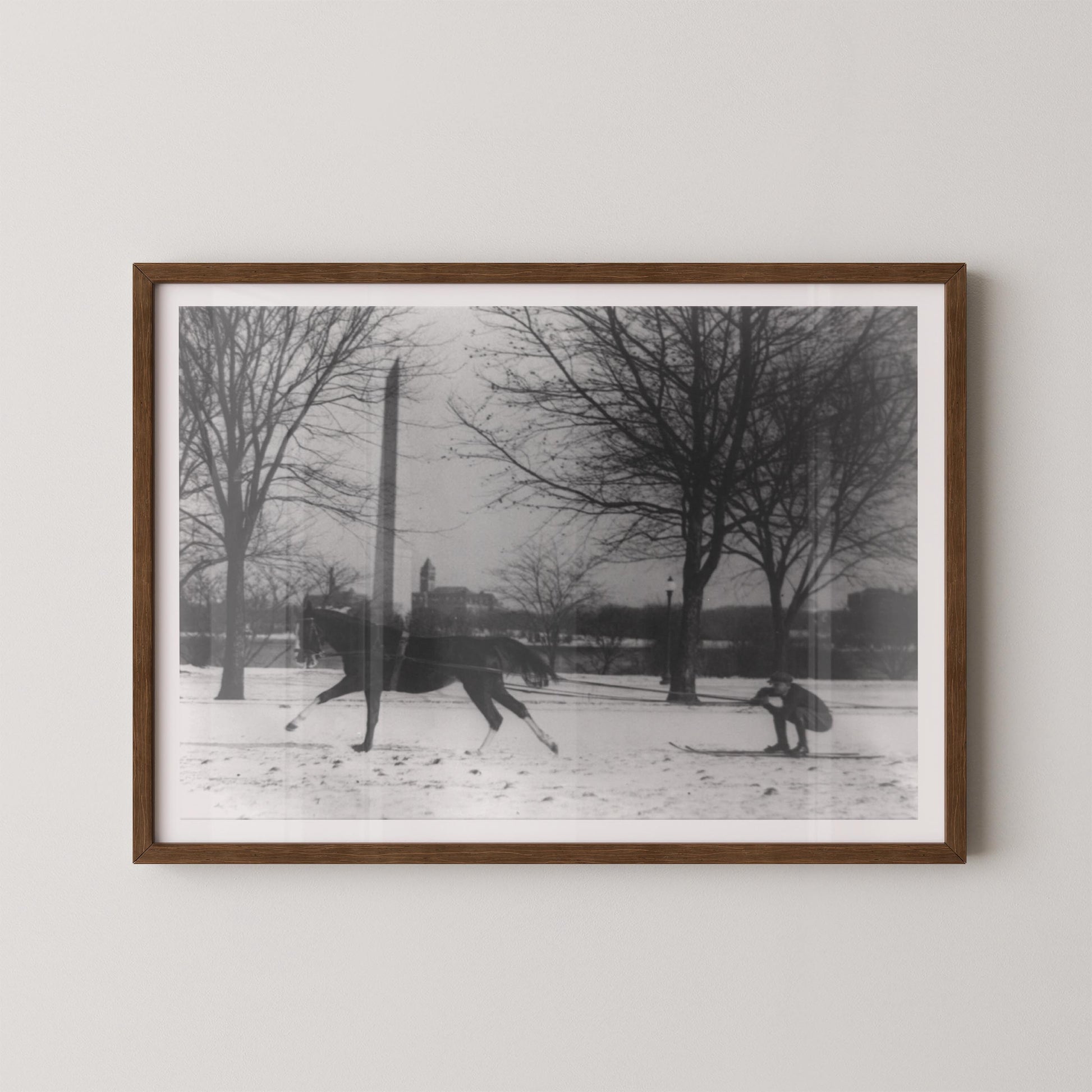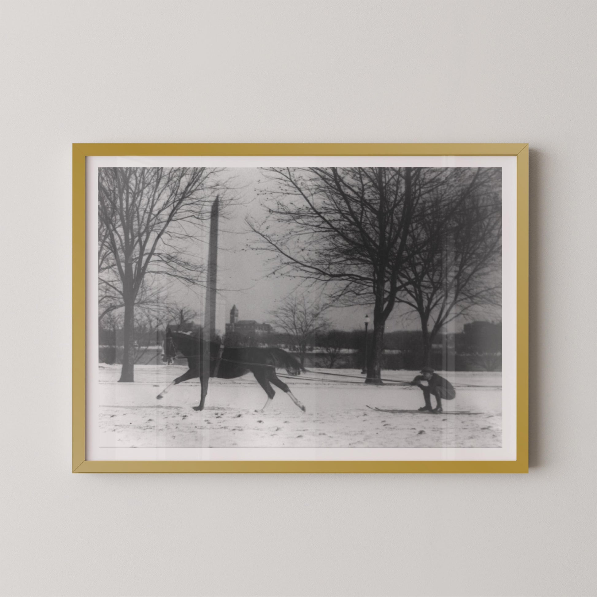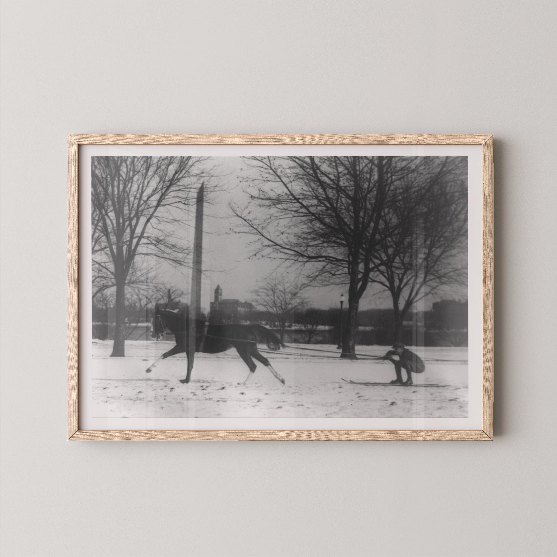 Celebrate winter adventure and timeless elegance with Skijour, a striking black-and-white photograph capturing the exhilarating sport of being pulled by horse through the snow. Set against a wintry city backdrop, this image blends equestrian grace with vintage alpine spirit, creating a piece that feels both refined and daring.