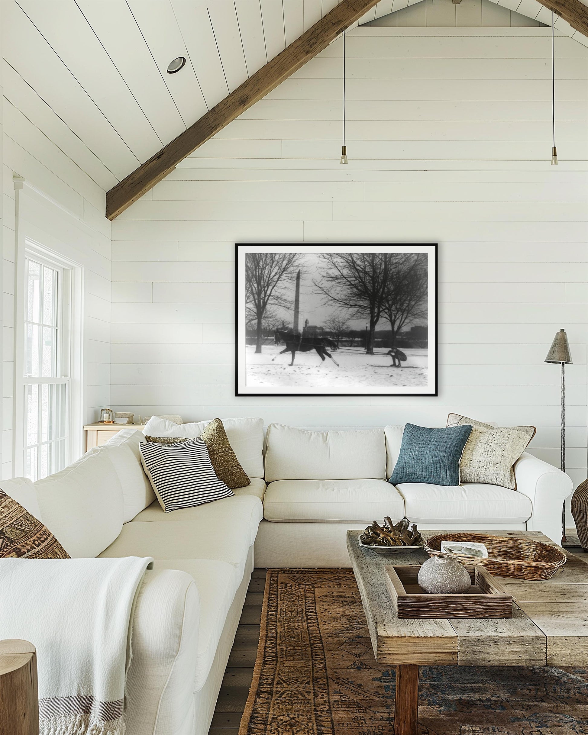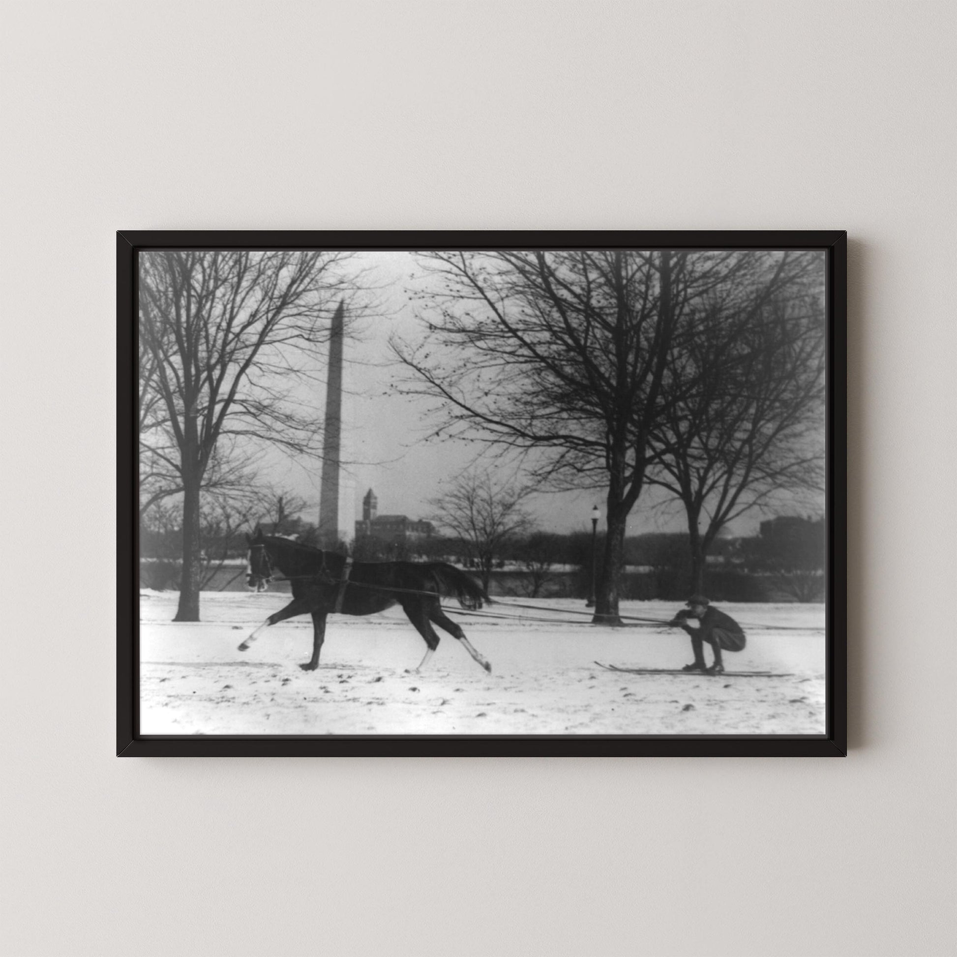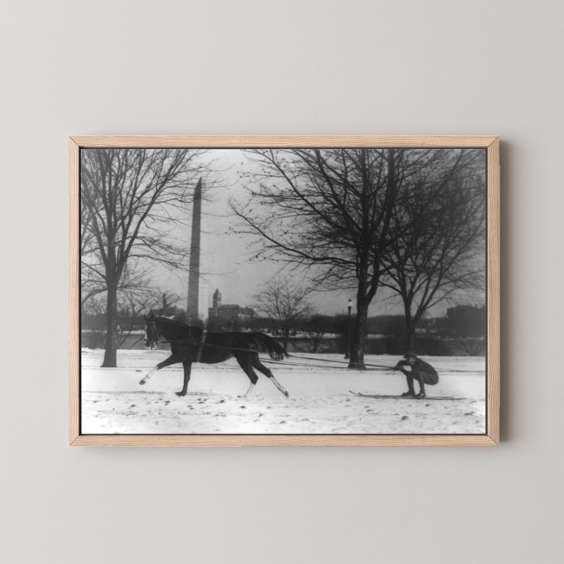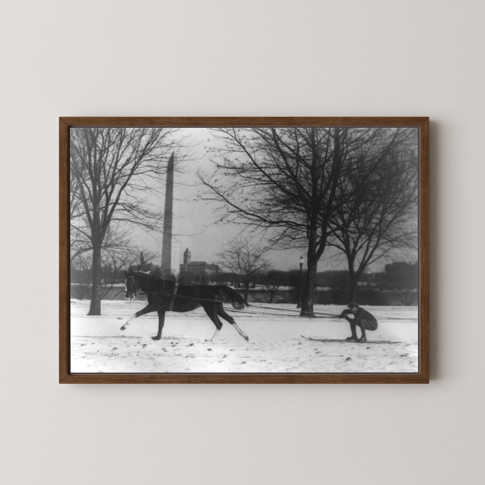 Celebrate winter adventure and timeless elegance with Skijour, a striking black-and-white photograph capturing the exhilarating sport of being pulled by horse through the snow. Set against a wintry city backdrop, this image blends equestrian grace with vintage alpine spirit, creating a piece that feels both refined and daring.