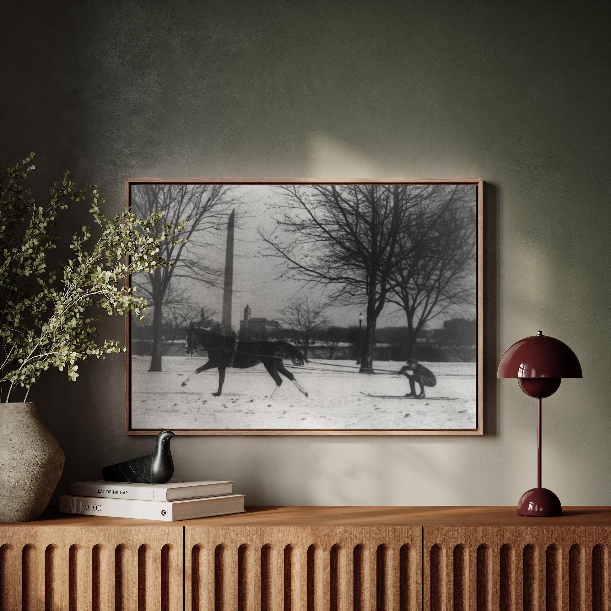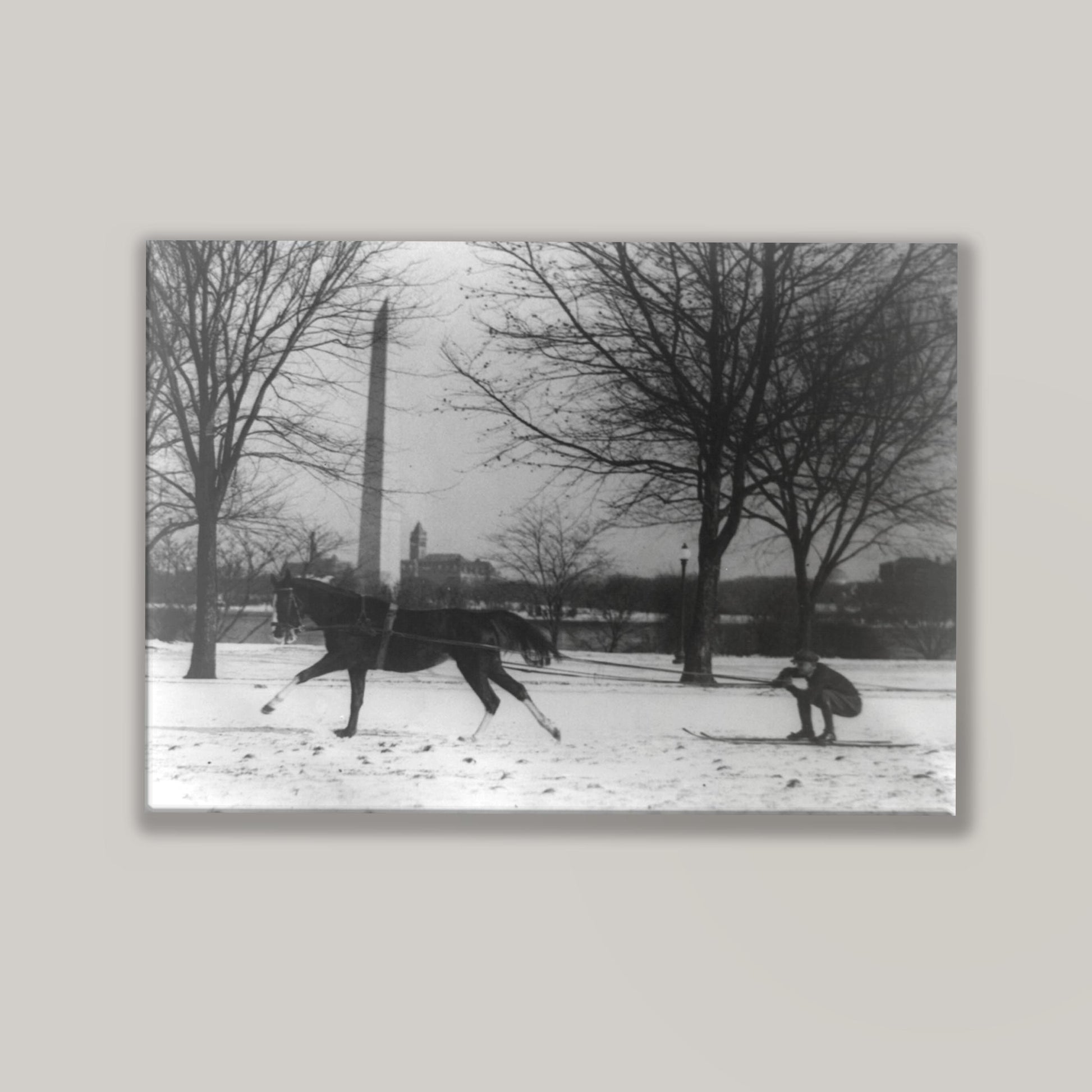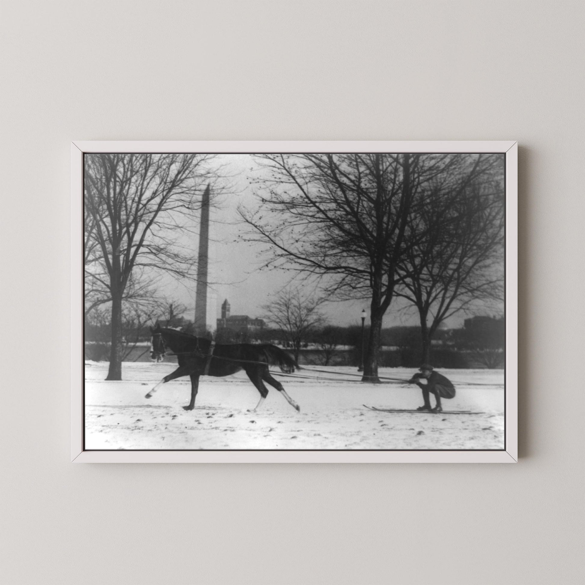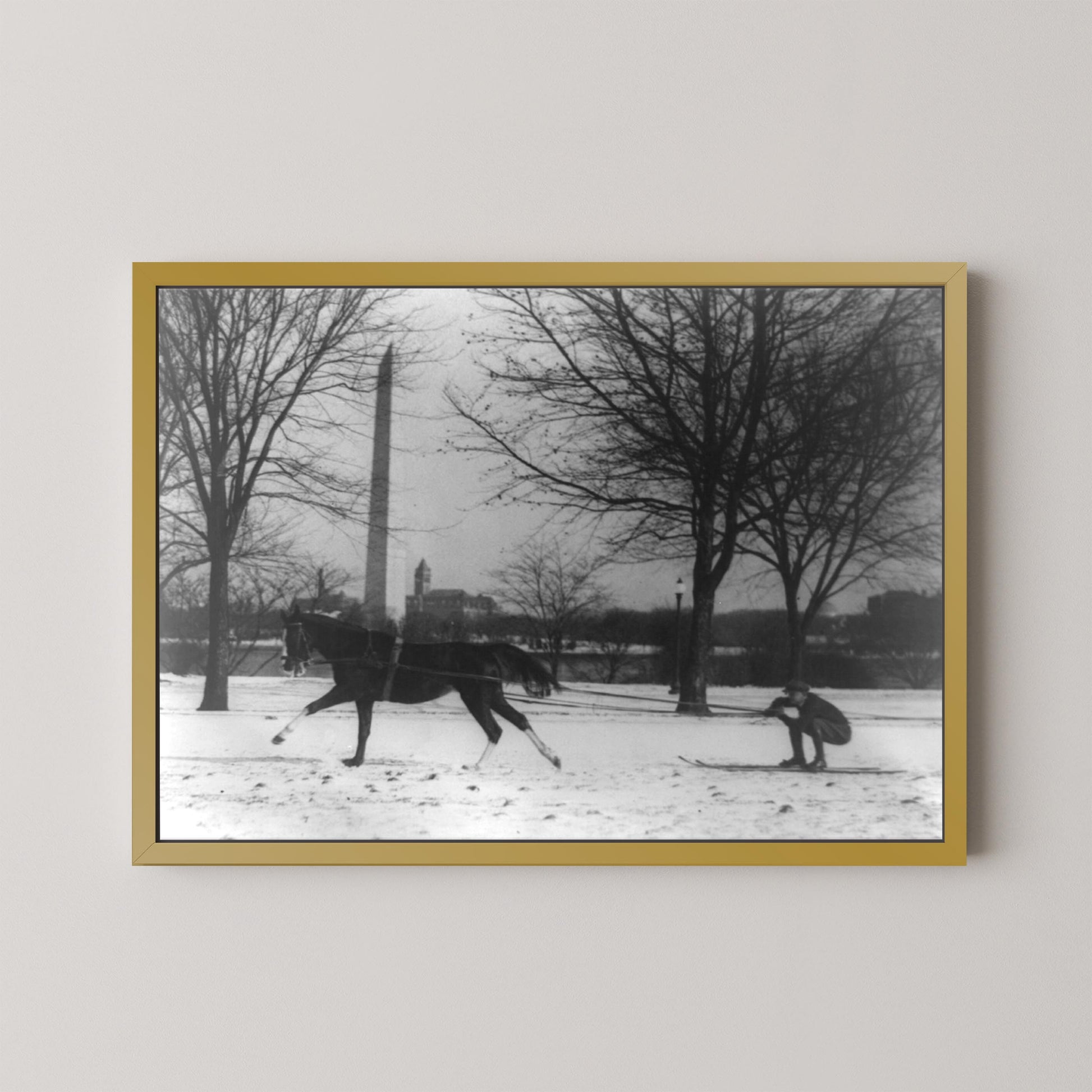 Celebrate winter adventure and timeless elegance with Skijour, a striking black-and-white photograph capturing the exhilarating sport of being pulled by horse through the snow. Set against a wintry city backdrop, this image blends equestrian grace with vintage alpine spirit, creating a piece that feels both refined and daring.