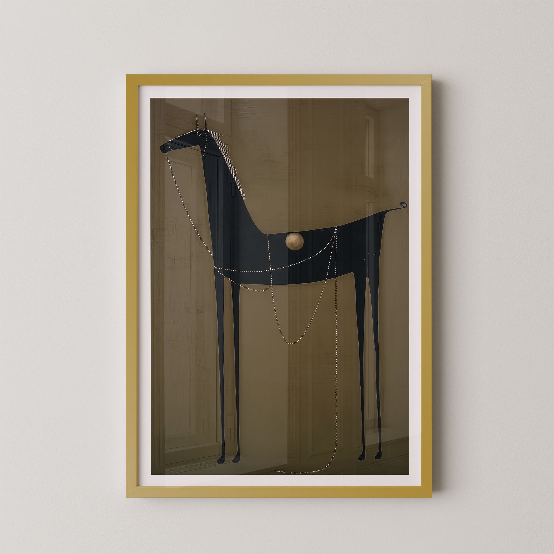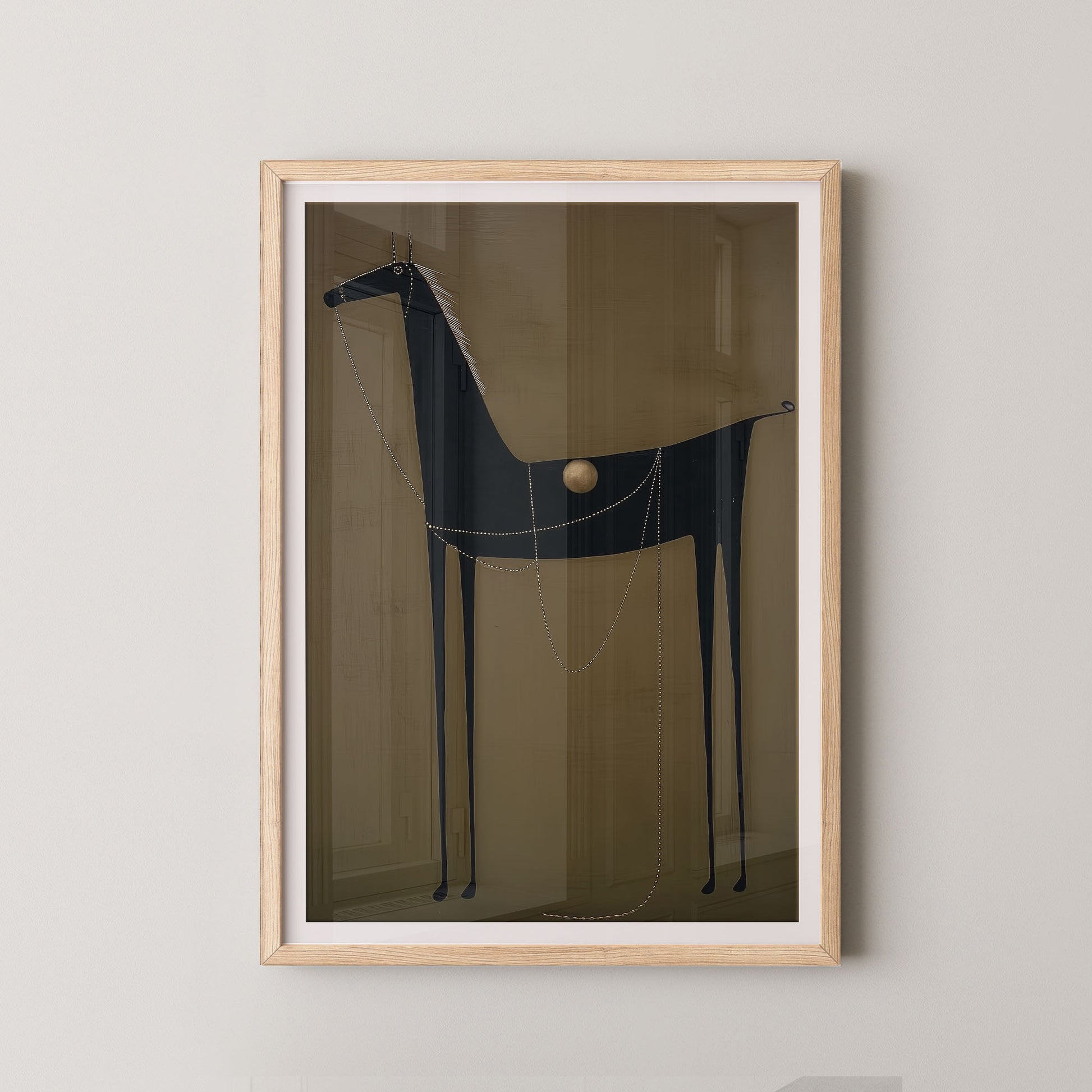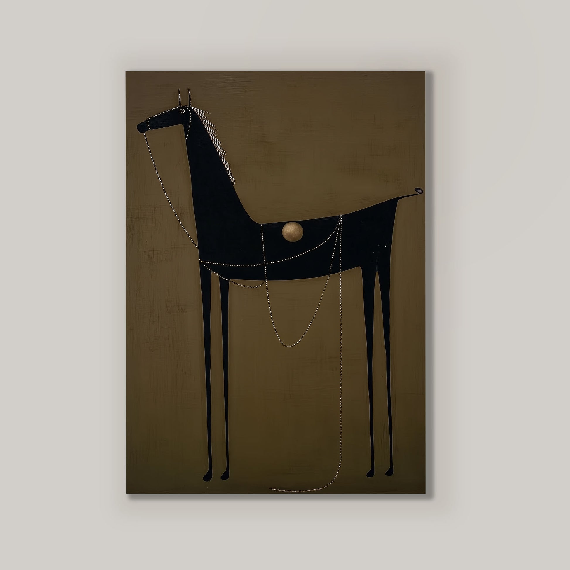 Delicate dotted lines drape across the horse’s body like ornamental chains, adding rhythm and movement while evoking traditional adornment and ritual. The simplified silhouette and matte, textured background give the piece a grounded, almost mural-like presence, making it feel soulful, intentional, and deeply rooted in history.