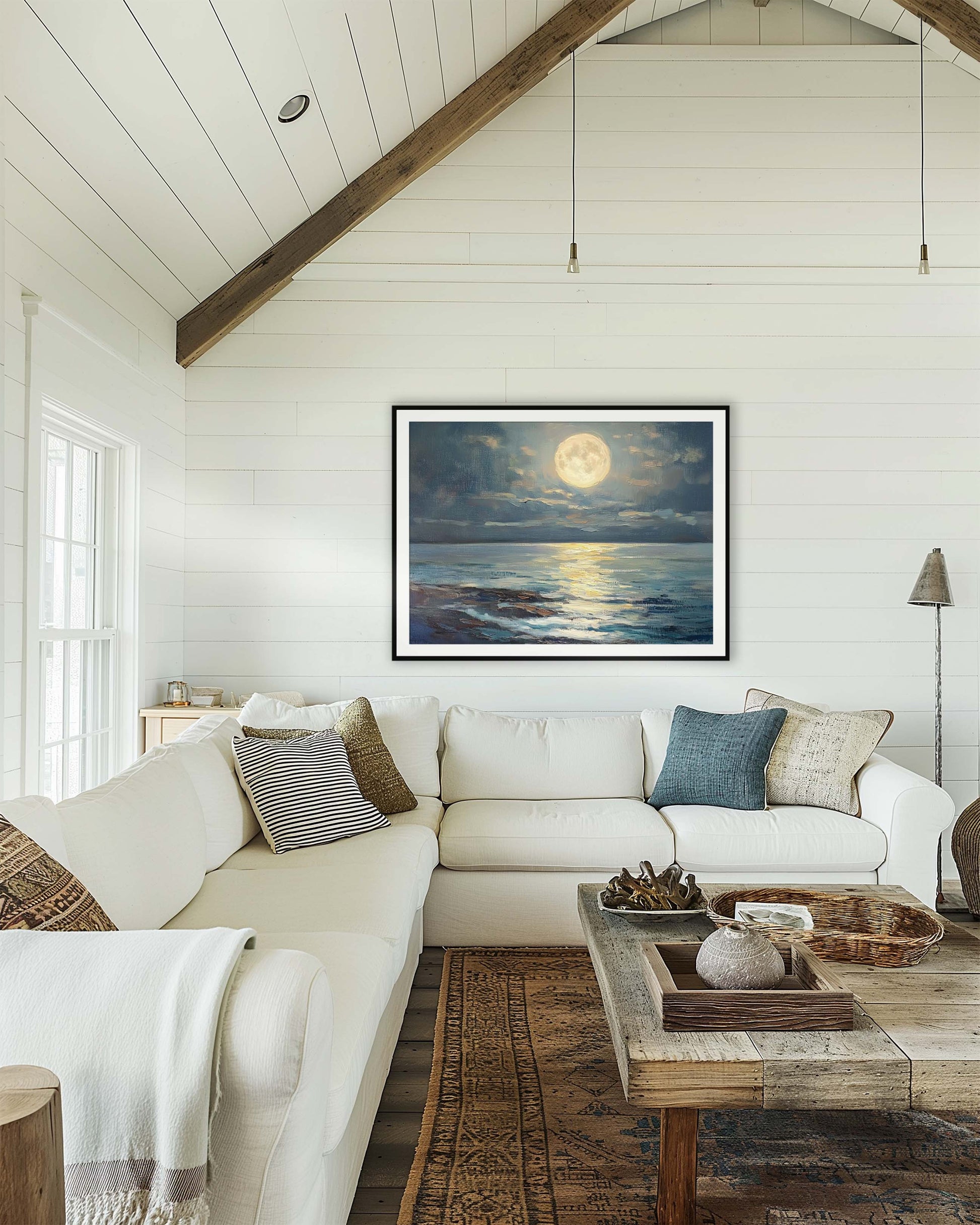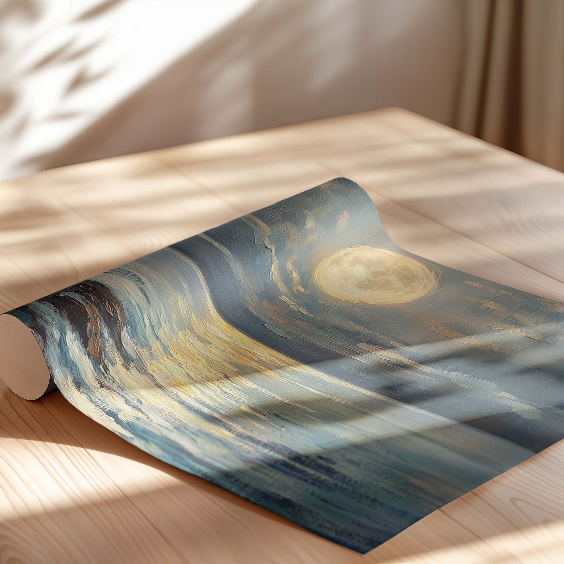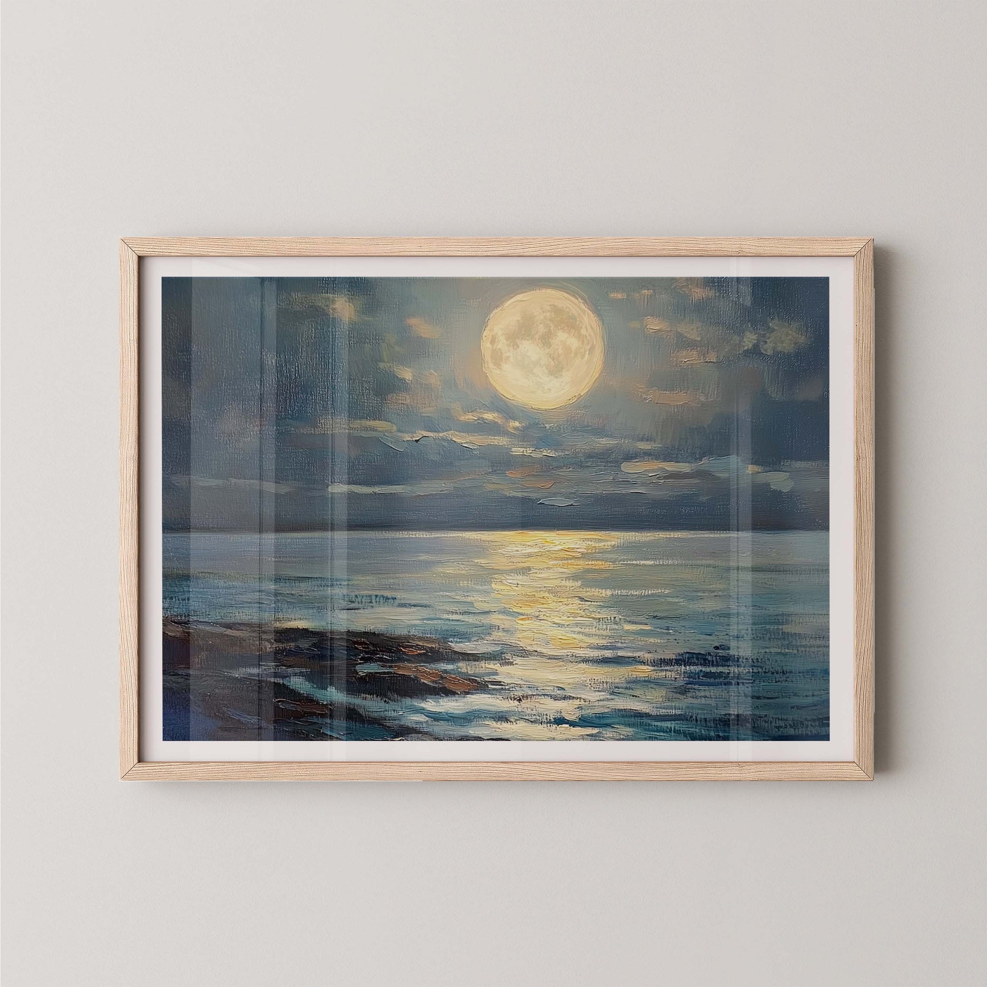 Bask in the glow of midnight magic with "The Moon," a dreamy coastal print inspired by the serenity of moonlight reflecting across the sea. With expressive brushstrokes and rich tonal depth, this piece captures the soft shimmer of the full moon above calm waters—offering a quiet moment of reflection, wonder, and peace.