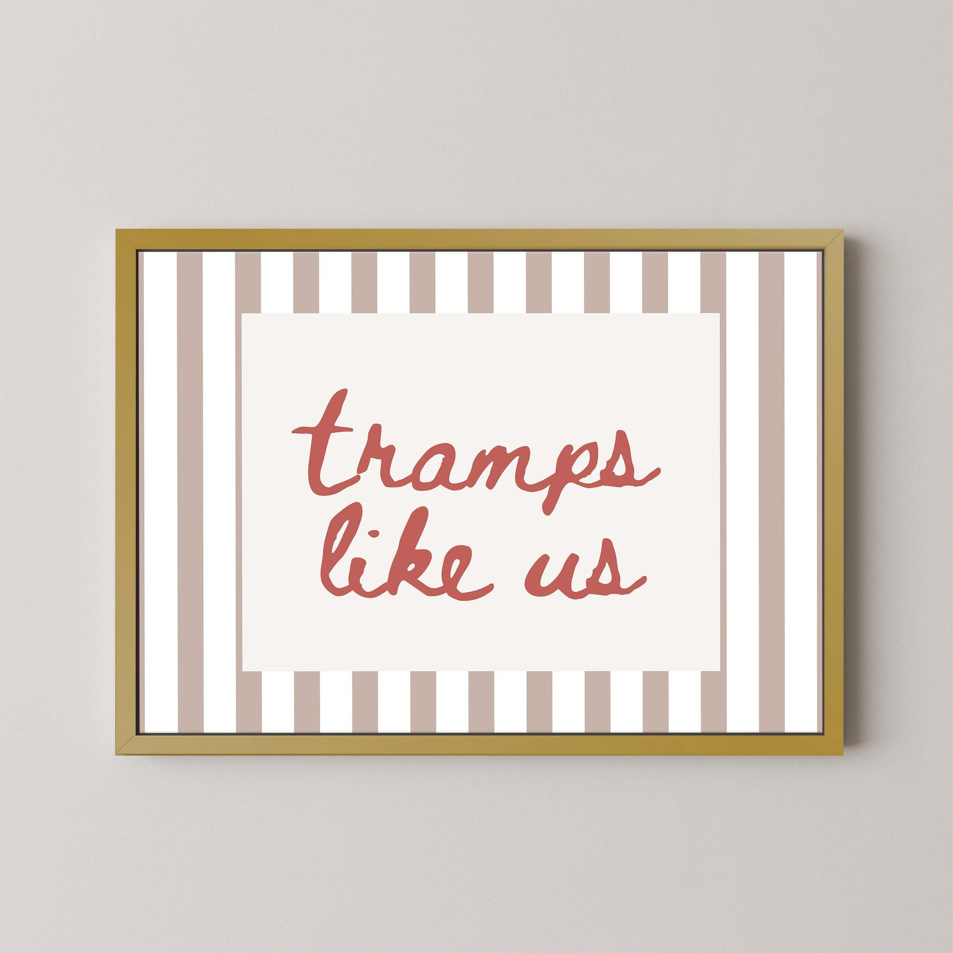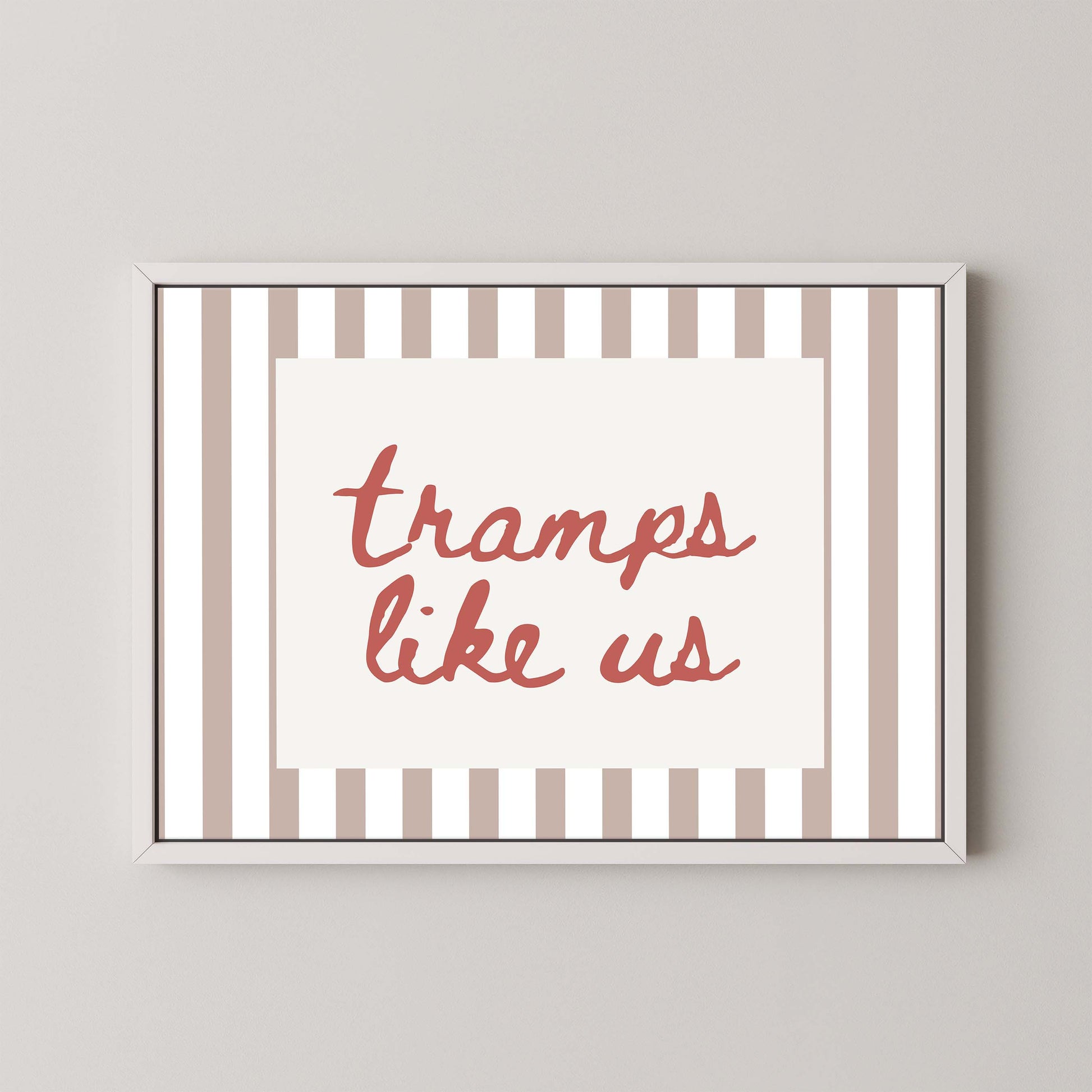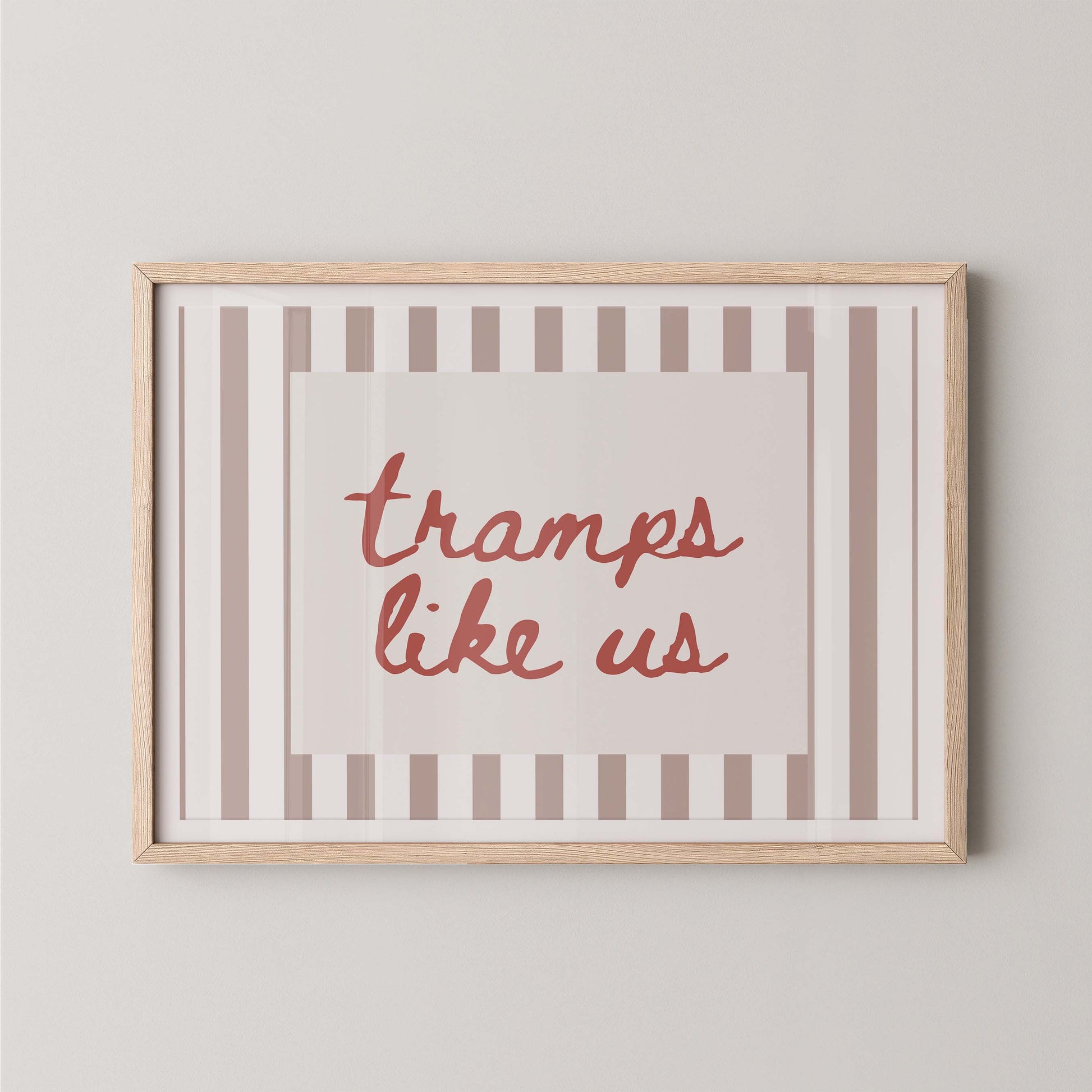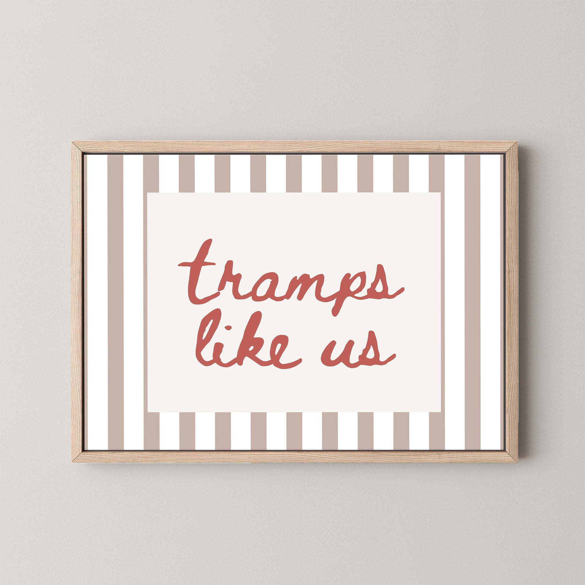 Celebrate timeless rock ‘n’ roll with this iconic Bruce Springsteen-inspired lyric print, featuring the words “Tramps Like Us” from the classic anthem Born to Run. Part of the Song Stripes Collection, this piece brings a modern vintage vibe to any space with its brick red hand-lettered typography and taupe and cream striped background.