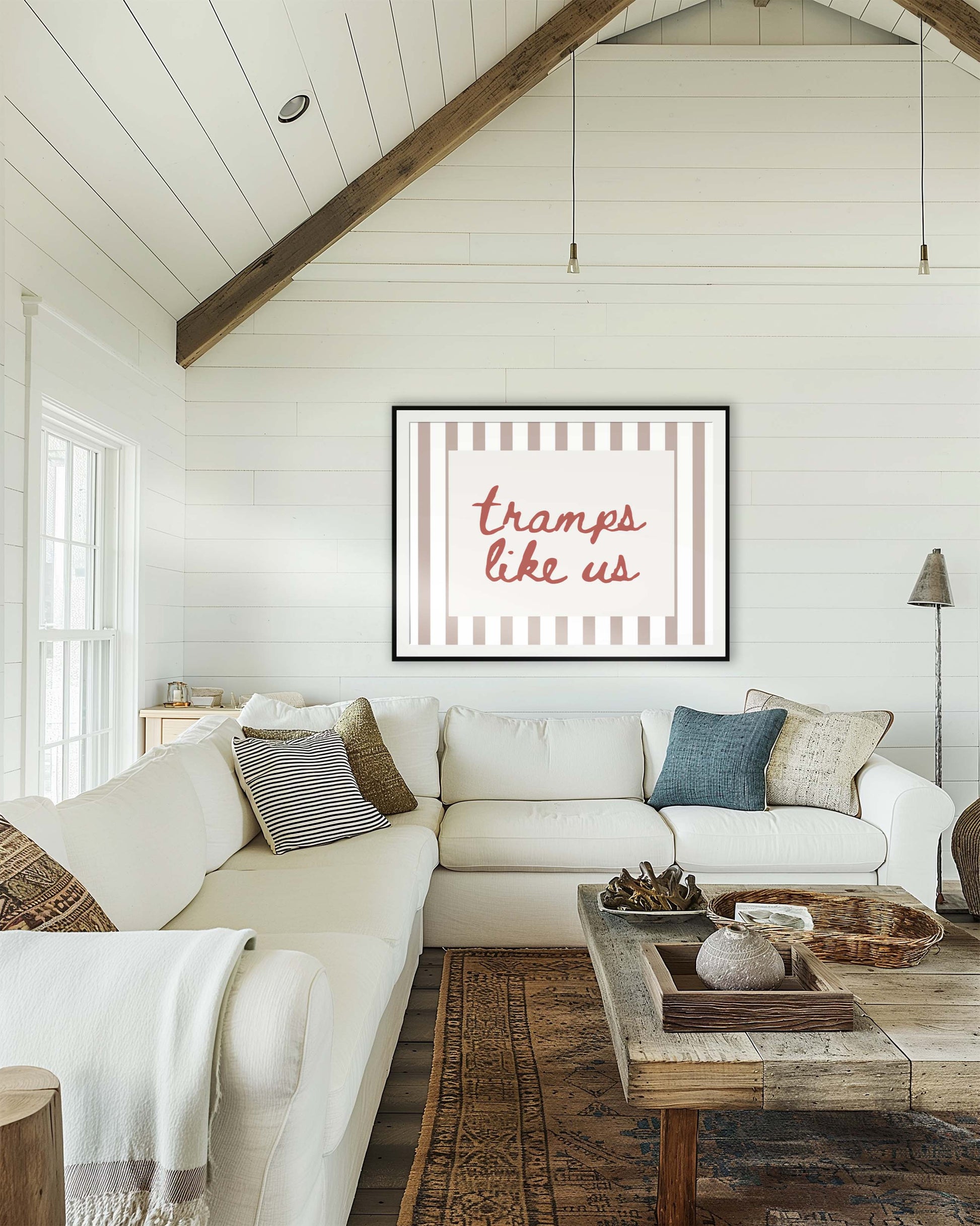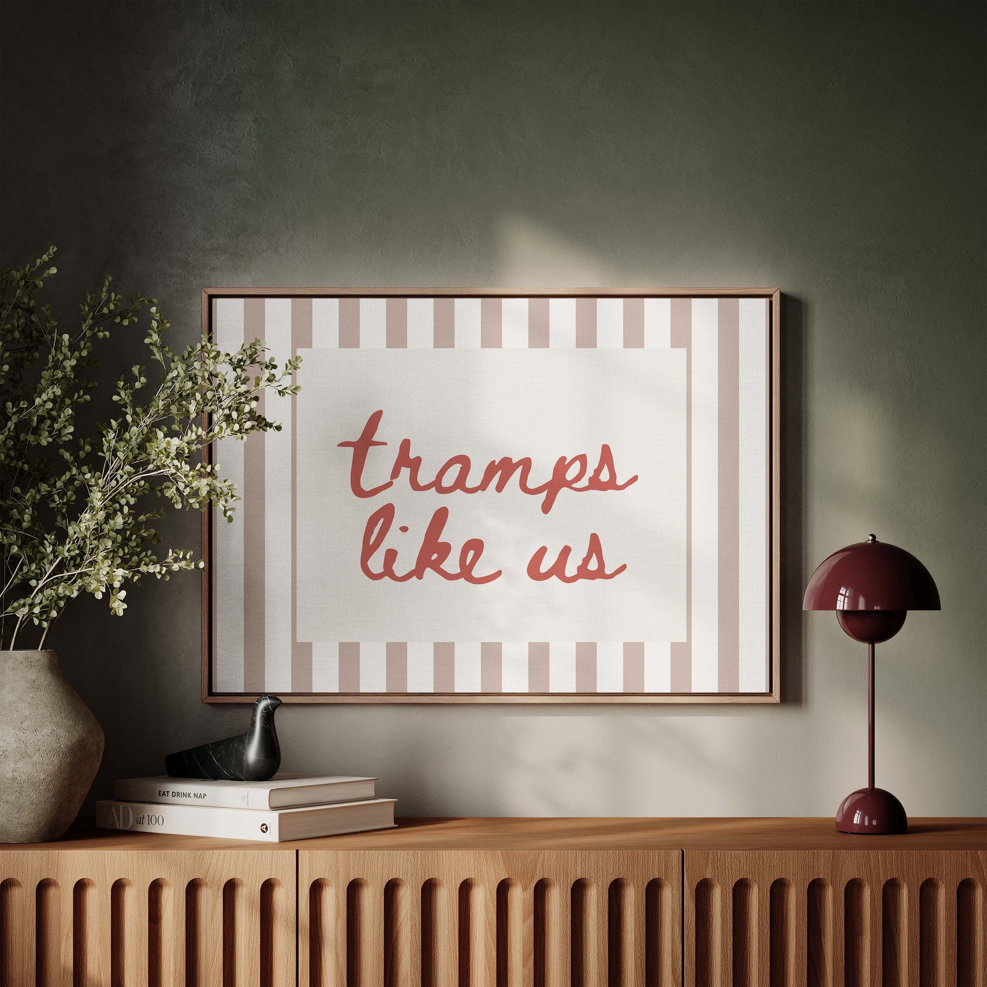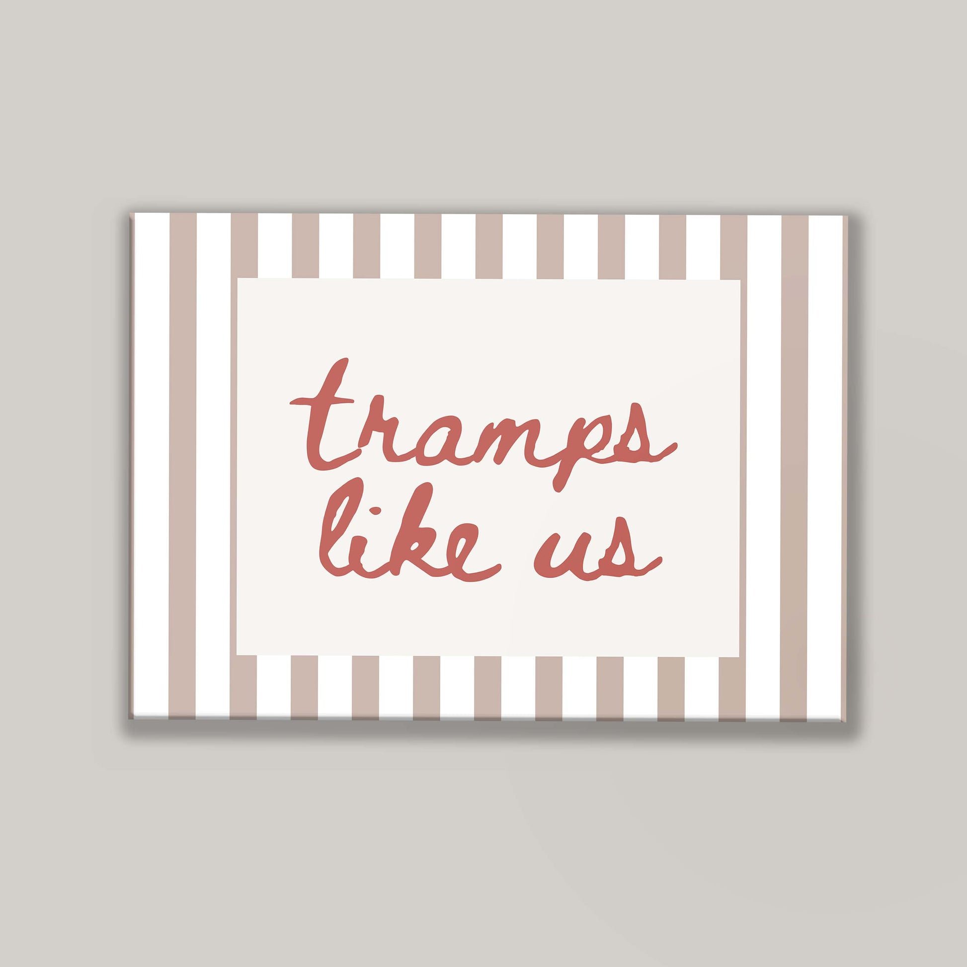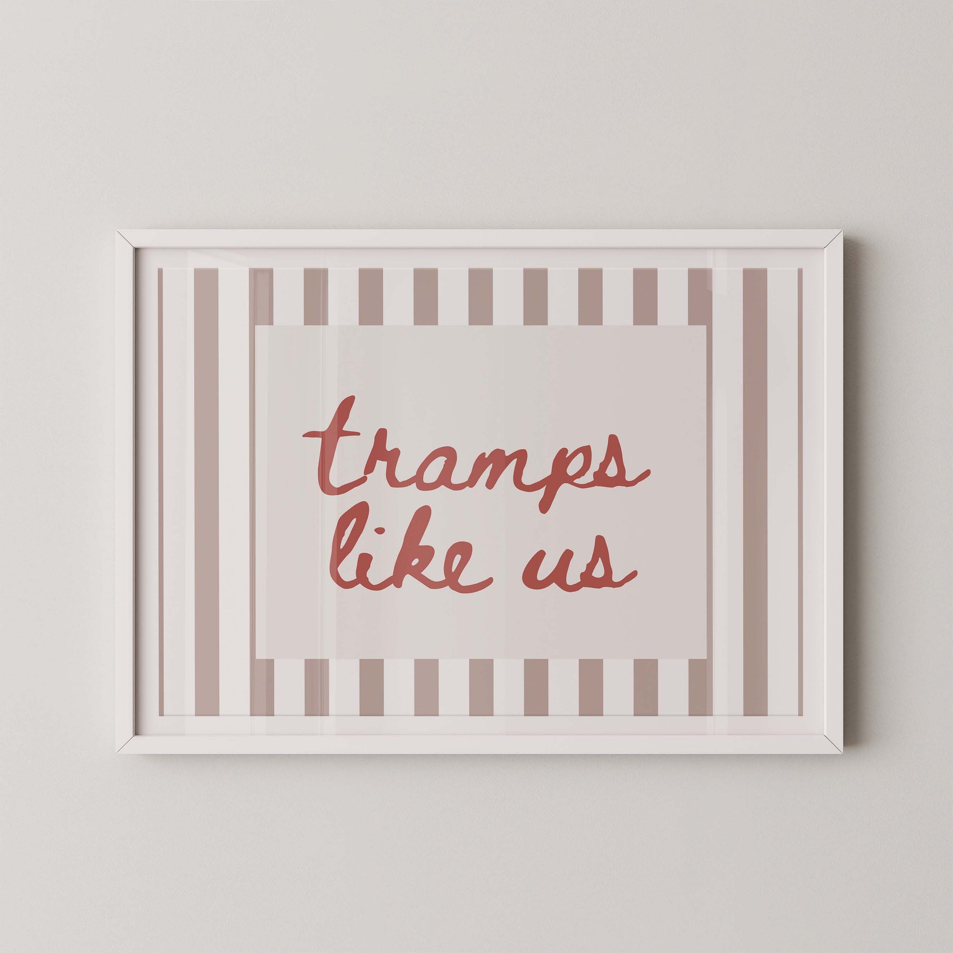 Celebrate timeless rock ‘n’ roll with this iconic Bruce Springsteen-inspired lyric print, featuring the words “Tramps Like Us” from the classic anthem Born to Run. Part of the Song Stripes Collection, this piece brings a modern vintage vibe to any space with its brick red hand-lettered typography and taupe and cream striped background.