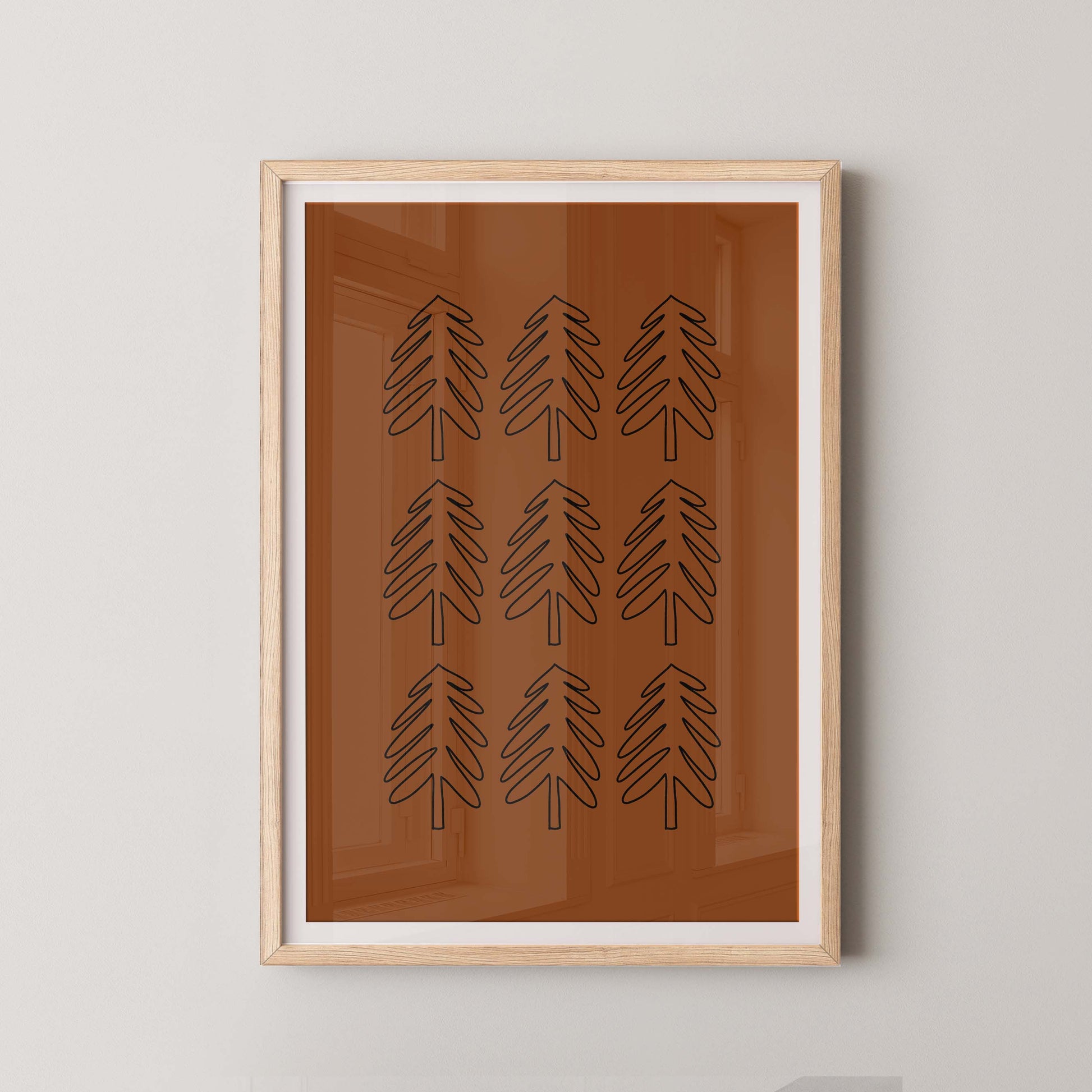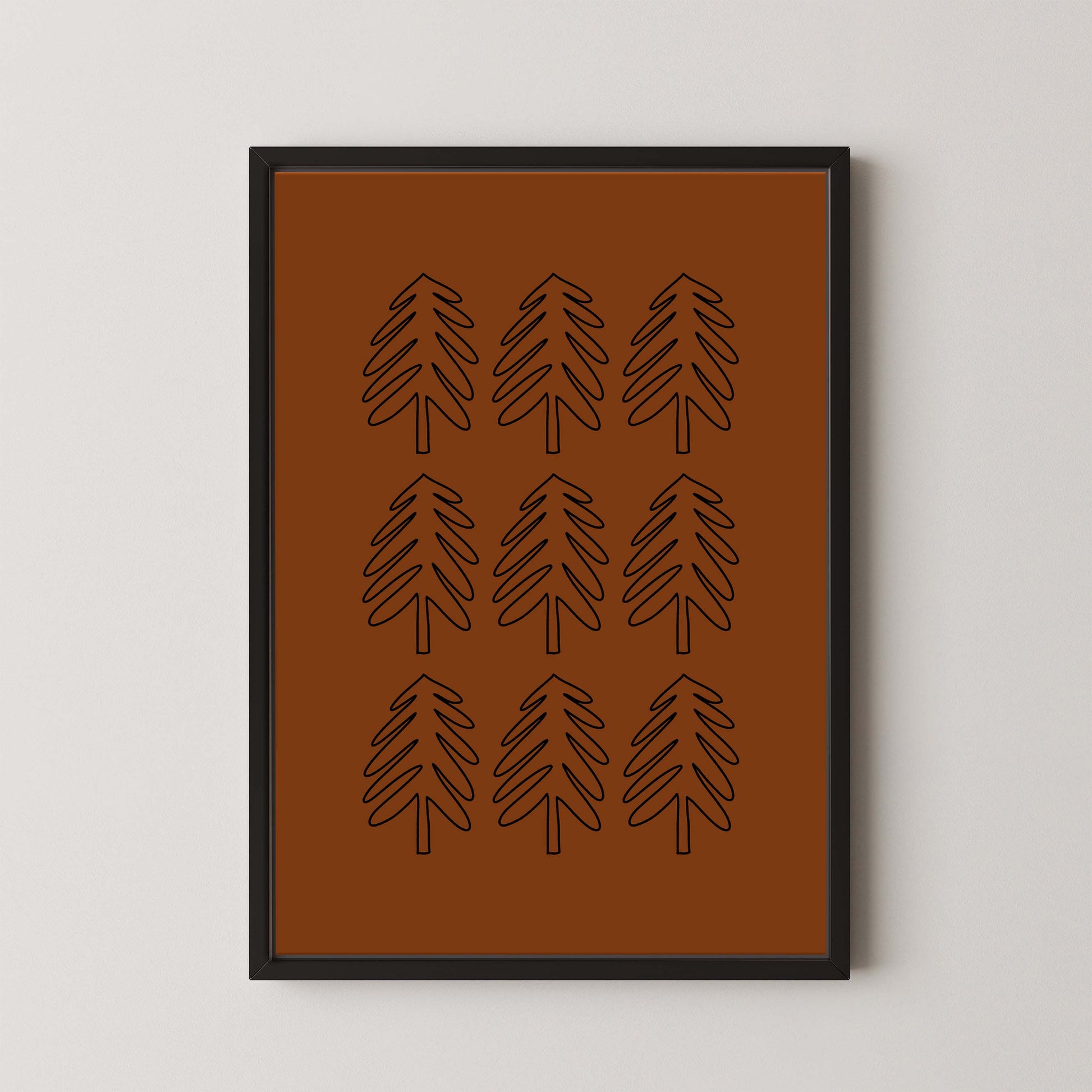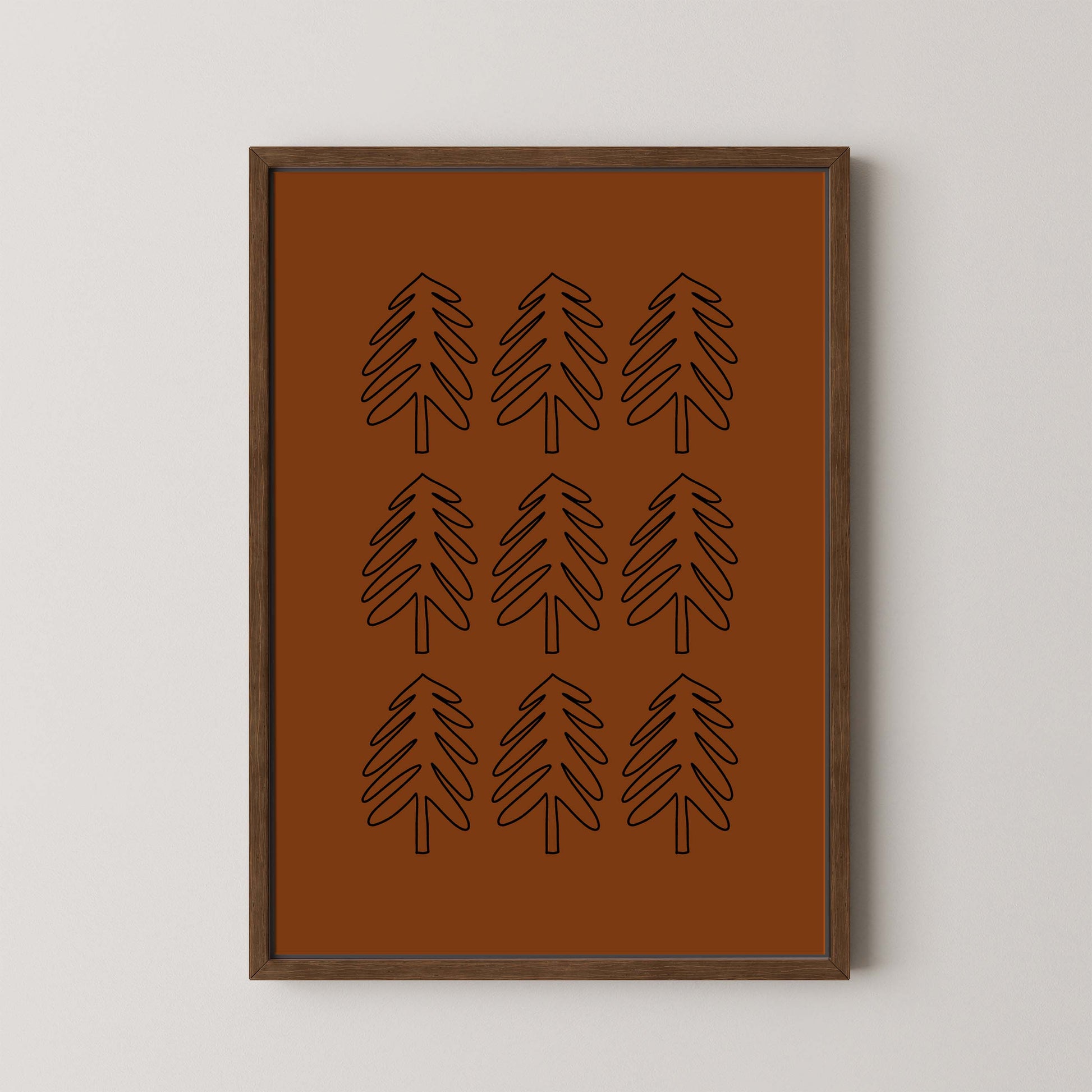 Bring the quiet beauty of the woods into your space with "Treeline," a clean, hand-drawn illustration featuring rows of simple evergreen silhouettes against a rich, earthy backdrop. The warm, rustic palette and minimalist design create a cozy, grounded feeling, perfect for lovers of nature and understated style.