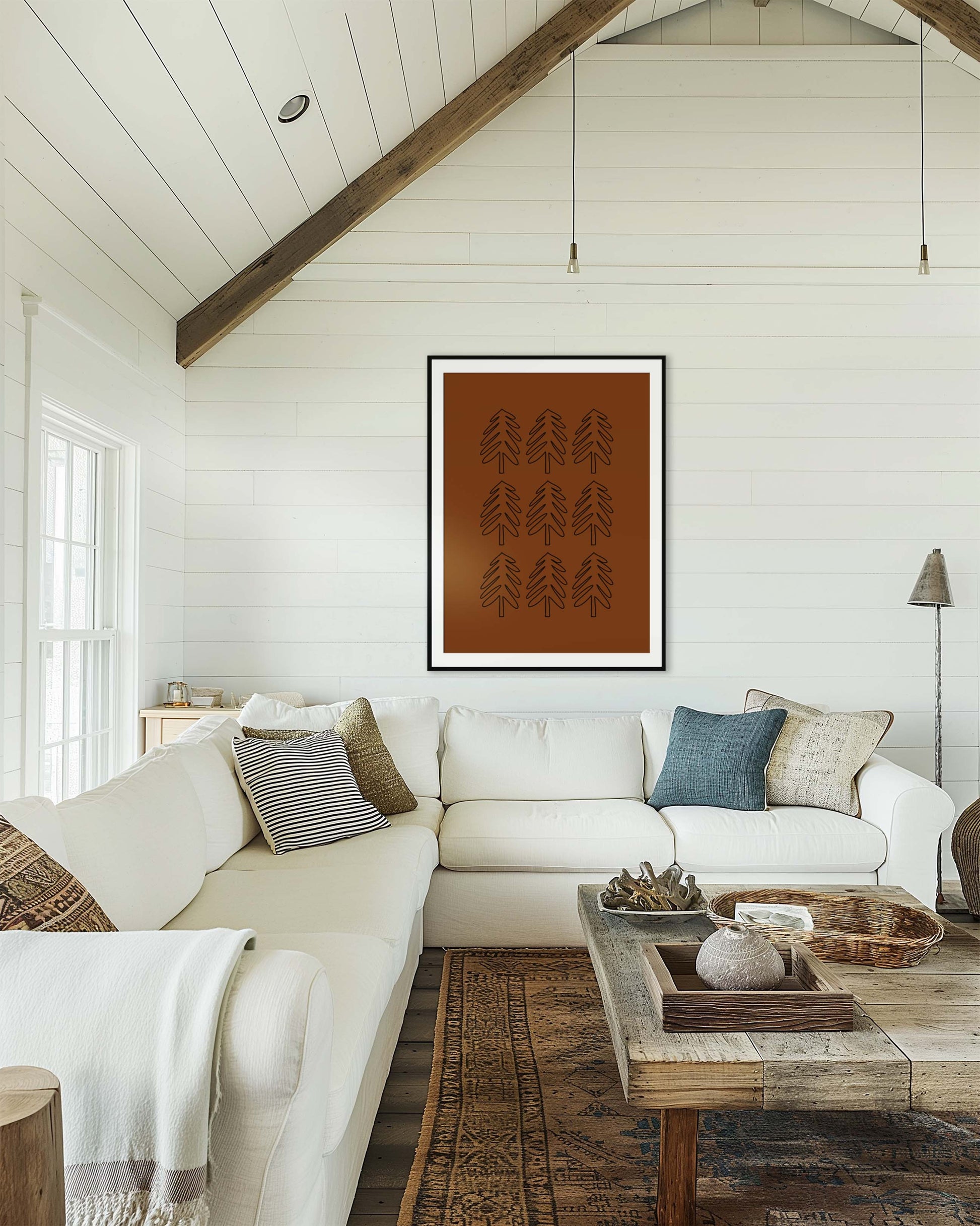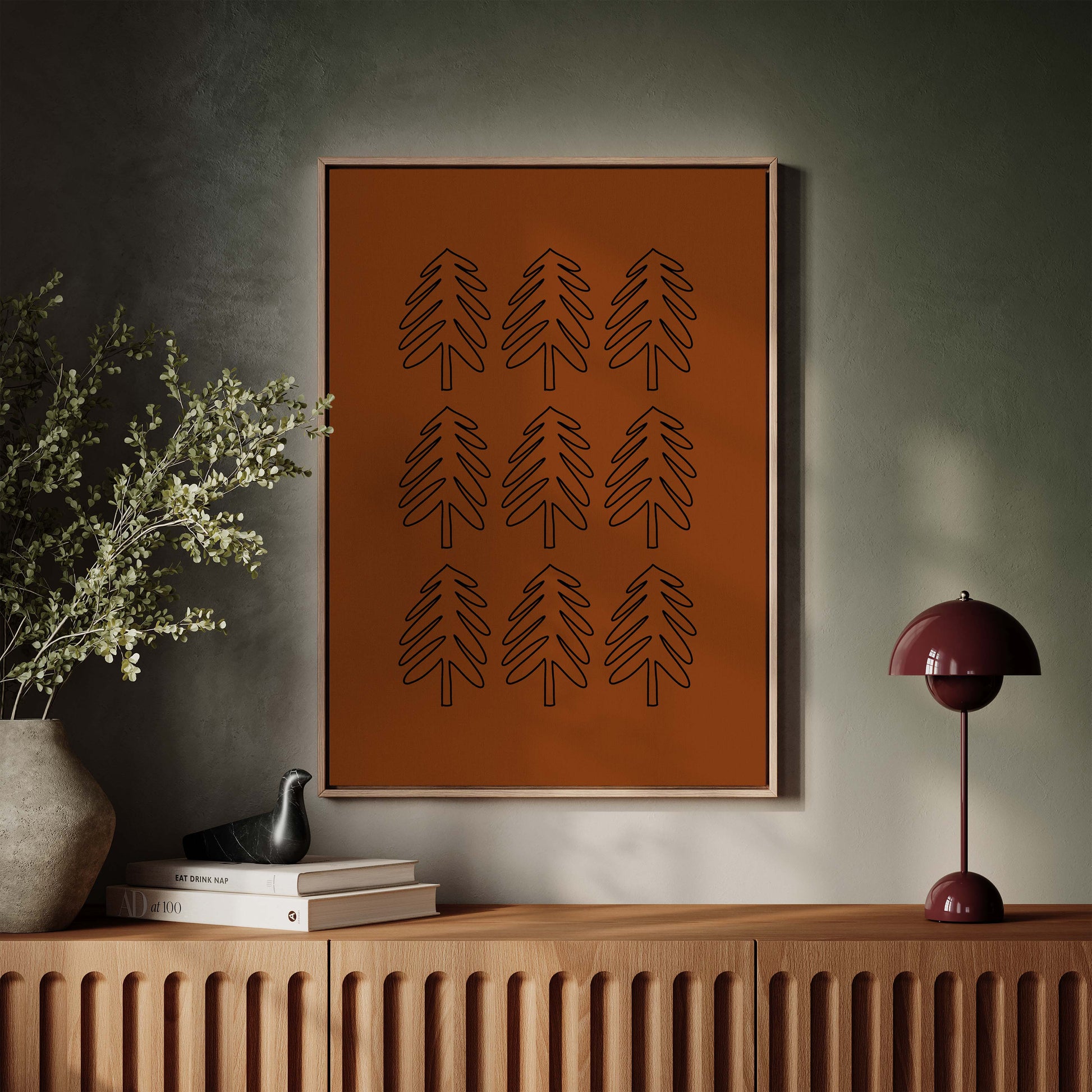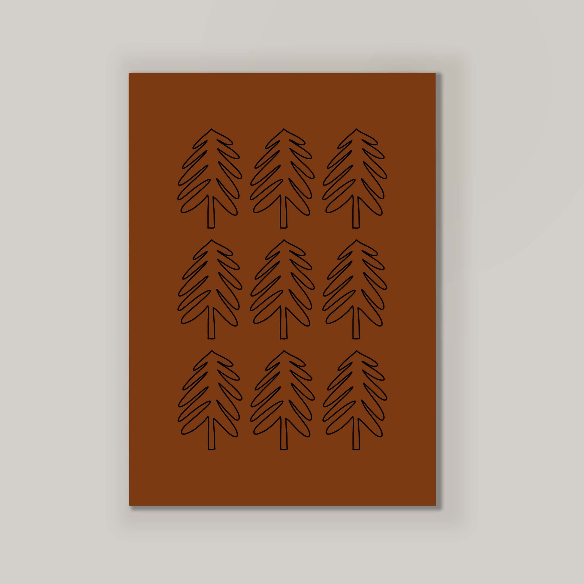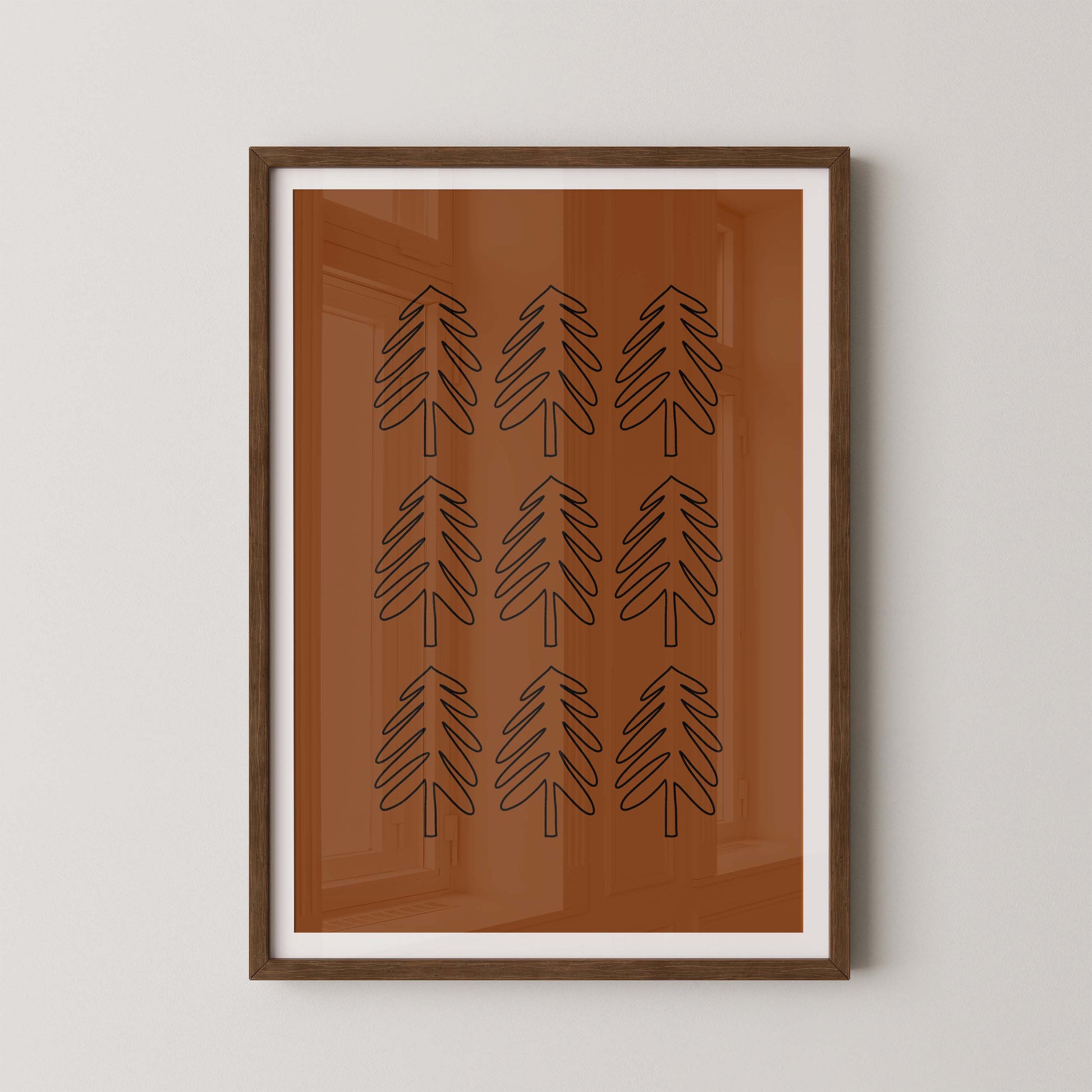 Bring the quiet beauty of the woods into your space with "Treeline," a clean, hand-drawn illustration featuring rows of simple evergreen silhouettes against a rich, earthy backdrop. The warm, rustic palette and minimalist design create a cozy, grounded feeling, perfect for lovers of nature and understated style.