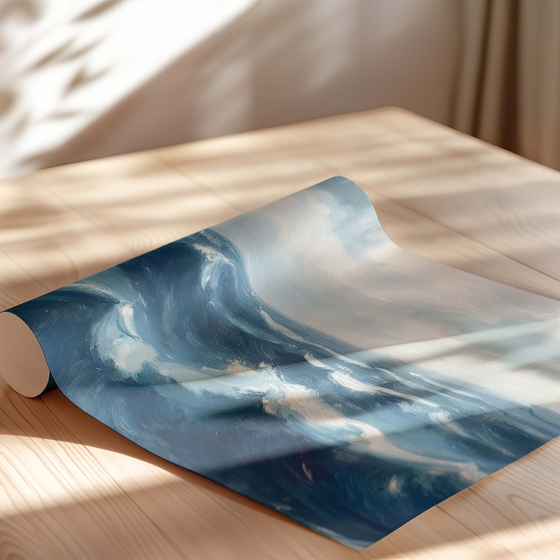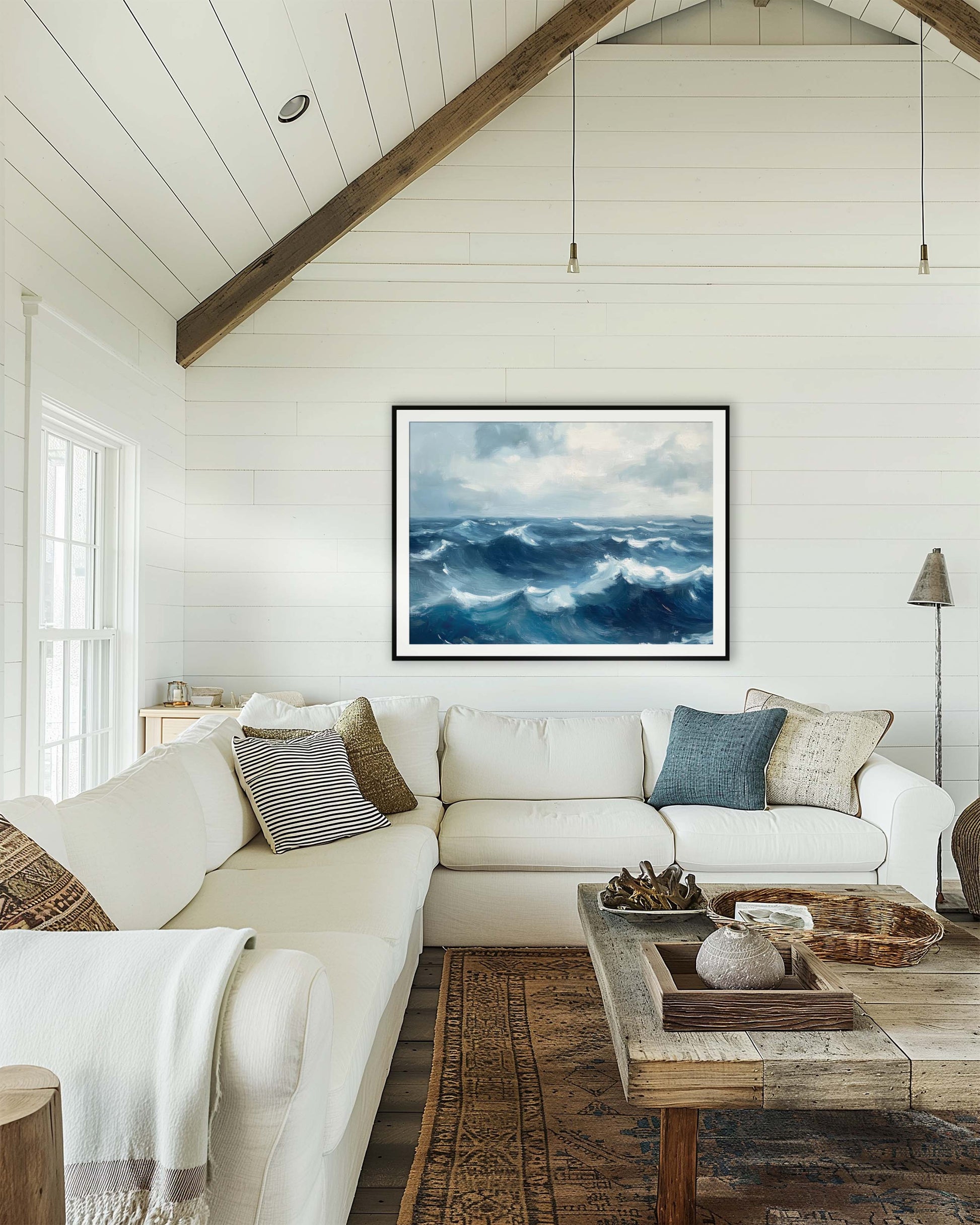 Feel the power of the ocean with "Waves," a deep, moody seascape that captures the energy of rolling tides. With rich blues, stormy grays, and dynamic brushstrokes, this artwork brings a sense of movement and tranquility to any coastal-inspired space.